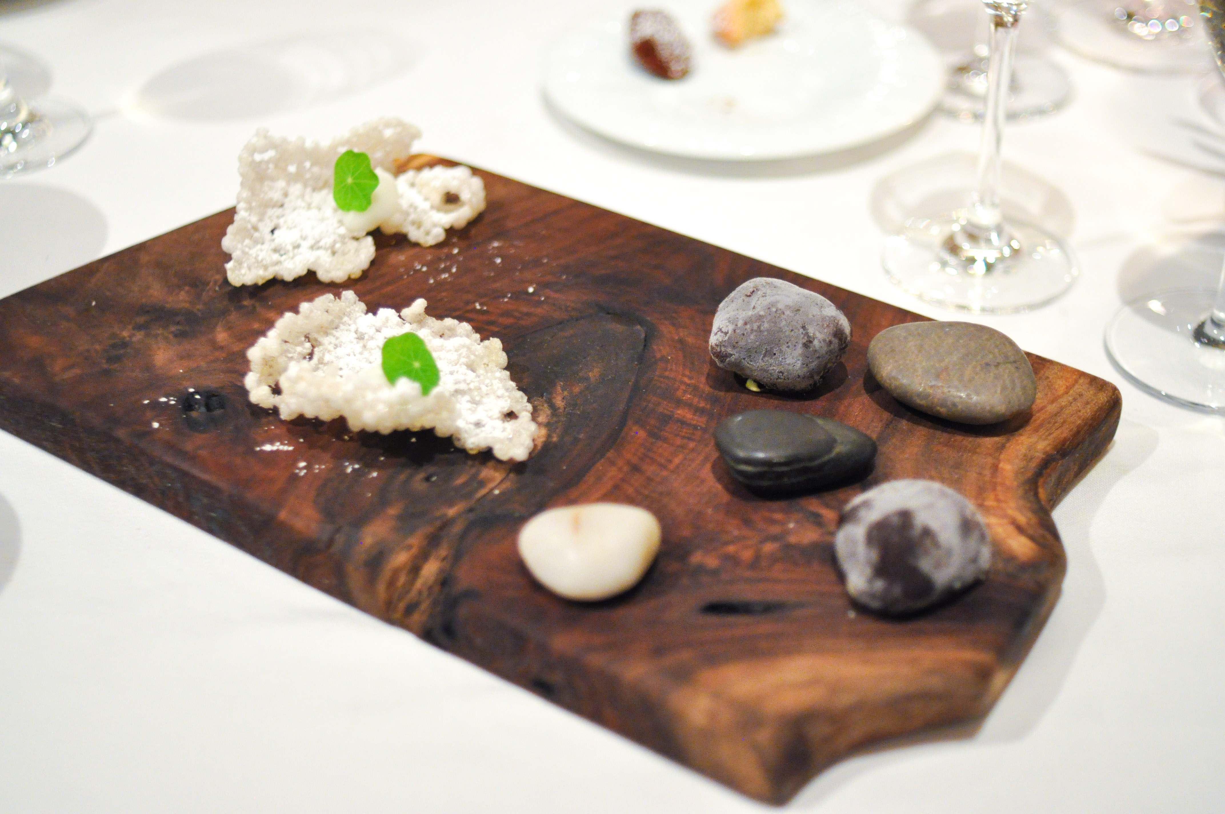 Mignardises. Coconut lime tapioca pudding cracker with nasturtium. Tangy and crunchy. Chocolate mint rock. Coolly minty.