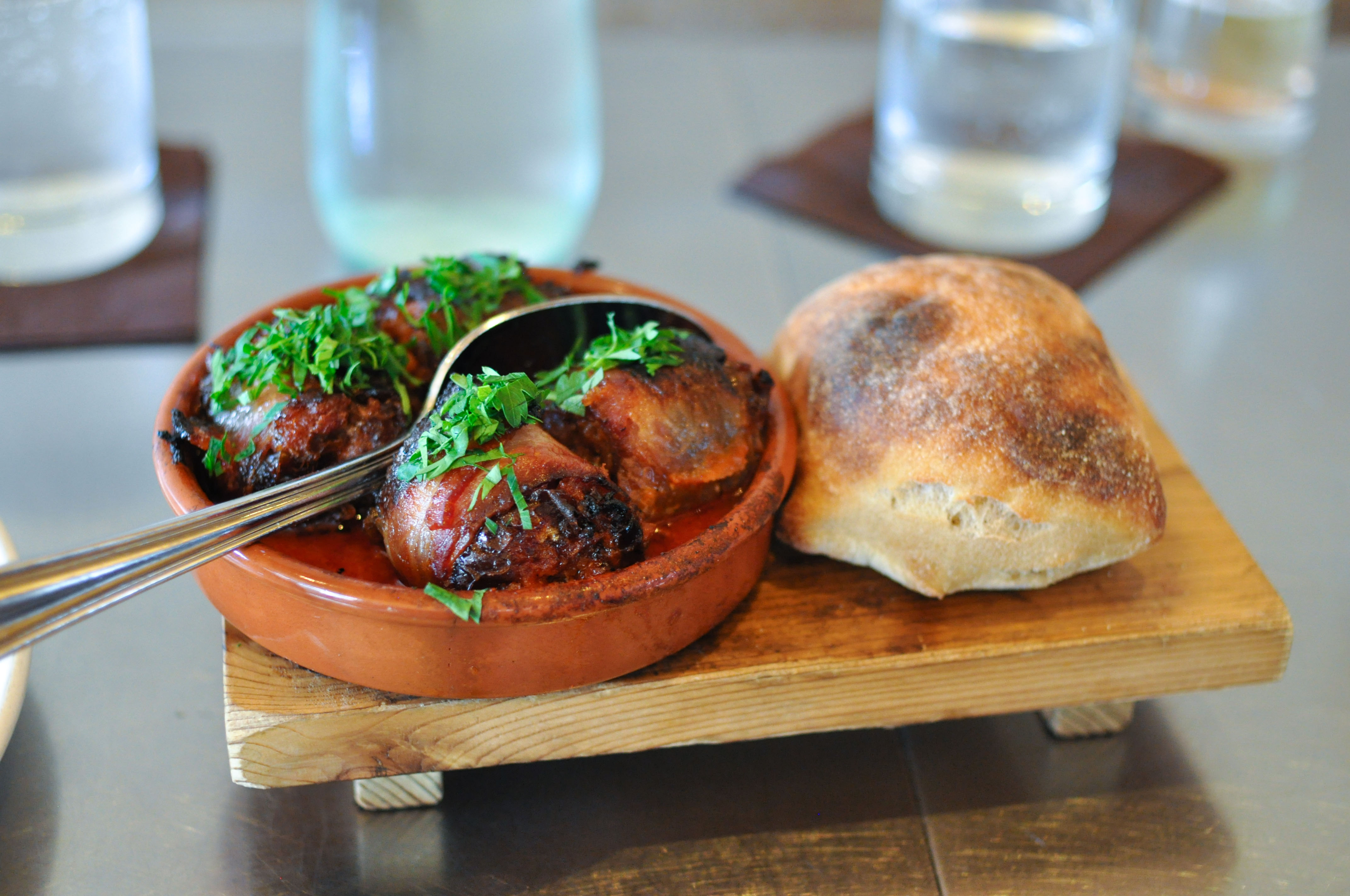 Chorizo-stuffed medjool dates with bacon and piquillo pepper-tomato sauce. Full mouth flavor. Not too spicy. Super rich with balanced sweetness. Served with beautifully light and crusty bread.