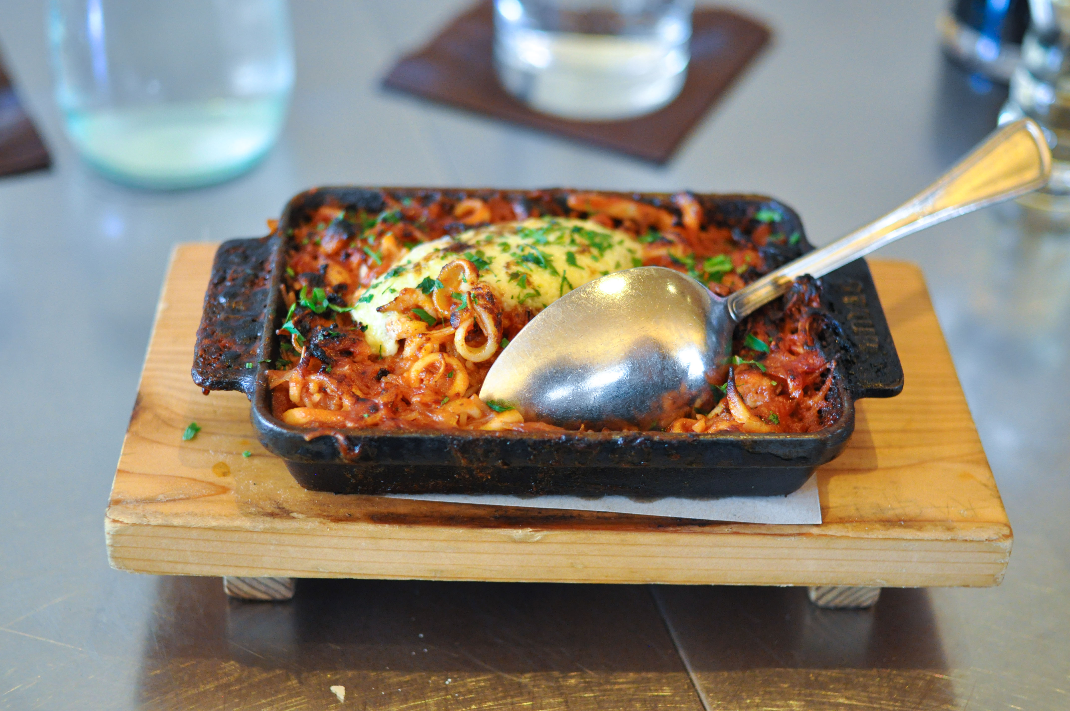 Wood-fired squid amatriciana: san marzano tomatoes, guanciale and fideo with fennel aioli. This was bad ass. Tender squid over thin, short fideo pasta amatriciana baked and barely crusty. The fennel aioli was fun for a slight cooling against the spice, but I preferred it without.