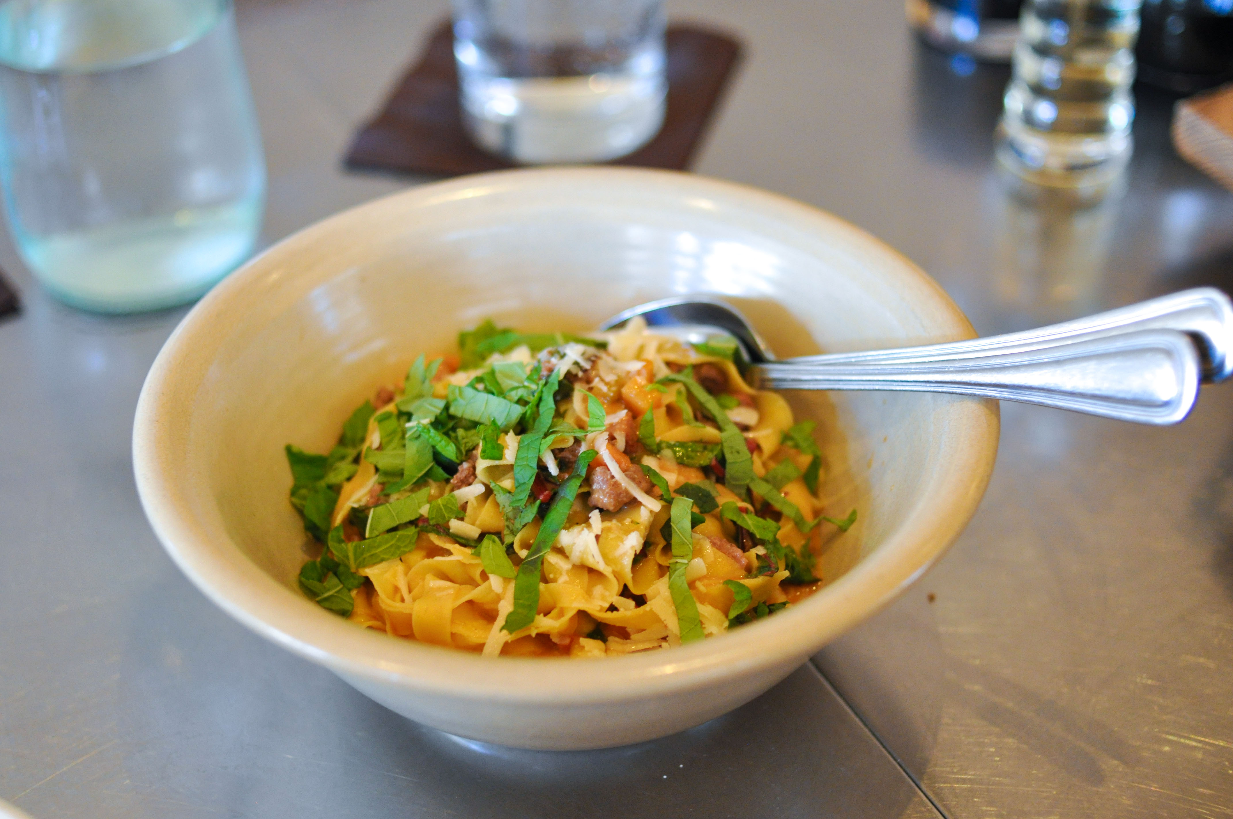 Lamb bolognese with hand-cut tajarin, swiss chard, mint and pecorino romano. I prefer tajarin to be sheeted a little thicker for a more dense bite, but the broad thin noodle did well with the oily lamb sauce. The swiss chard tossed in was fantastic.