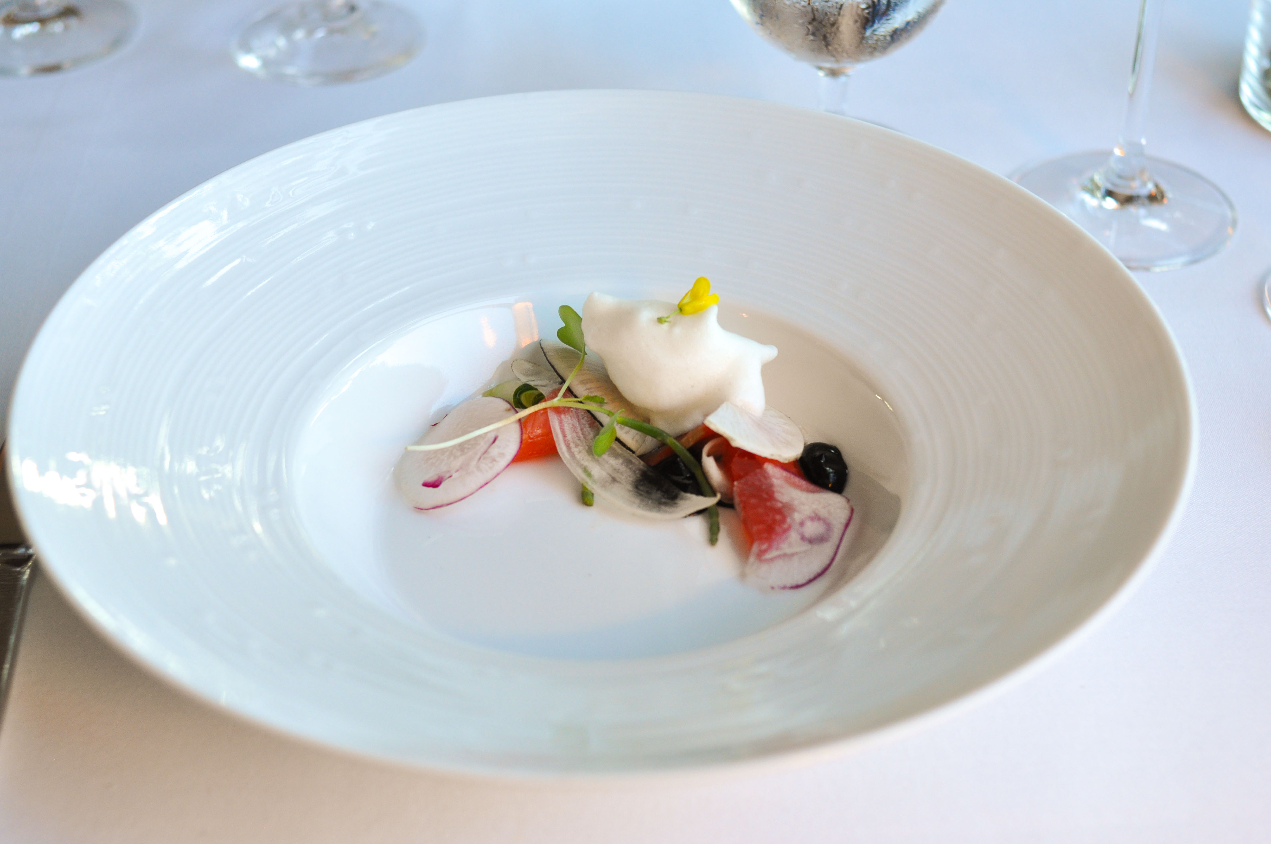 Radish – salmon / kombu / black garlic. Radish slices with cured salmon, black garlic, cucumber, compressed watermelon, salicornia, and suds from kombu stock. The sweet watermelon, salty fish, fresh cucumber, and oceanic suds were nice compliments to the spicy radish.