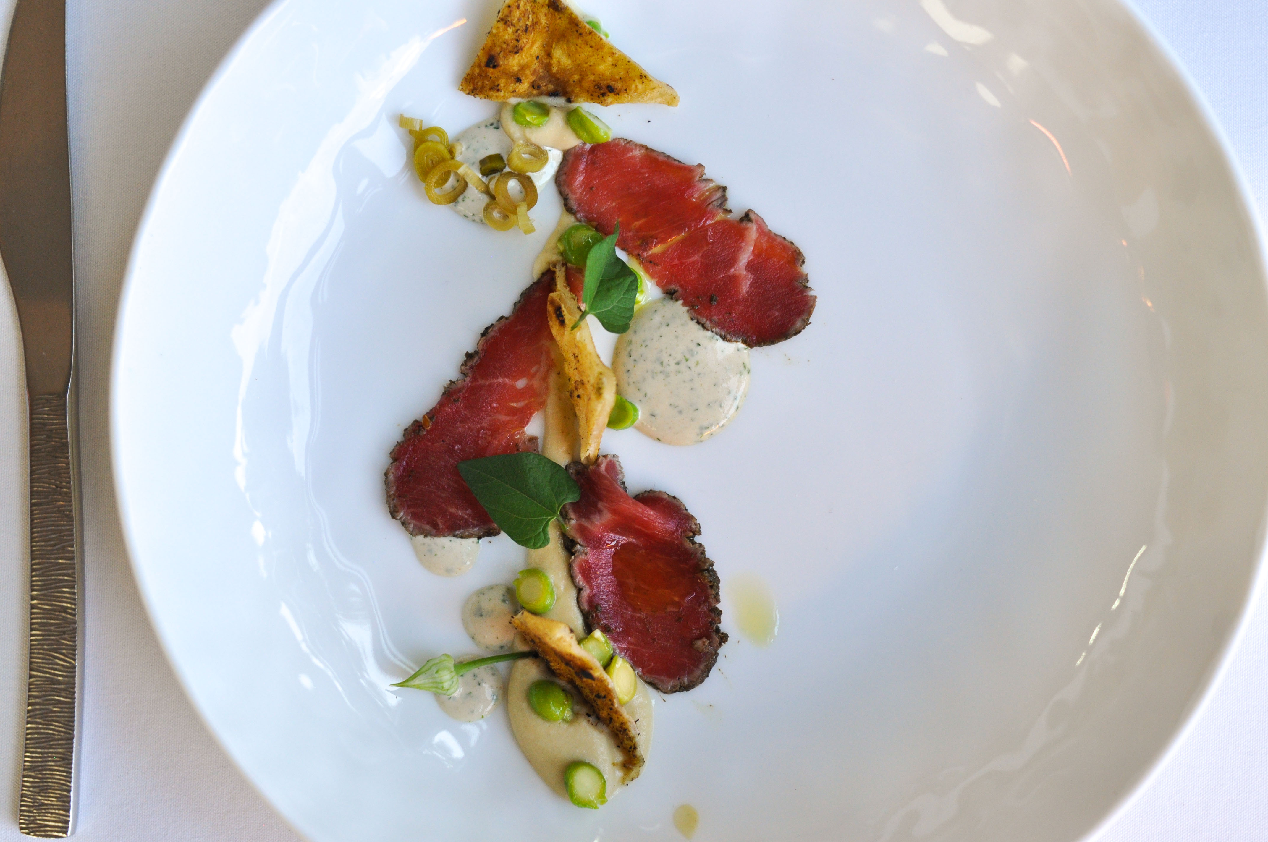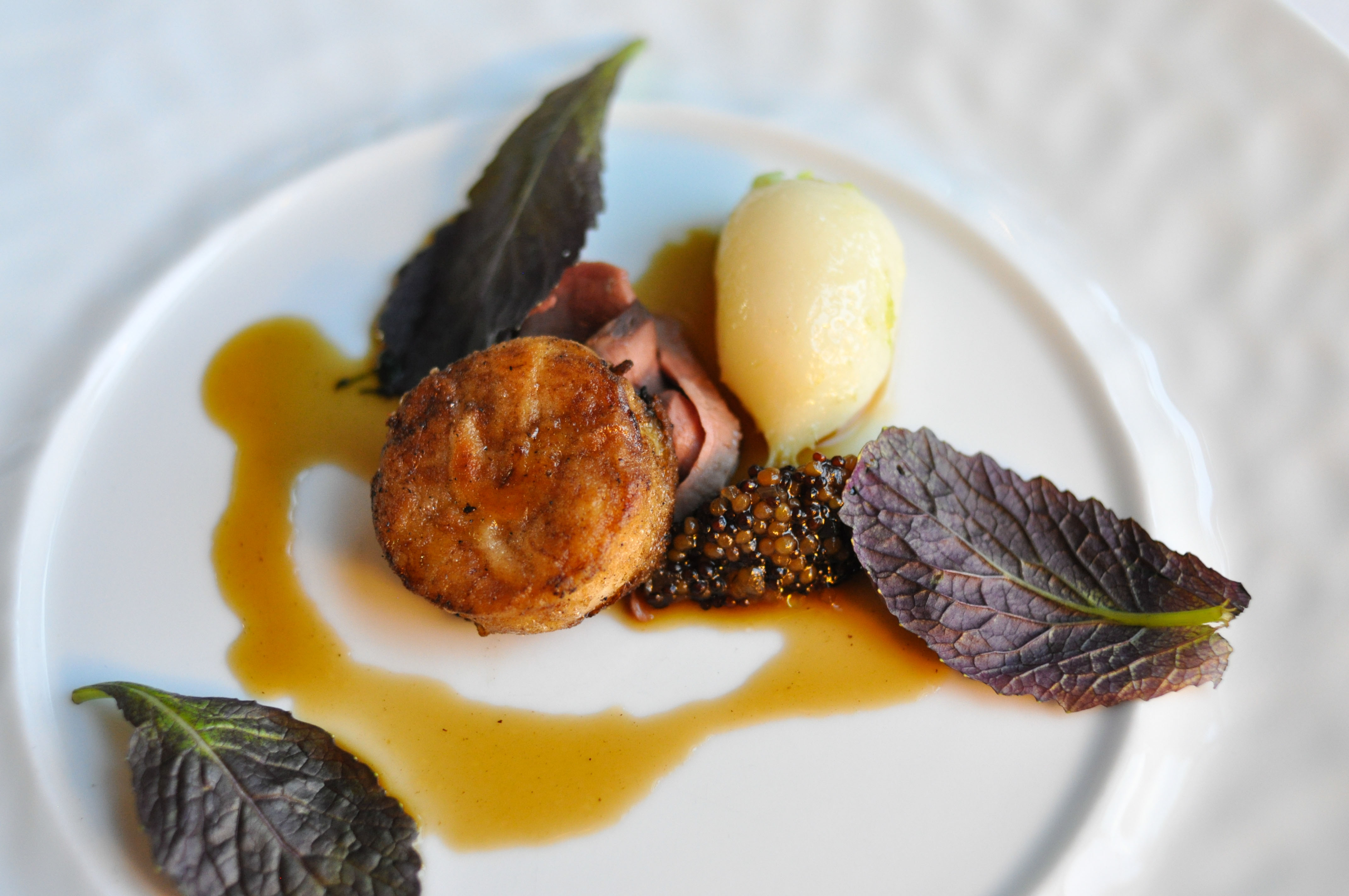 Lamb – hummus / tahini / pine nuts. Seared za’atar lamb, hummus, fresh garbanzo, smoked & pickled green garlic, tahini, pine nut, bean leaf, and za’atar toast. Cool stuff. Like a refined, deconstructed gyro.