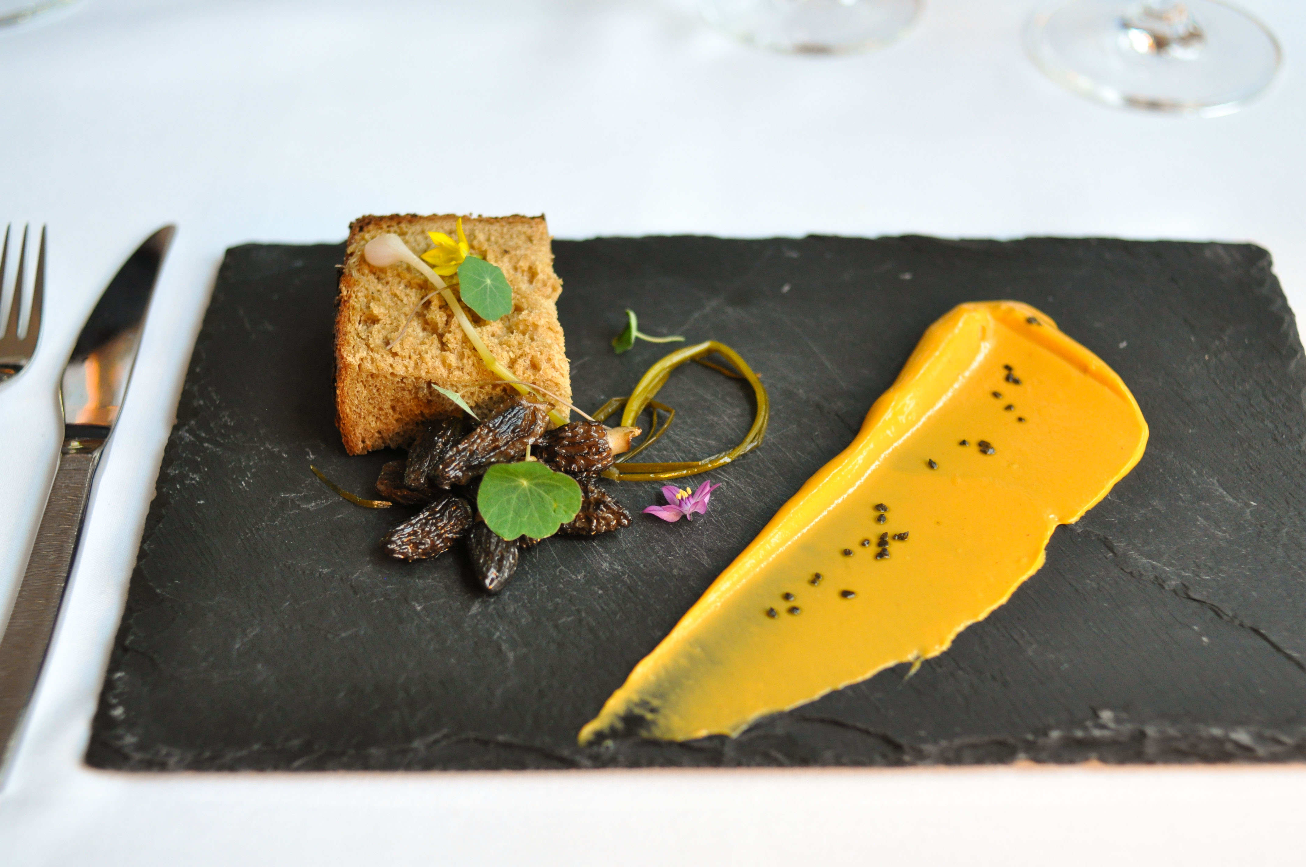 Bread – uni / morels / nasturtium. I think I have this right…bread made with a mix of three starters: morel, gooseberry, and pumpernickel, with sour brown ale and a little whole wheat flour. Accompanied with delightful small morels, decadent uni butter, peppery nasturtium, and pickled wild spring onion. A lot of love on a piece of slate.