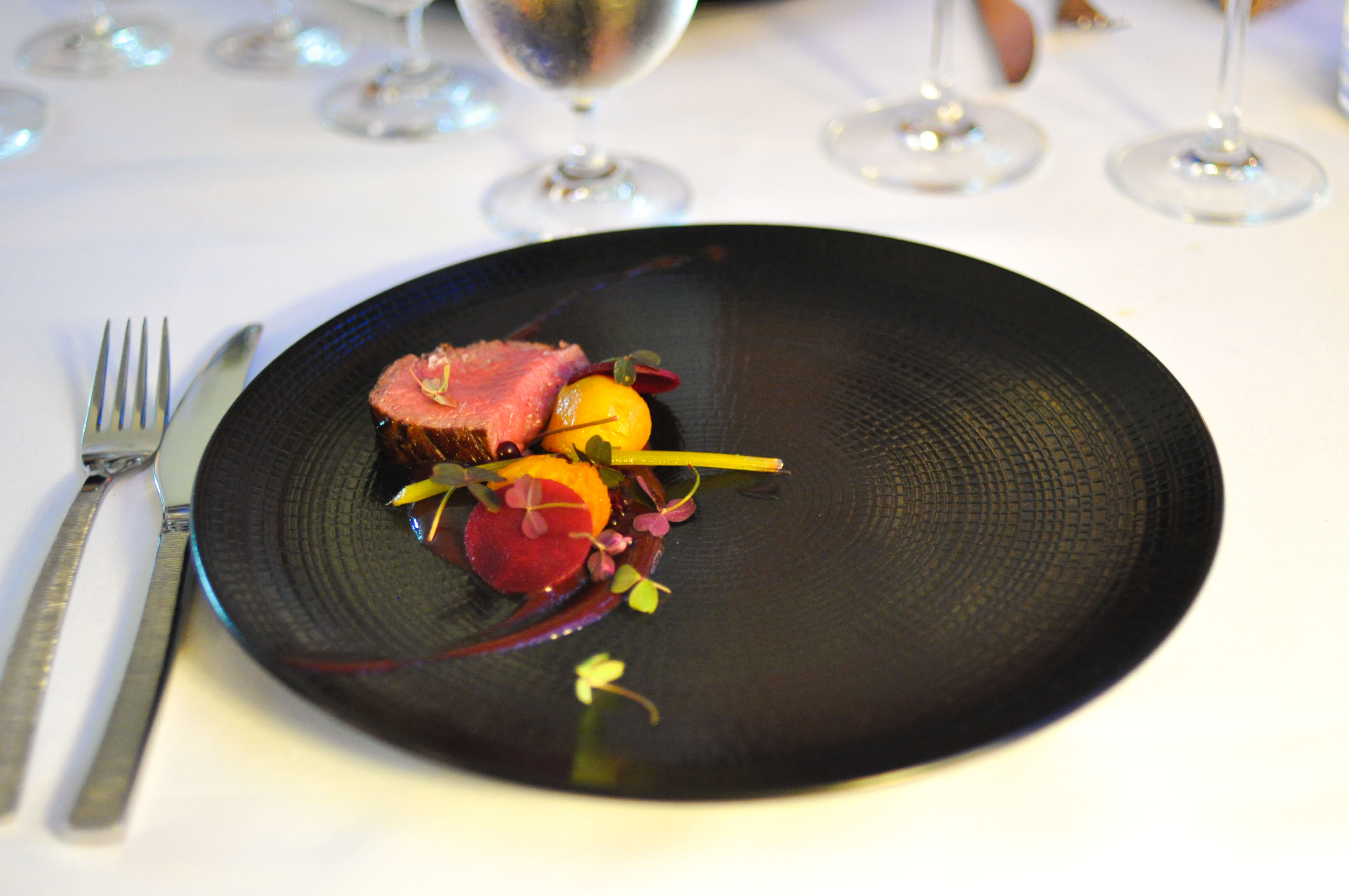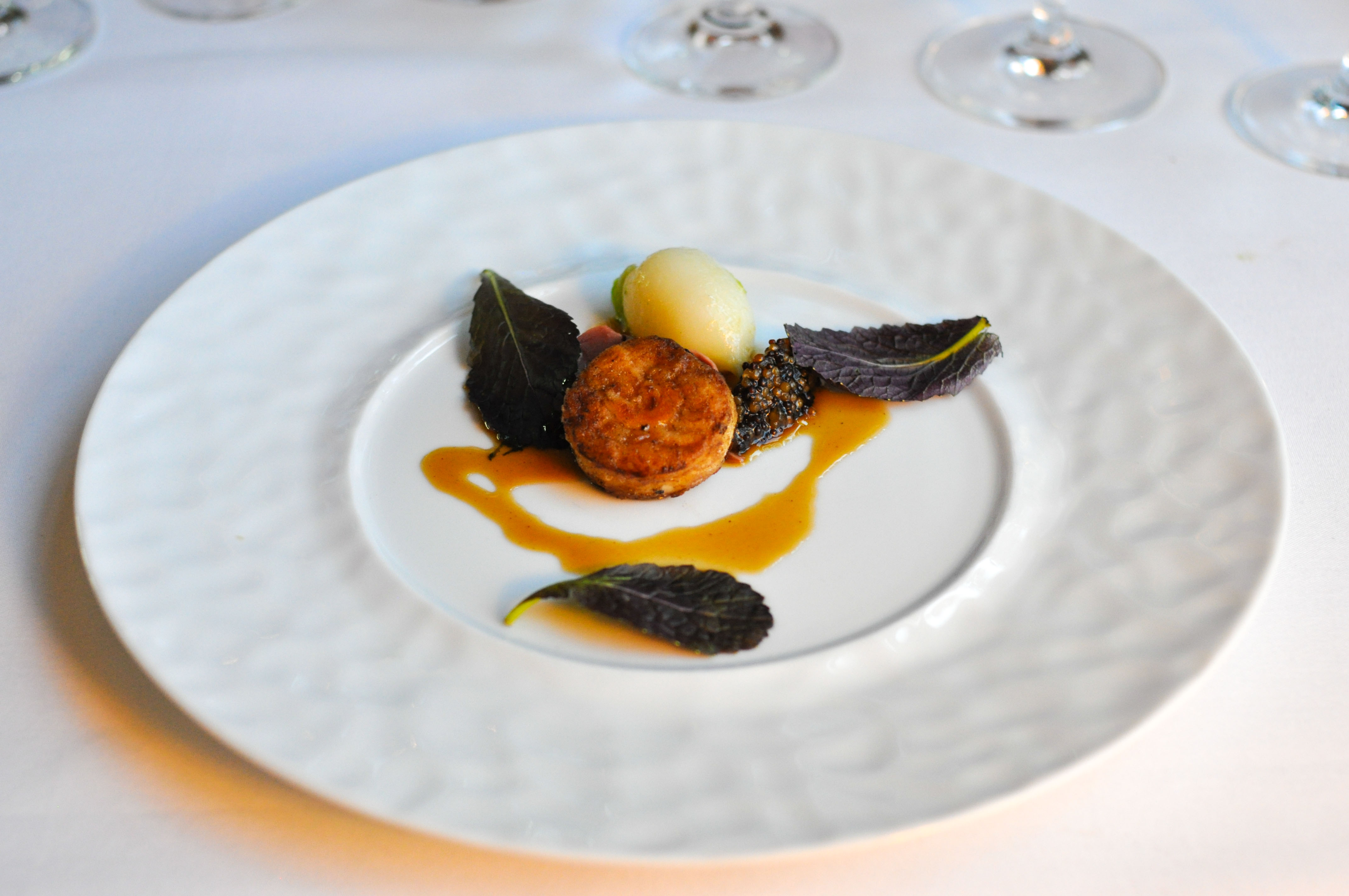 Skate – calf heart / turnip / onion. Six years ago in Overland Park, KS I had a skate dish I really liked. Two years later on the UWS I had another skate plate that was superb. Aside from those two events, ray consumption in my life has been a downward spiral of bland, mushy mediocrity. This course however was very nice. The wing was prepared into a roulade with an almost crisp, caramelized skin and served with calf heart, 24 hour sous vide turnip, red mustard greens, mustard seeds, and onion jus. The skate was really nice with 2011 Ostertag Riesling, while the heart combined with the sweet duo of mustard and onion was beautiful with 1996 d’Yquem(a multiple beverage blessing).