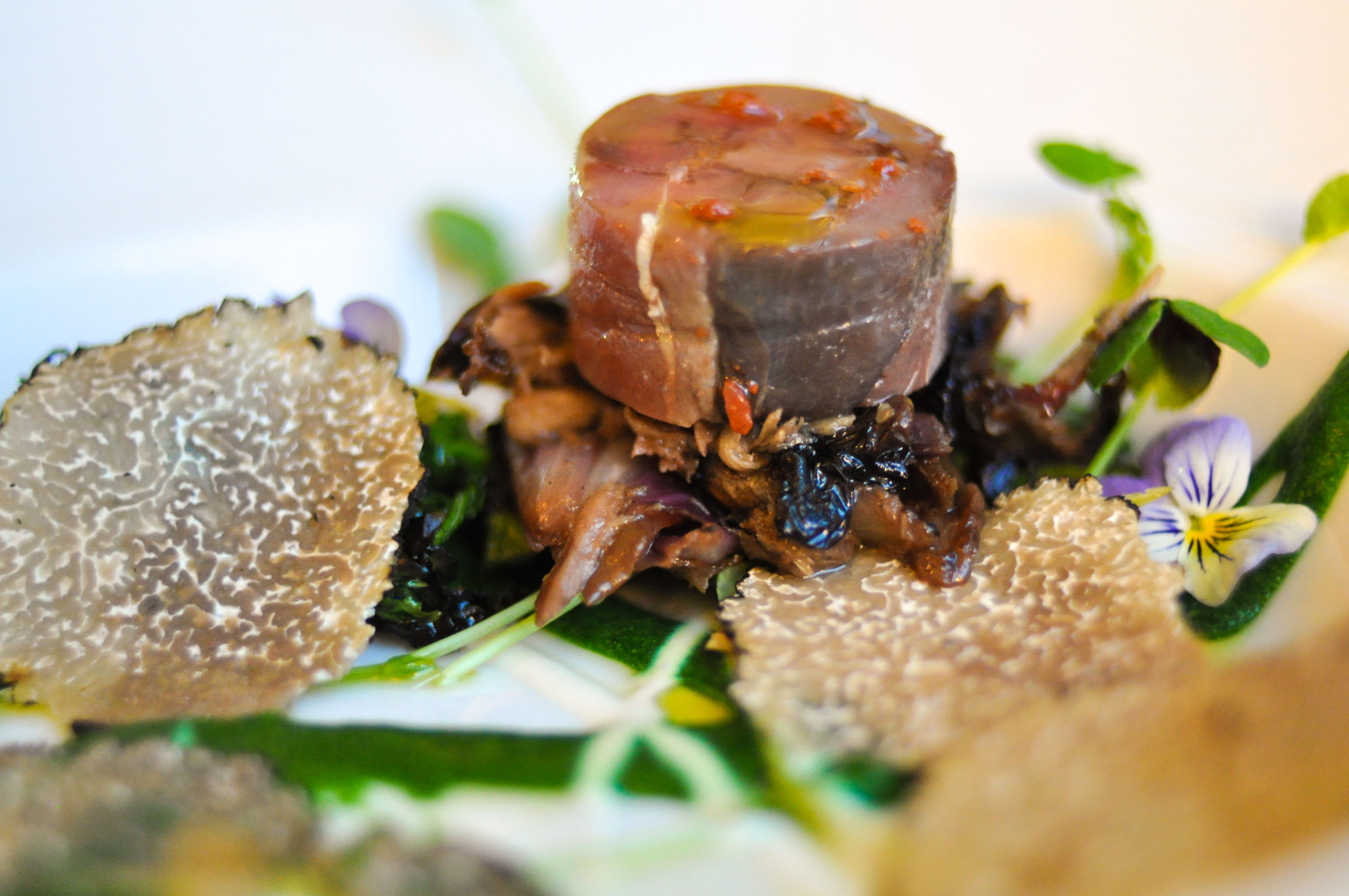Grouse – rapini / angelica / summer truffle. Scotland Grouse roulade with confit leg, angelica, lamb’s quarter puree, rapini, and summer truffle. That was a gamey bird, in the best way. Put together with some great vegetal astringency, leafy bitterness, and dirty earth tones. This plate was covered with raw, masculine, sex appeal.