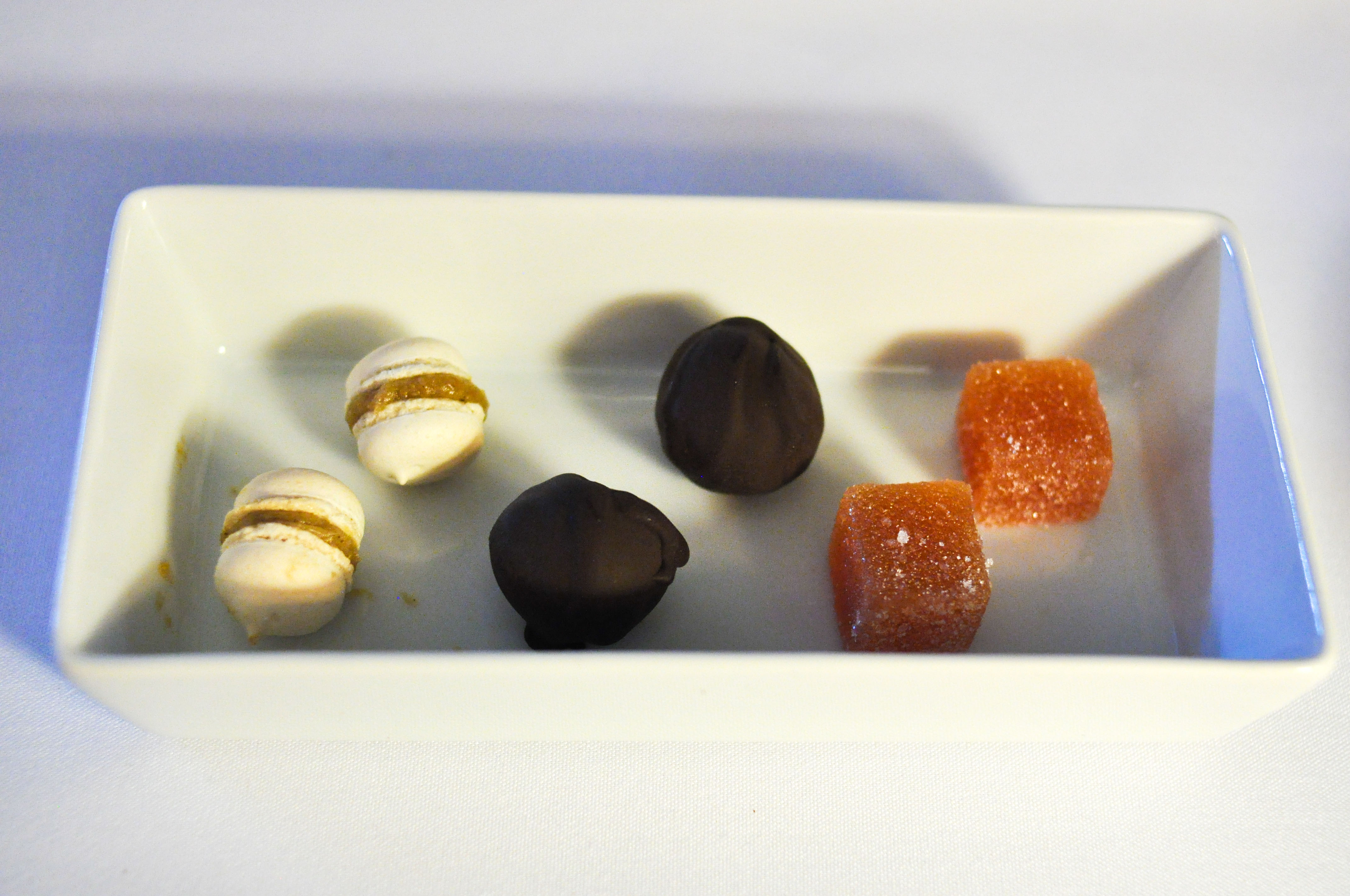 Final Bites – guava / macaroon / sudachi. Guava pate de fruit, maple macaron, sudachi chocolate.