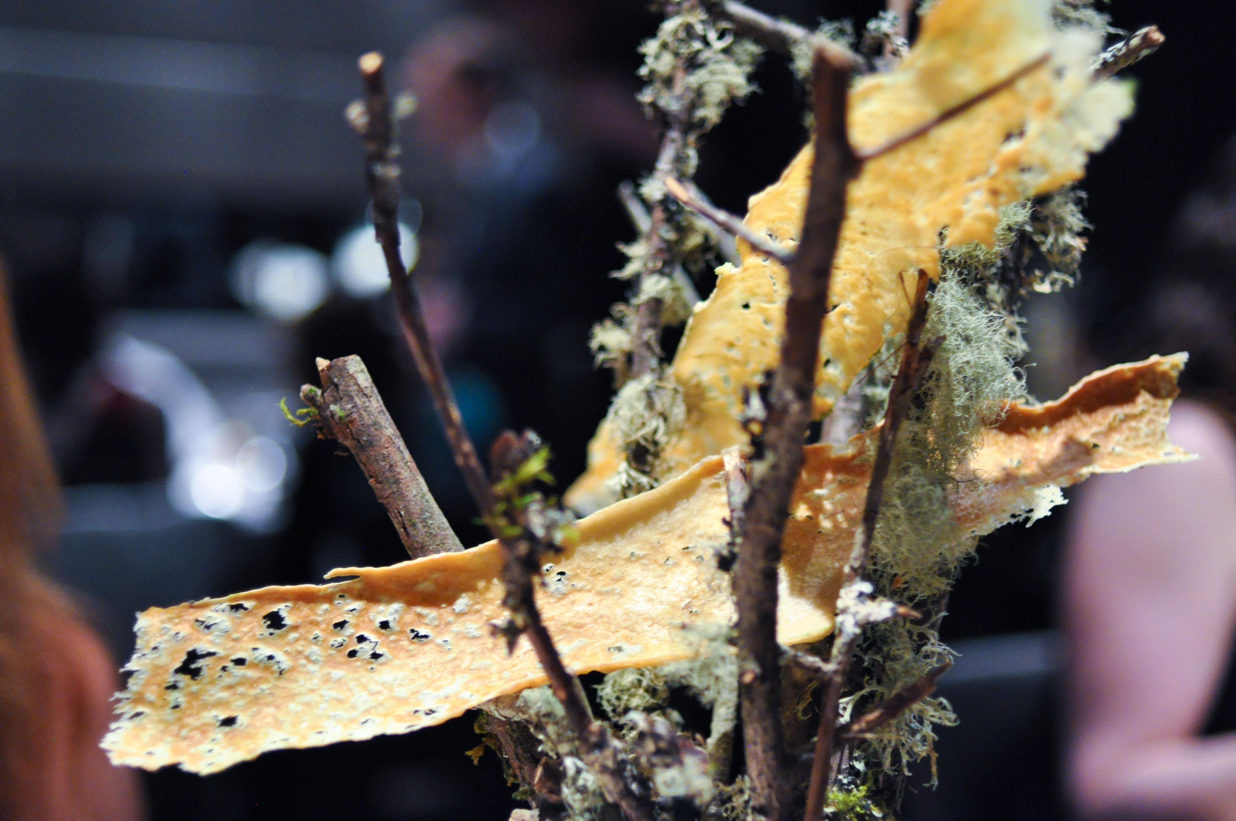 Fermented apples and lichen. Fresh apple ice and lacto-fermented apple. Cashew: roasted, raw, powdered, and oil. Rose candies and petals. Fried lichen. Seven month oak-aged apple cider vinegar made with an eight year old starter. An awesome back and forth between some really fun flavors.