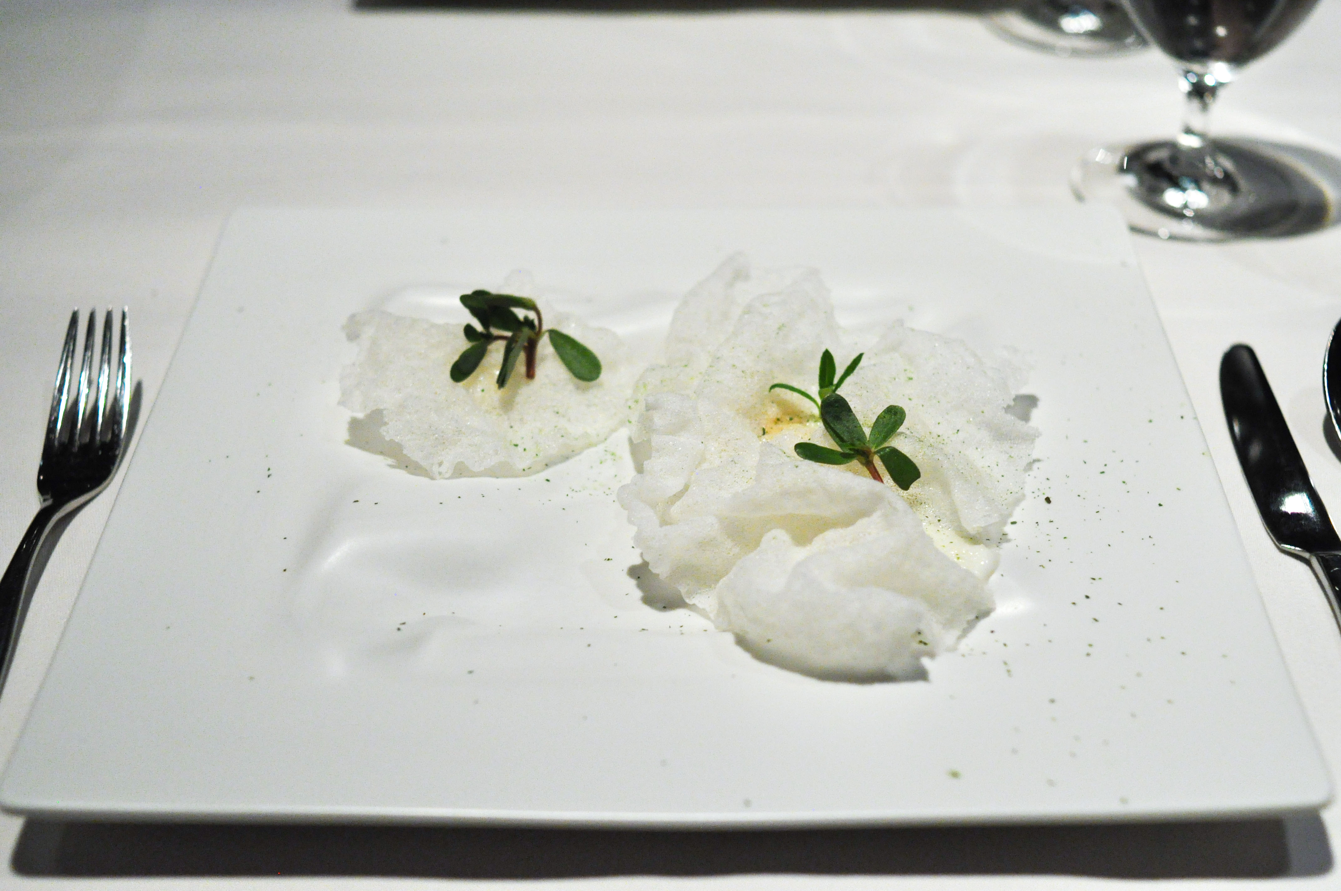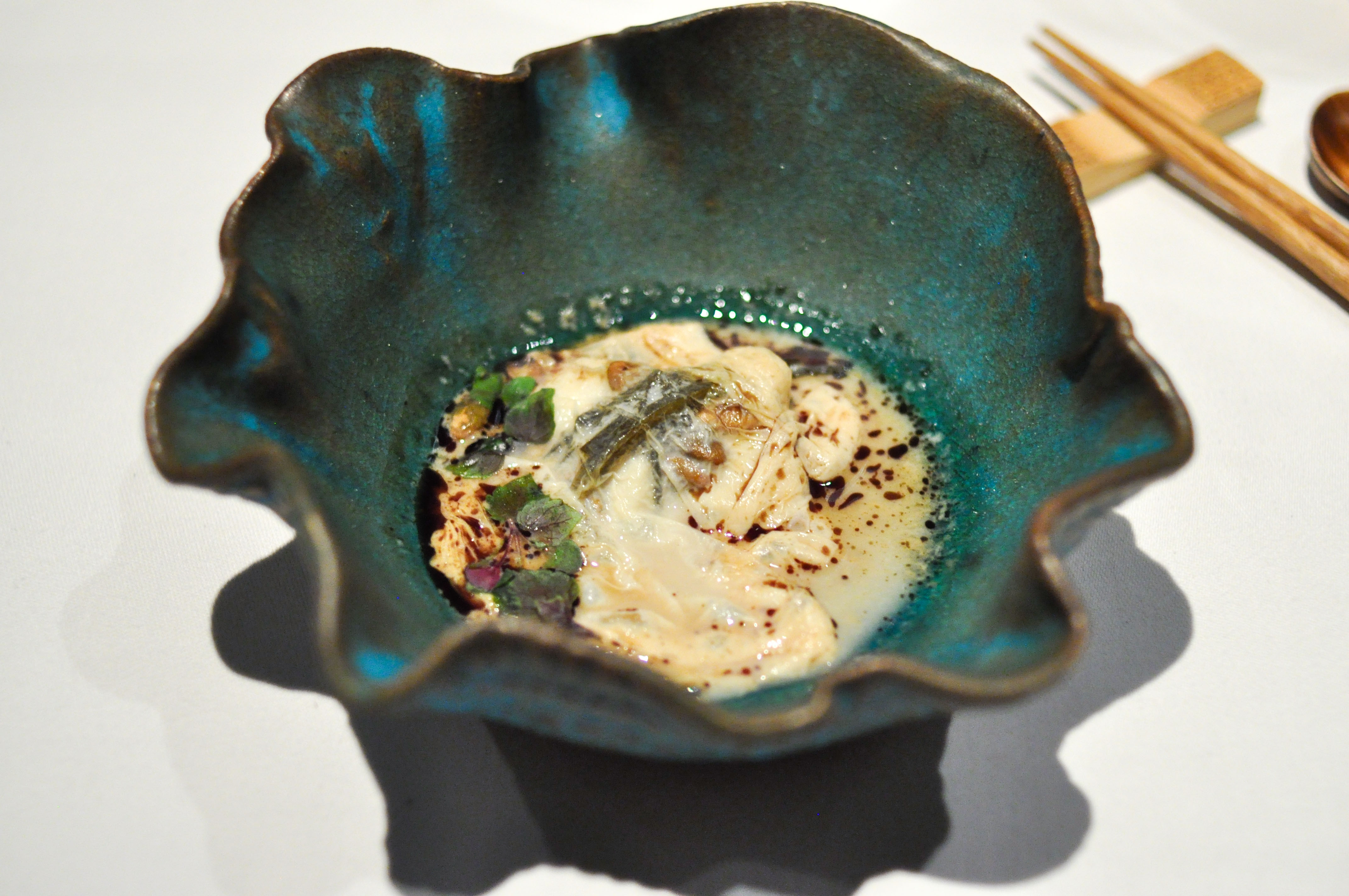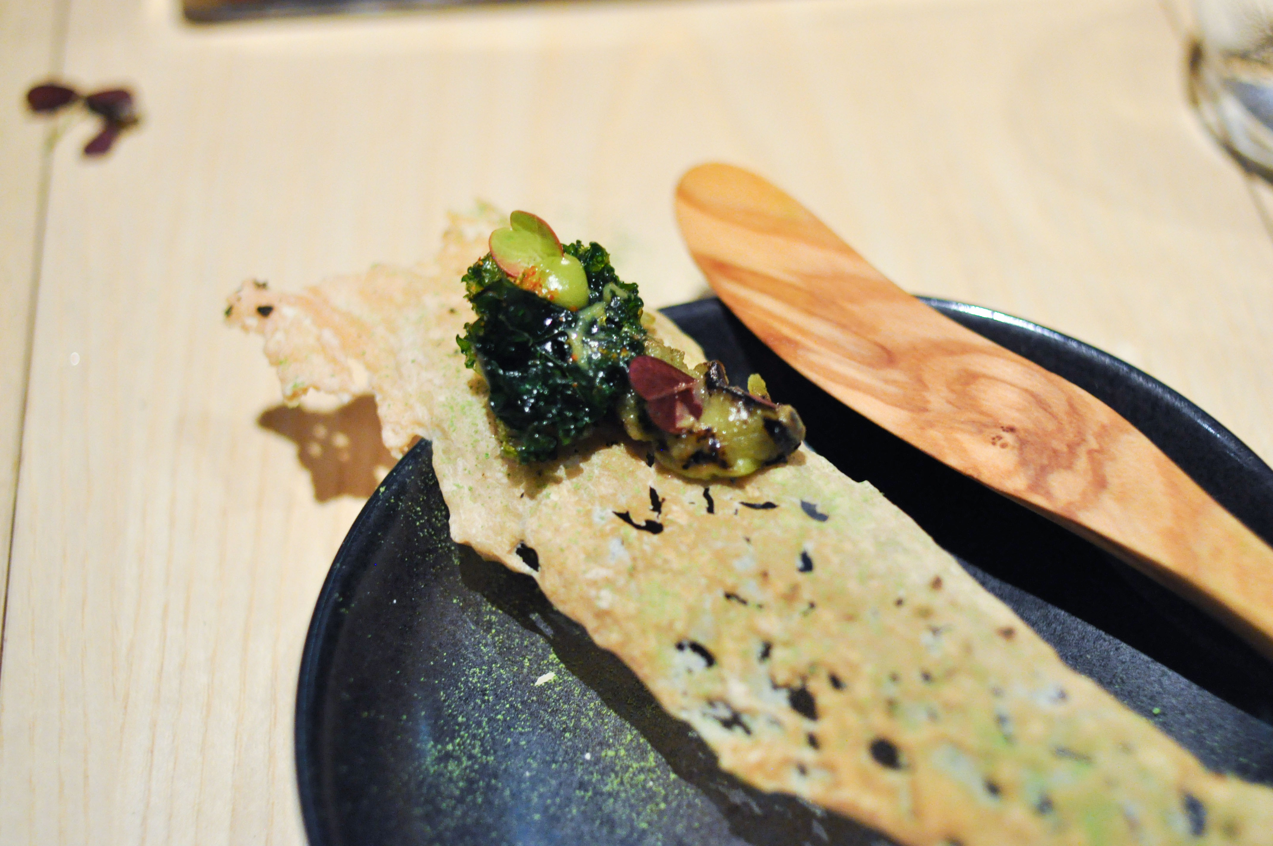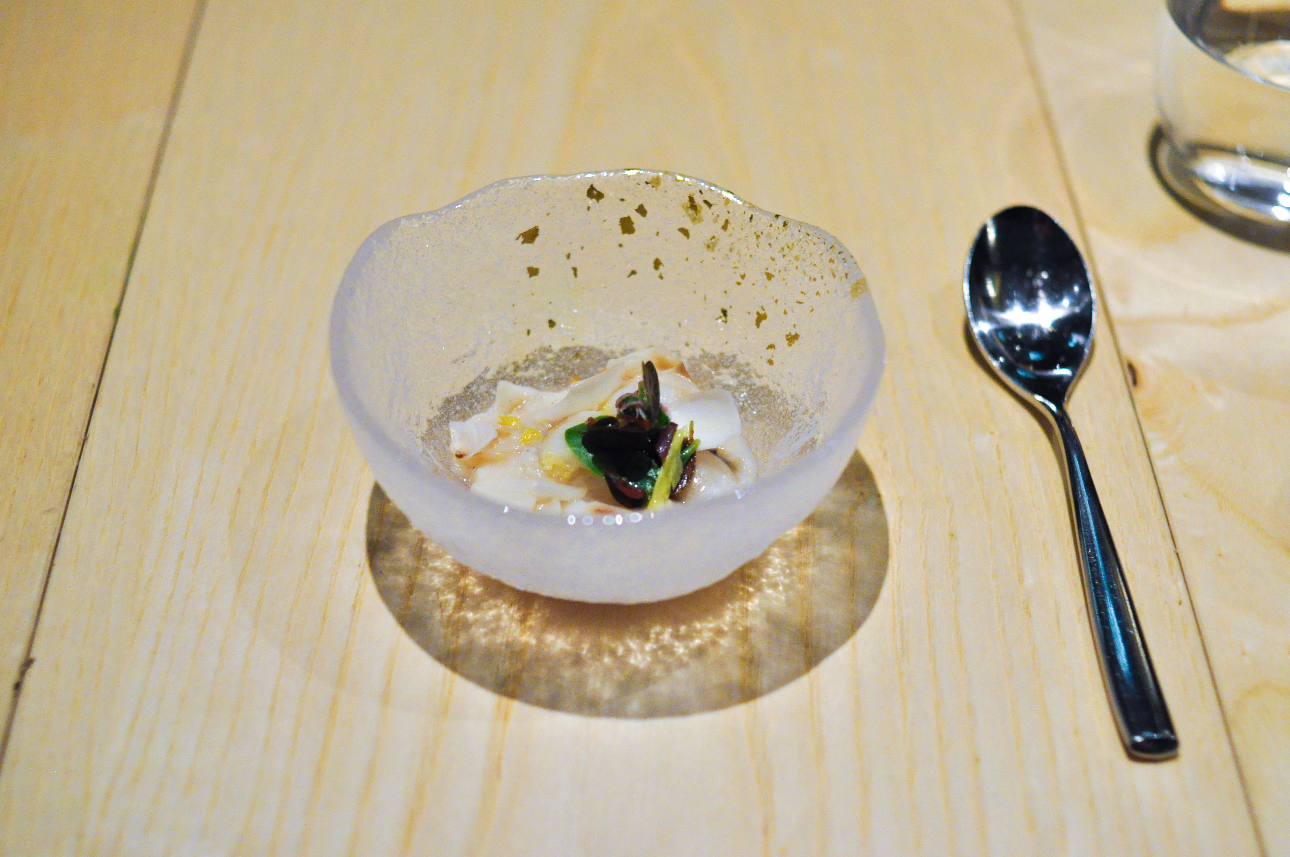 Kombu atoll. Kombu seaweed, yuba, ponzu, pumpkin seed, shiso. Visually inspired by an atoll coral reef. Damn…this dish was incredible. Great depth of restrained savory layers of flavors. Easily my favorite dish of the meal.