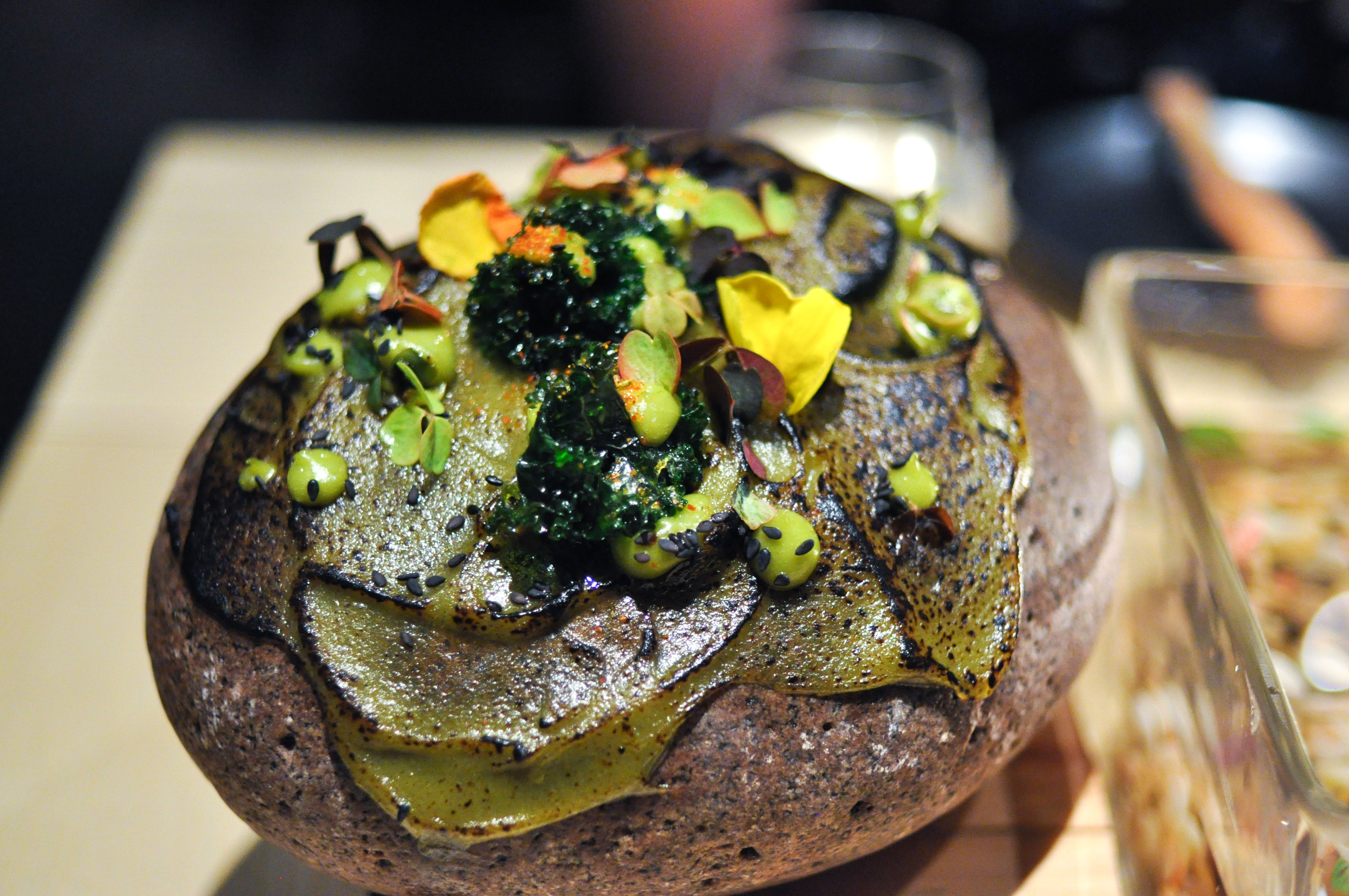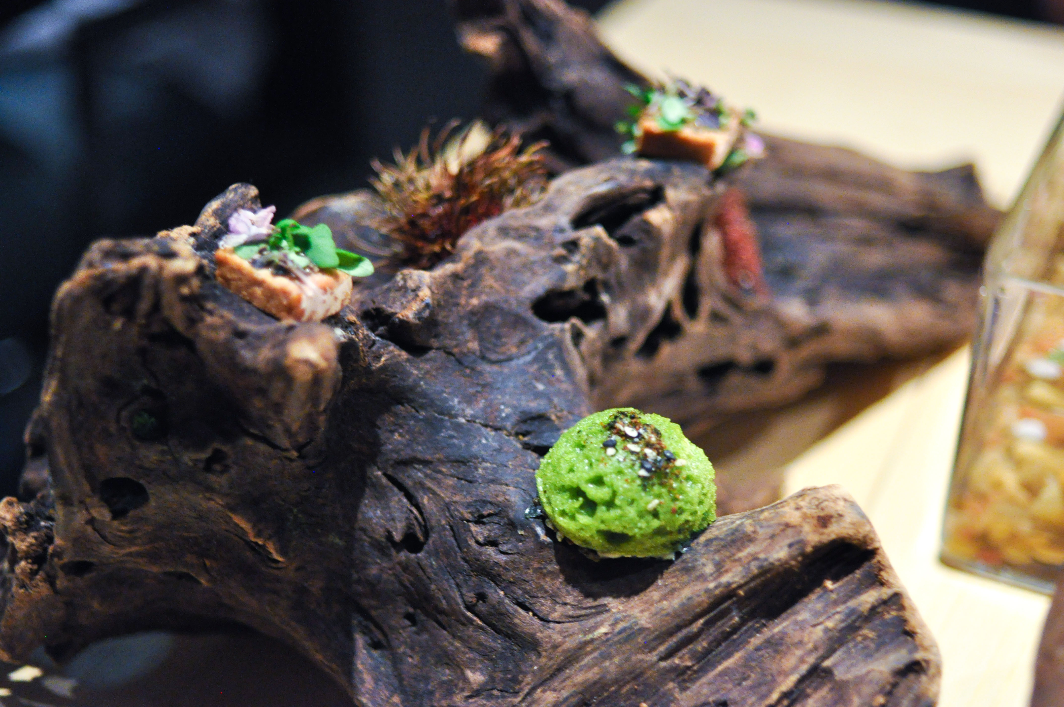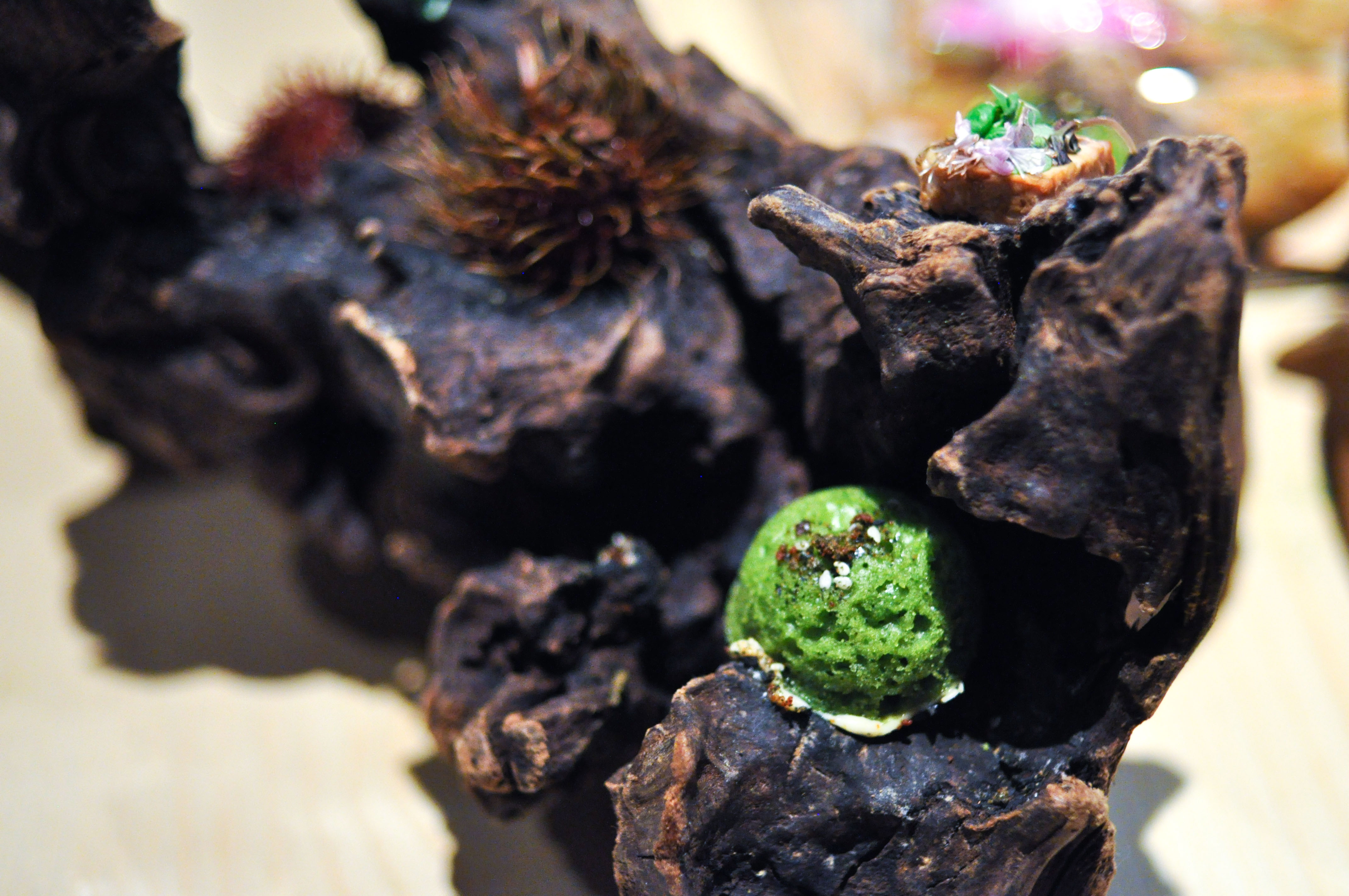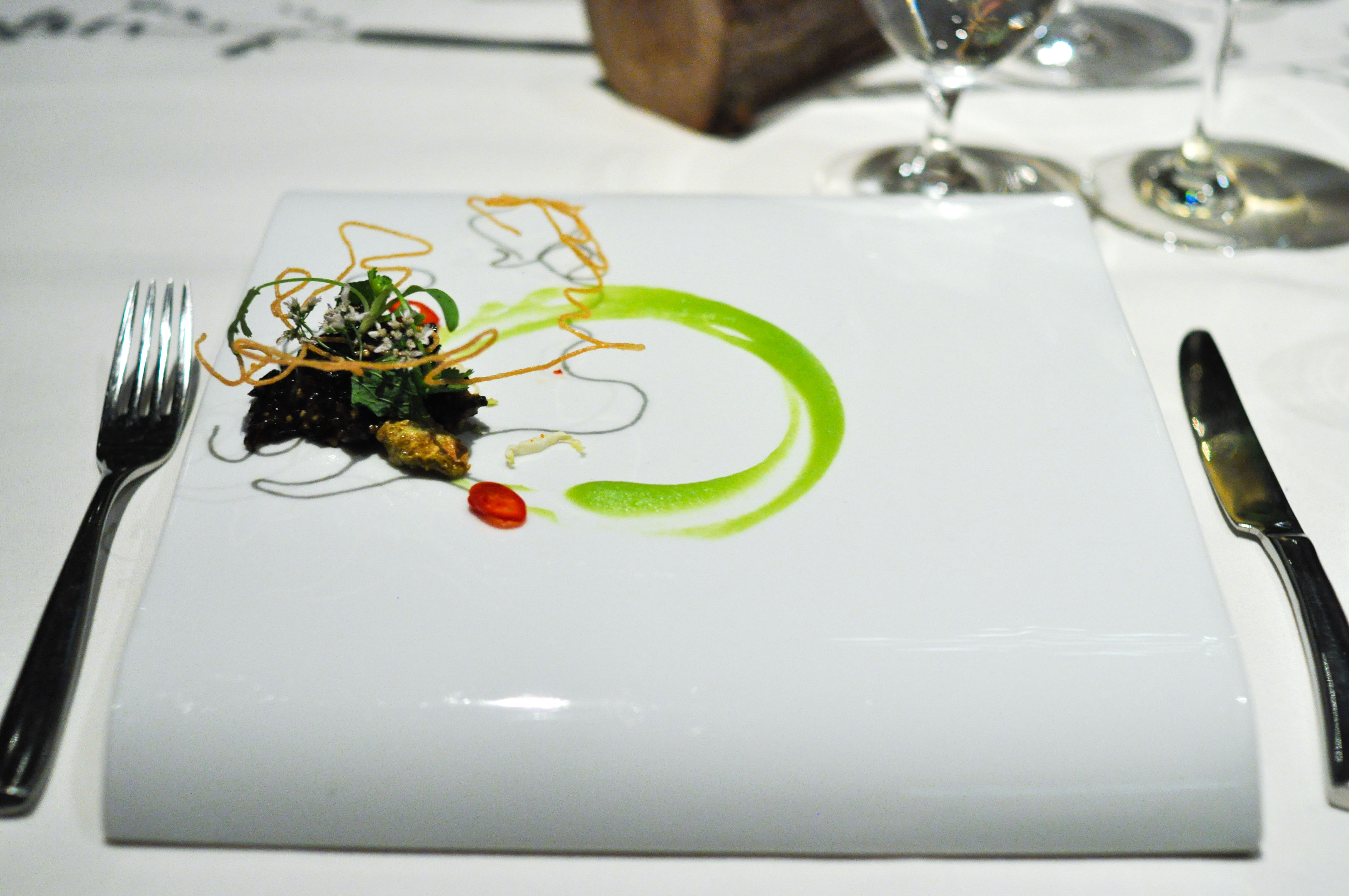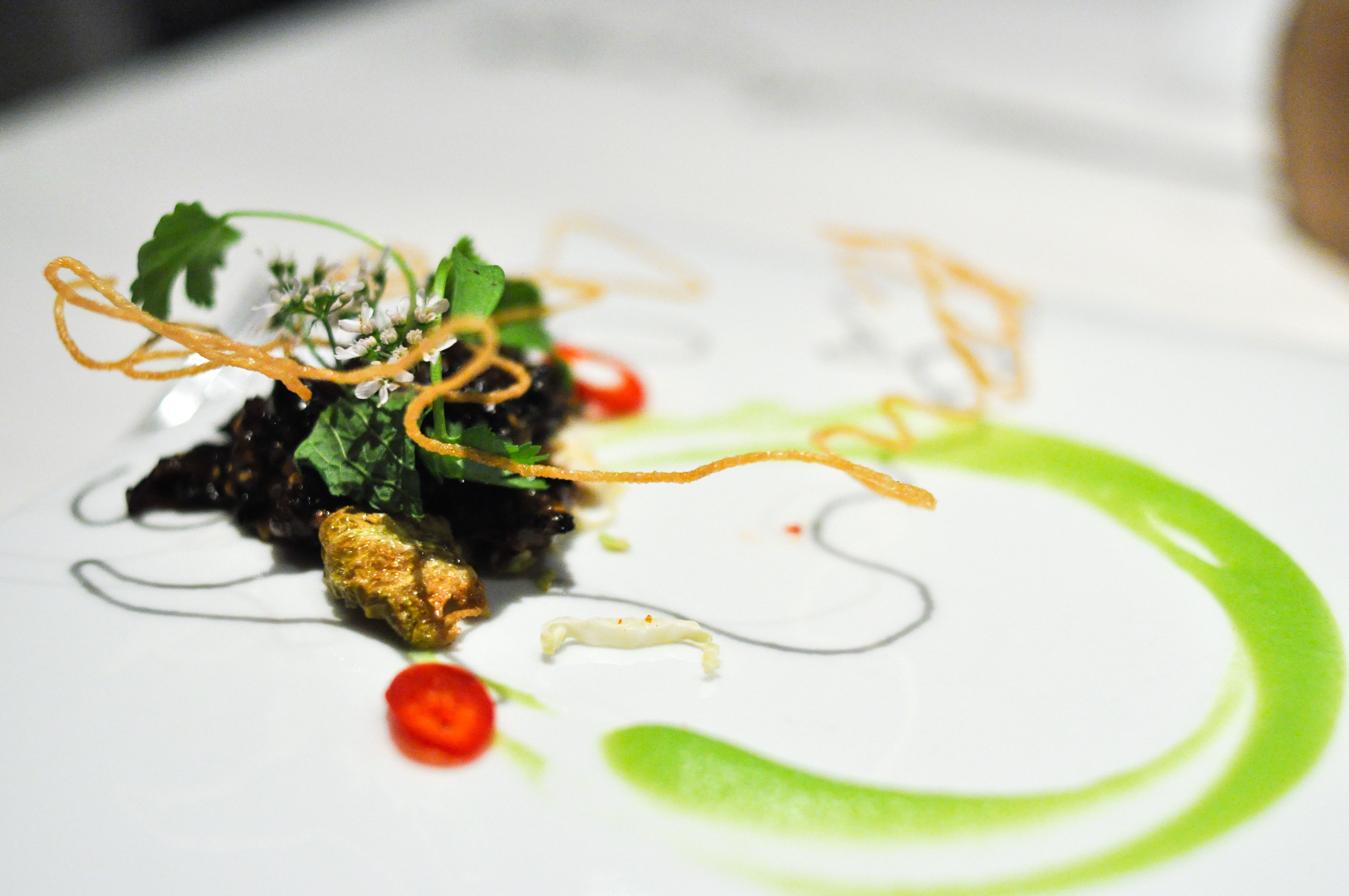 Kombu atoll. Kombu seaweed, yuba, ponzu, pumpkin seed, shiso. Visually inspired by an atoll coral reef. Damn…this dish was incredible. Great depth of restrained savory layers of flavors. Easily my favorite dish of the meal.