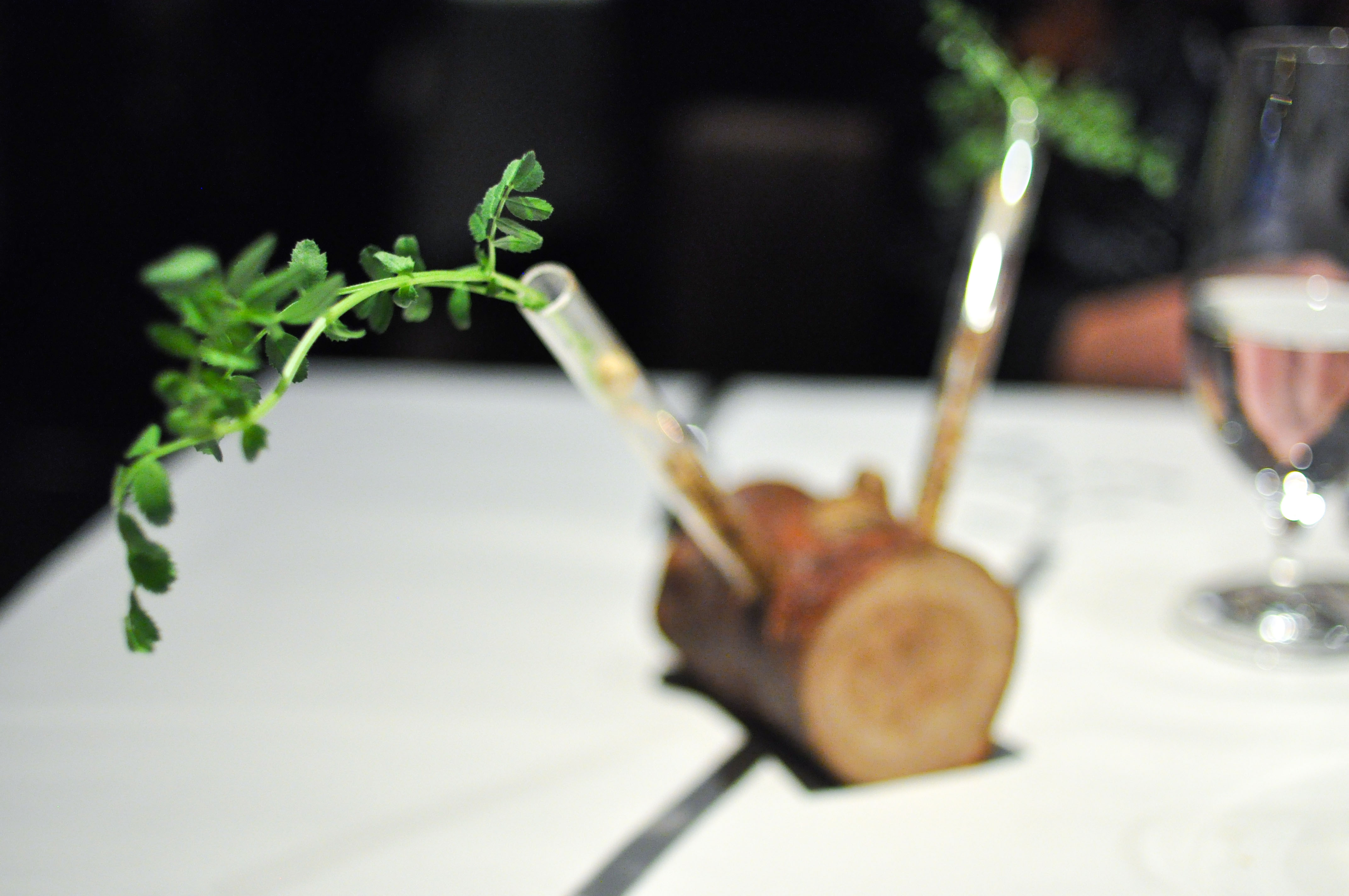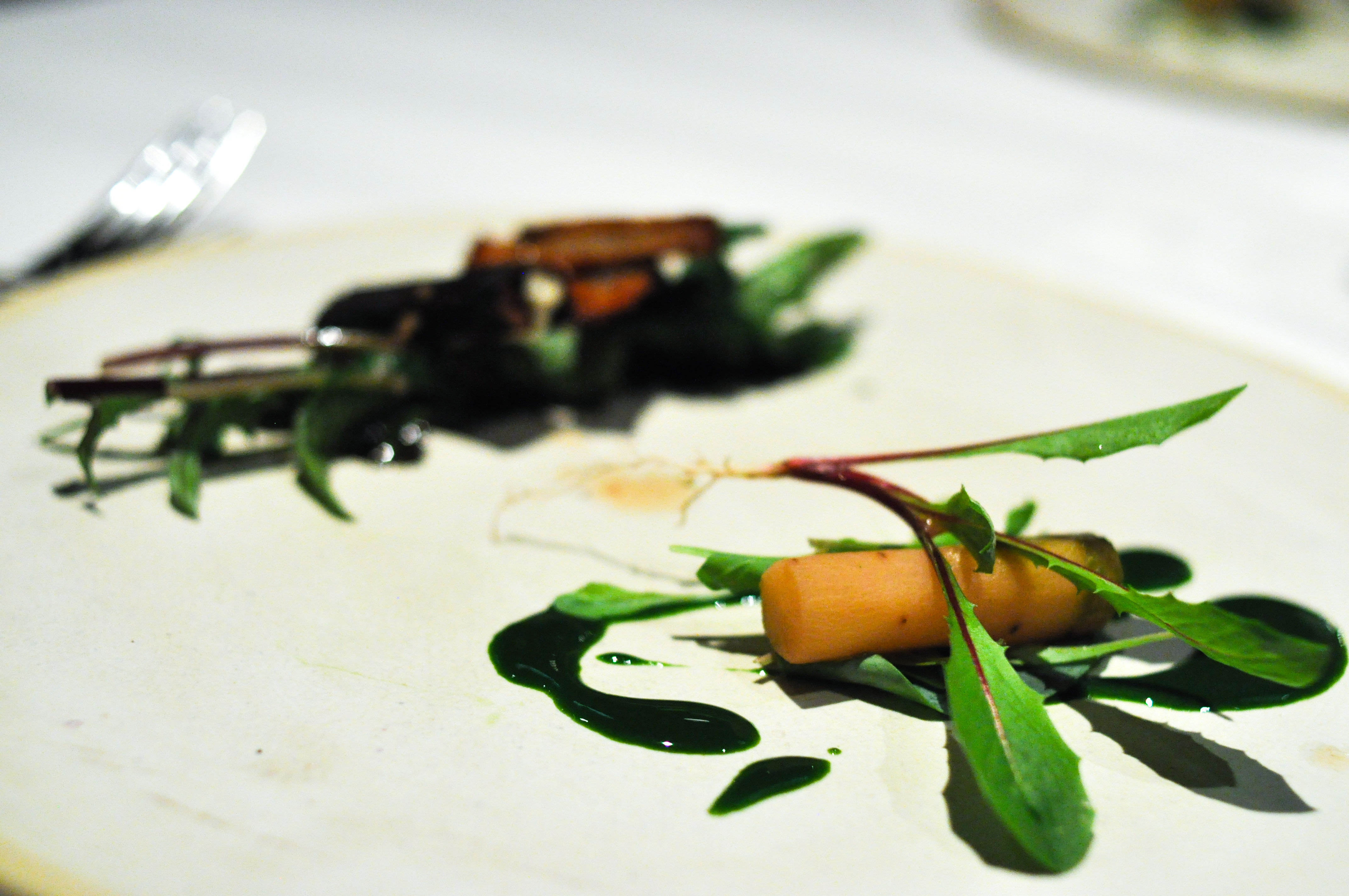 Salsifies with oyster and dandelion. Pickled salsify with oyster leaf. Pureed salsify stuffed in bad-ass crunchy roasted skin with dandelion greens. I loved the super bitterness of the leaves with the light sweetness of the root.