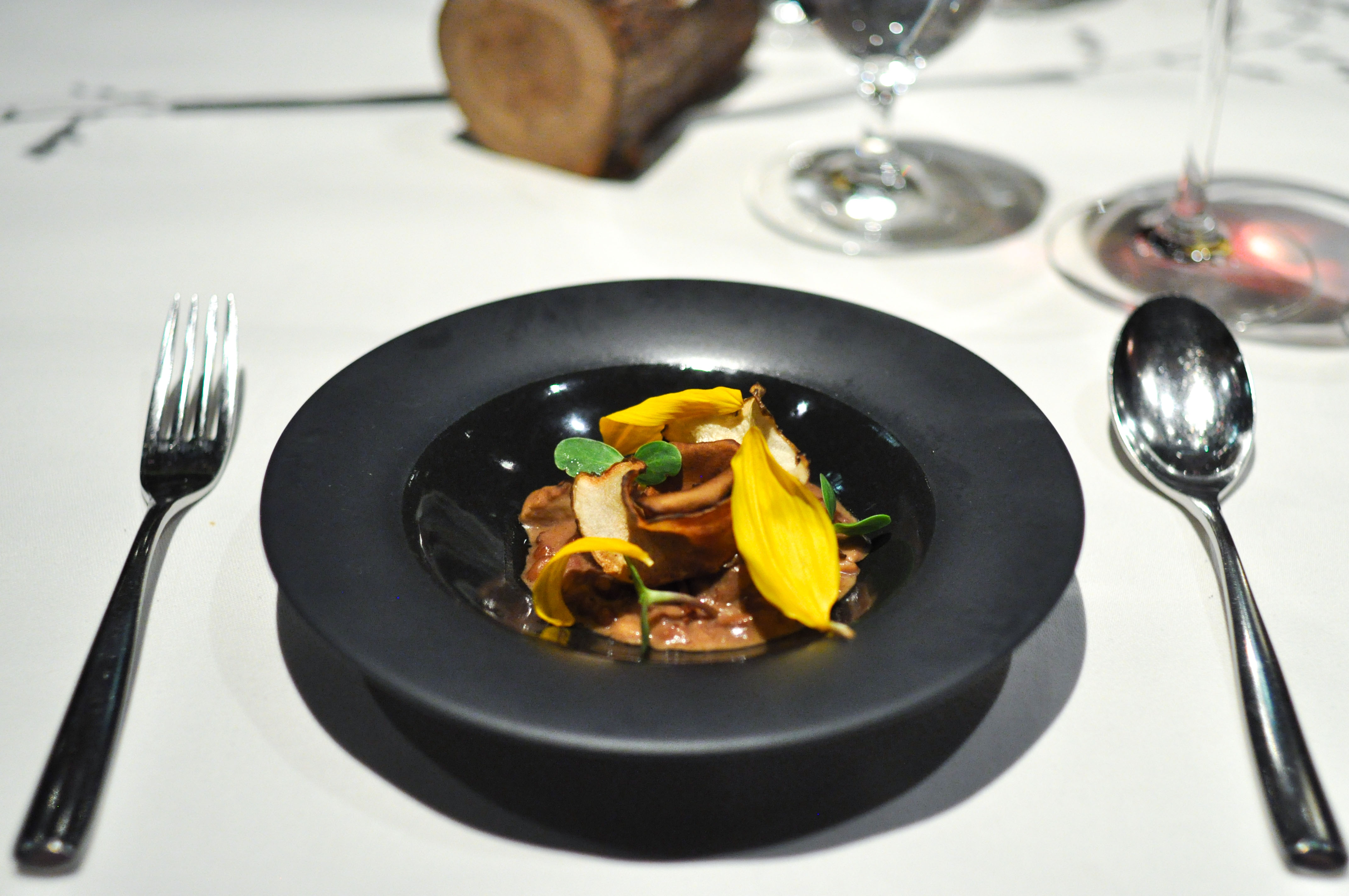 Mushroom cart. Farro risotto in mushroom stock with a mix of wild mushrooms. Sunflower seeds, petals, and leaves. Sunchoke chips and milked sunchoke. The varieties of fungus were killer, though overall the dish was super rich and really salty.