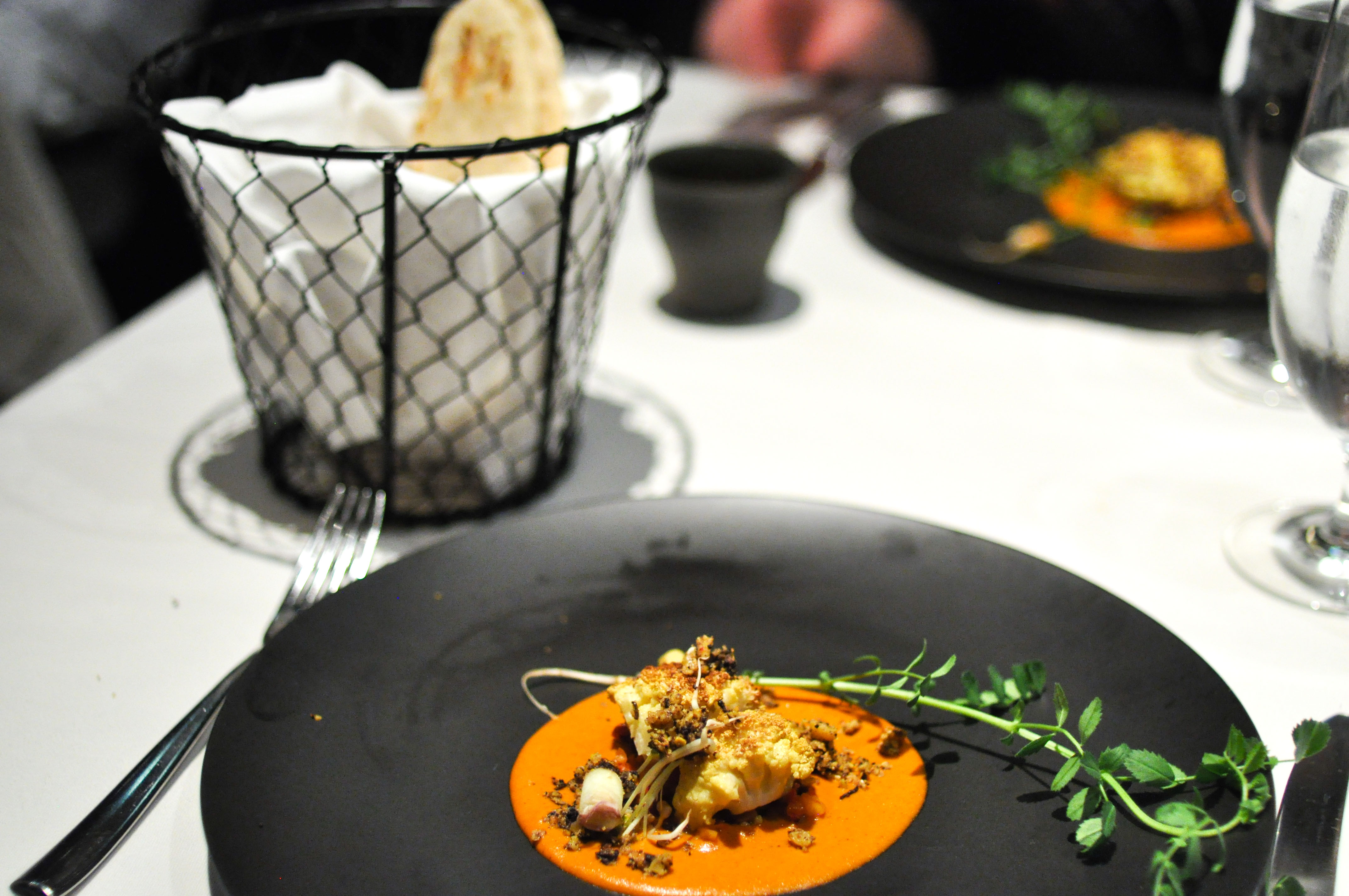 Swiss chard and douchi. A beer battered leaf of chard over a carrot and beet sauce. Next to a pretty solid black bean and chocolate douchi with some smoked orange. A fairly rich plate with the excess of fried batter.
