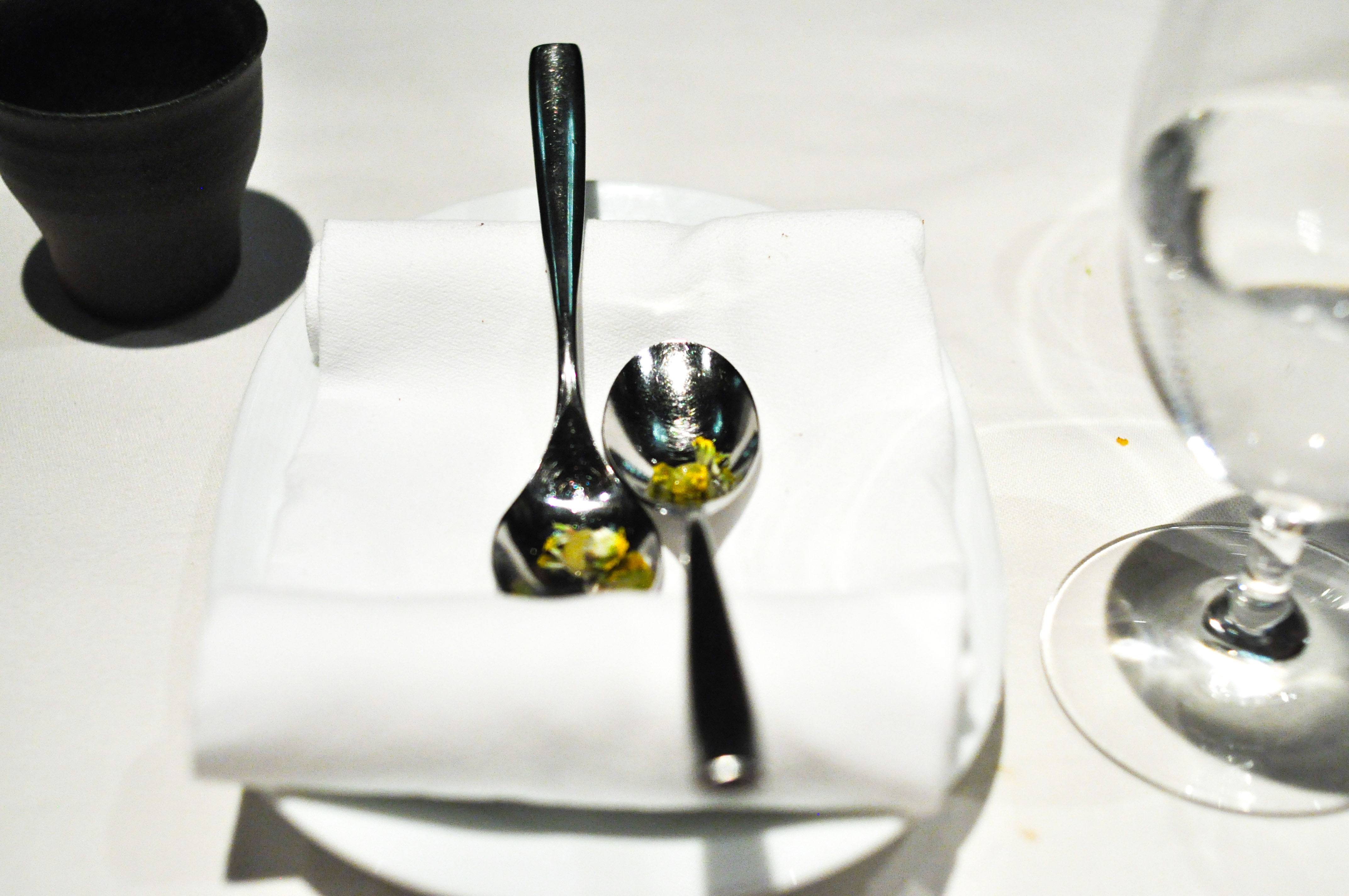 Lily pond. Lily bulbs, sauteed and raw. Lychee. Red veined sorrel, burgundy and rainbow oxalis, celery leaf, and micro chard fished out of the table decoration. It was a nice contrast between the starchy sauteed bulbs and the crisps raw ones.
