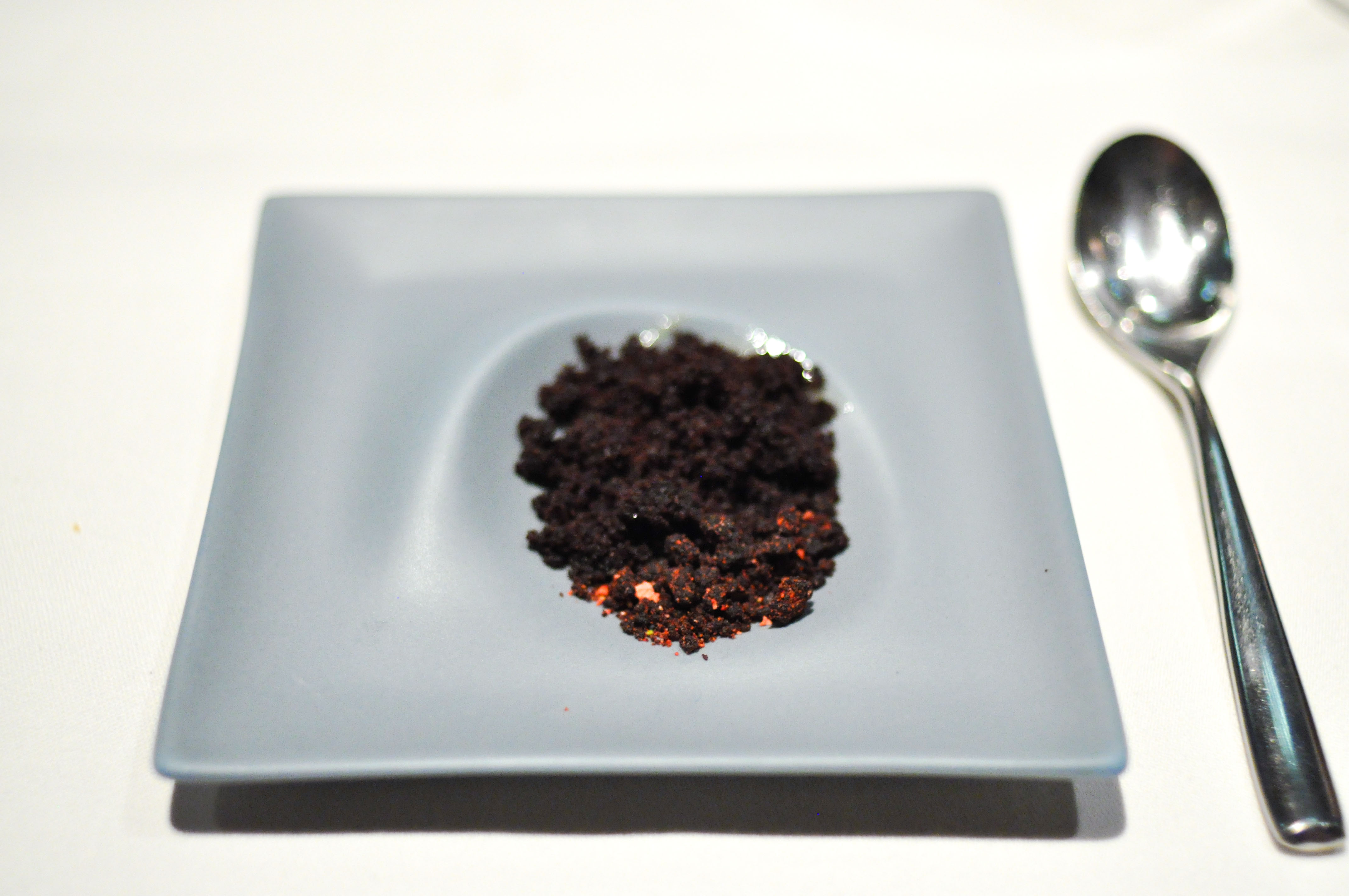 Olive oil jam and bitter chocolate. Olive oil, szechuan buttons, chocolate cake, freeze dried strawberries, and black truffle. Before the dessert arrived, we were offered some szechuan buttons so we could experience their tickling/numbing sensation. The dessert was fantastic. Great textures and tastes, not too sweet, and the tingle from the buttons was a lot of fun. This was Rocky’s favorite plate of the night.
