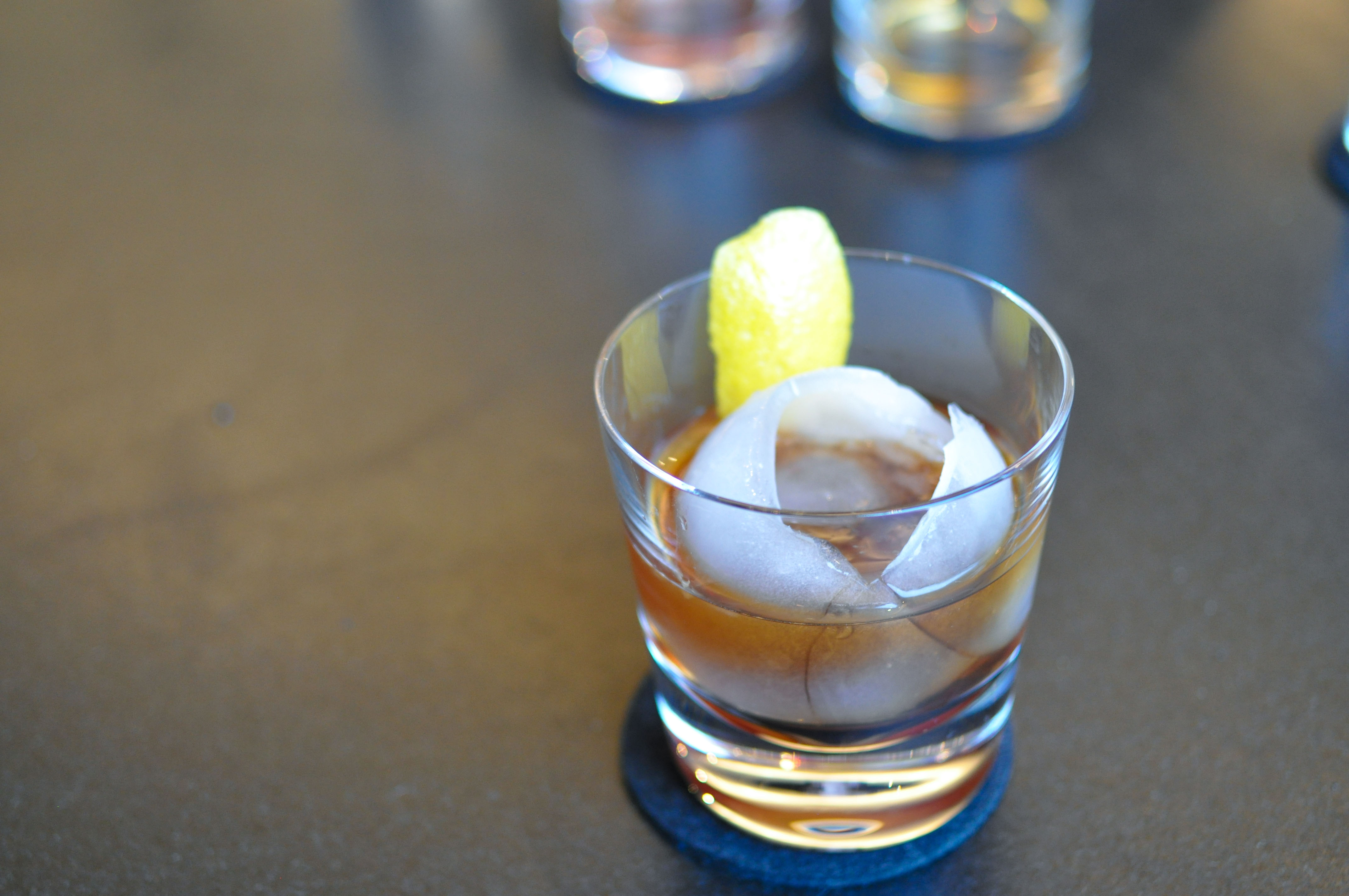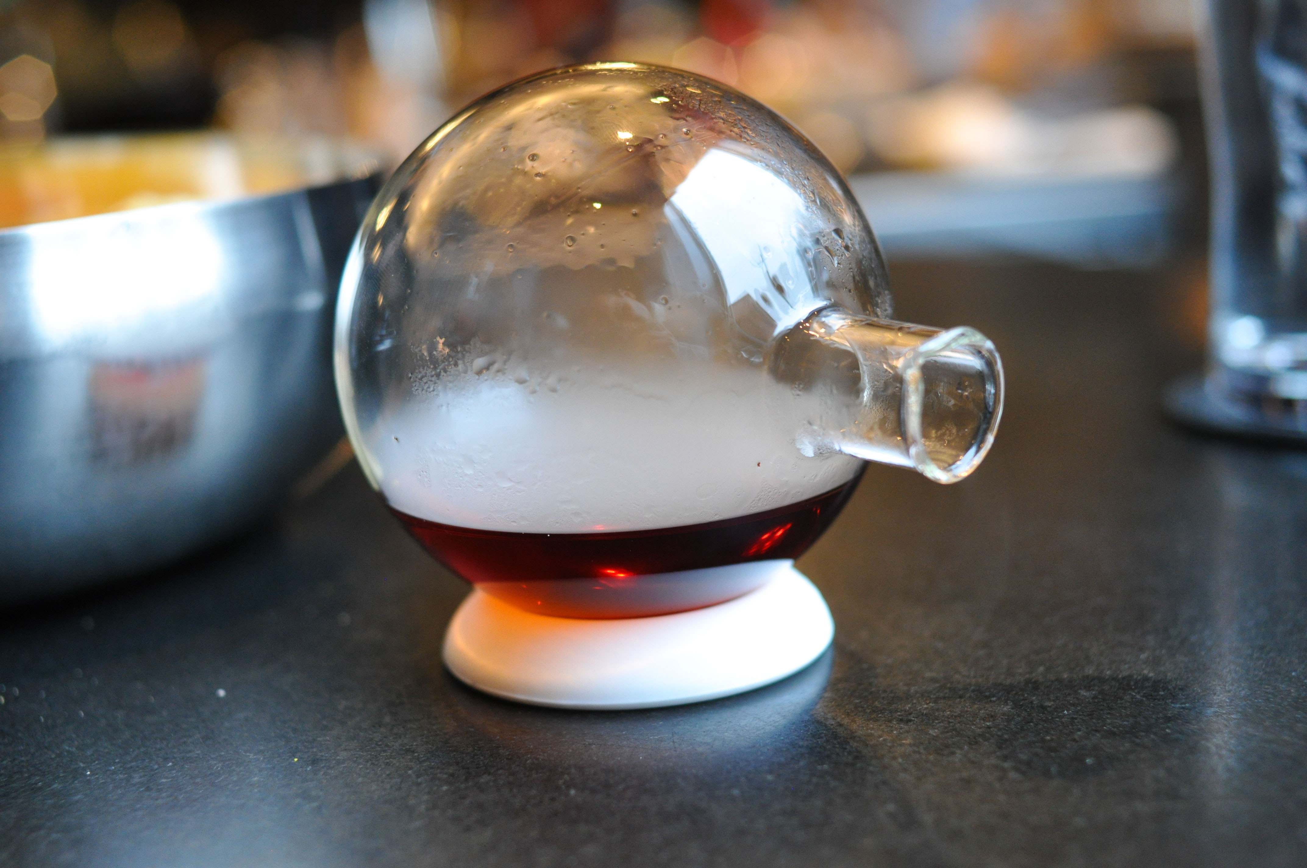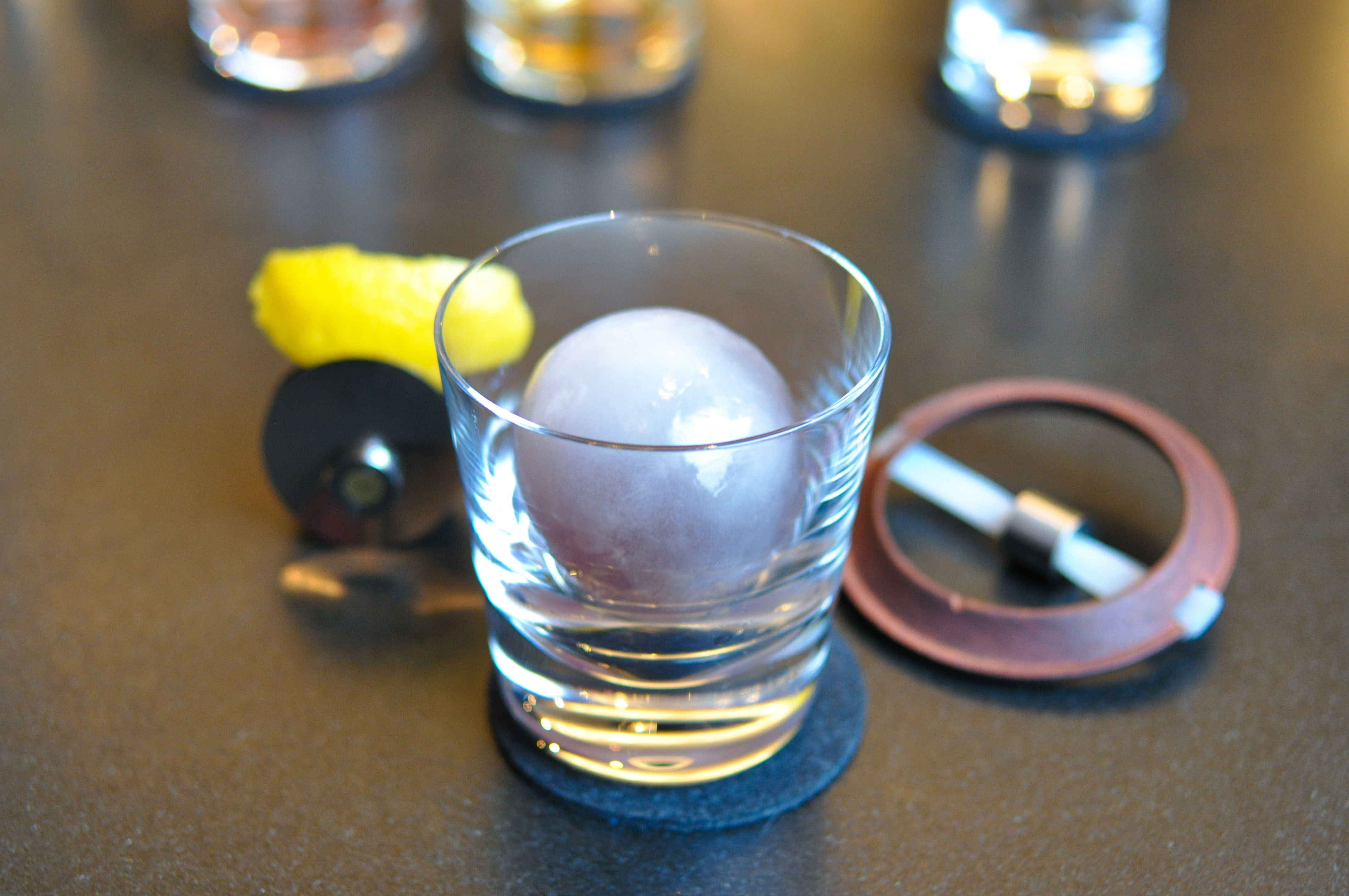 In the Rocks (second edition). Benedictine, vermouth, cognac, rye. A vieux carre on the rocks, served in a rock. Presented with a circular sling shot to place atop the glass and crack the ice sphere to release the cocktail.