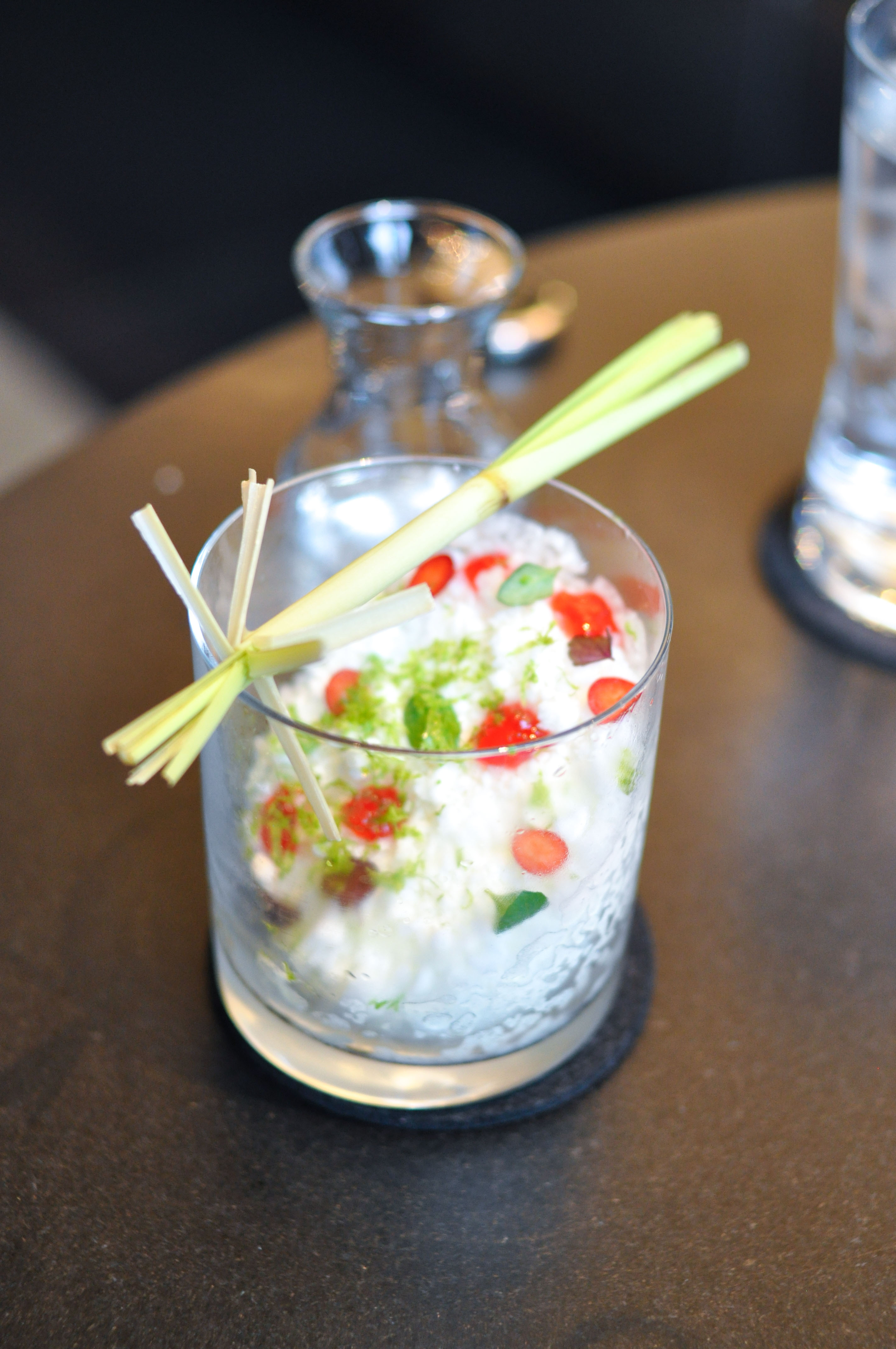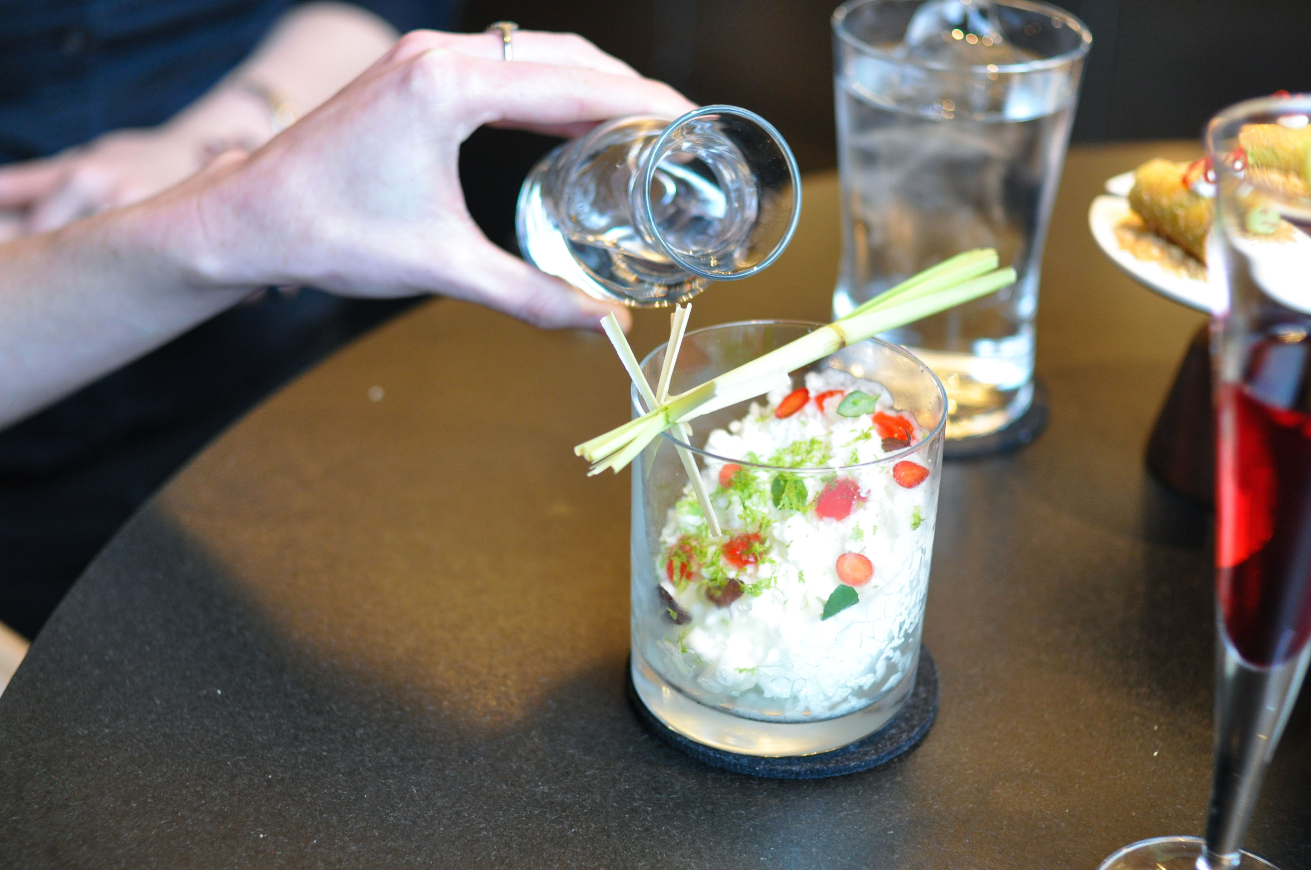 Ginger. Shiso, peychaud’s, vodka. Ginger and lime made into a snow, courtesy of liquid nitrogen, with shiso, fresno pepper, and lemongrass. Rocky was told to add vodka and stir. The drink had a great ginger root spice.