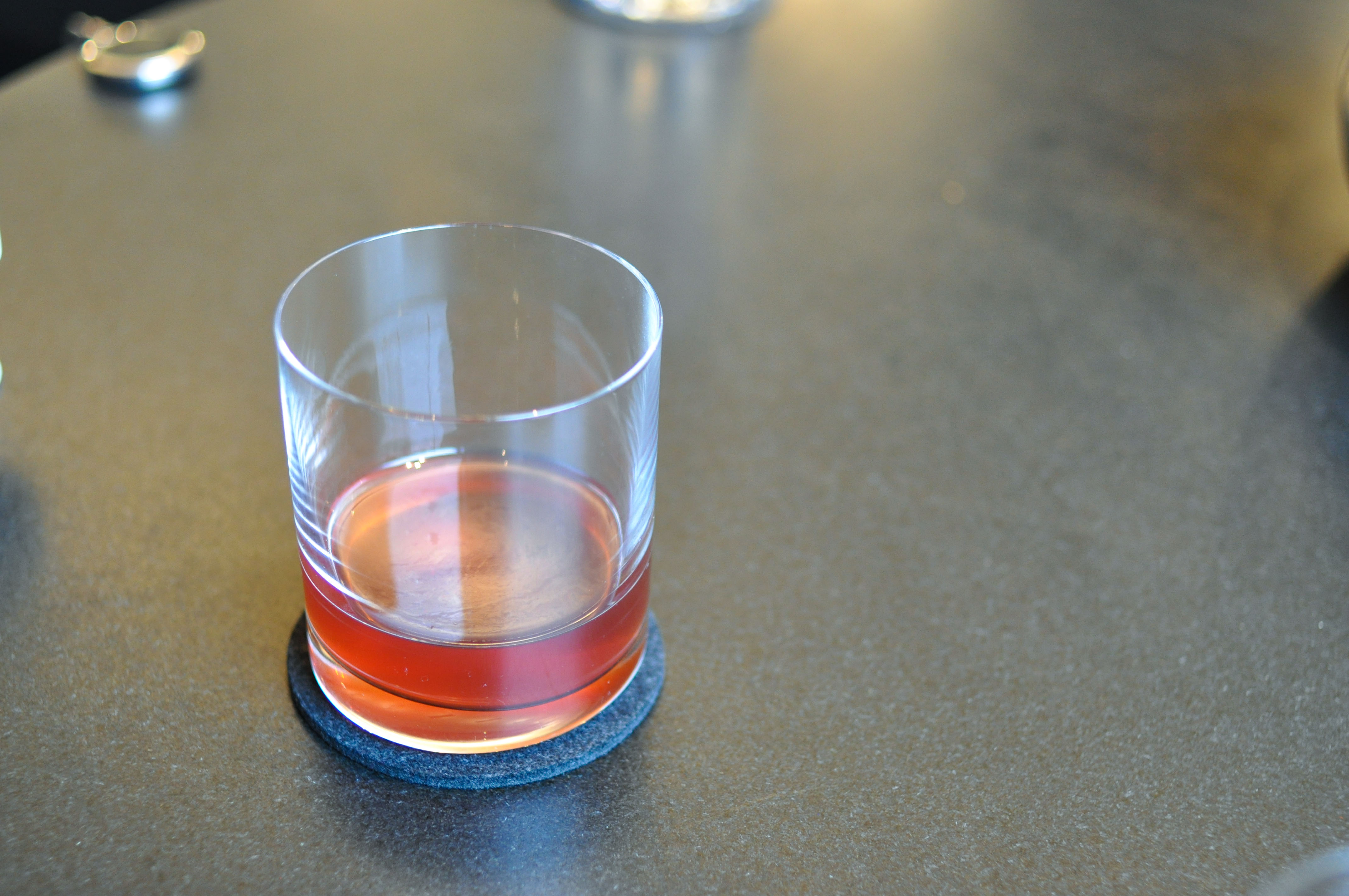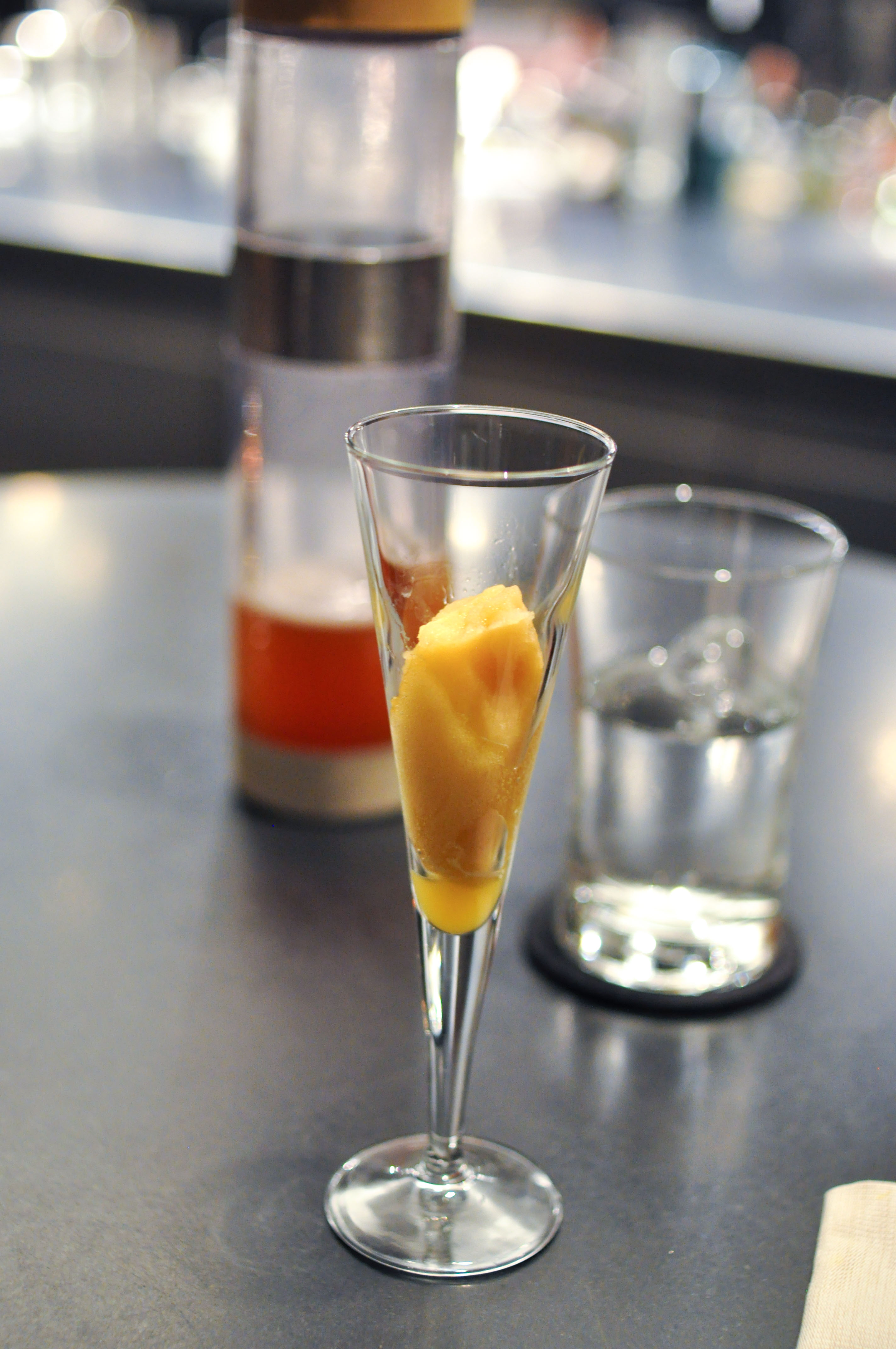 Amuse. To start, an amuse of pisco, grappa, and pineau des charentes. Pleasantly fresh and mildly fruity.