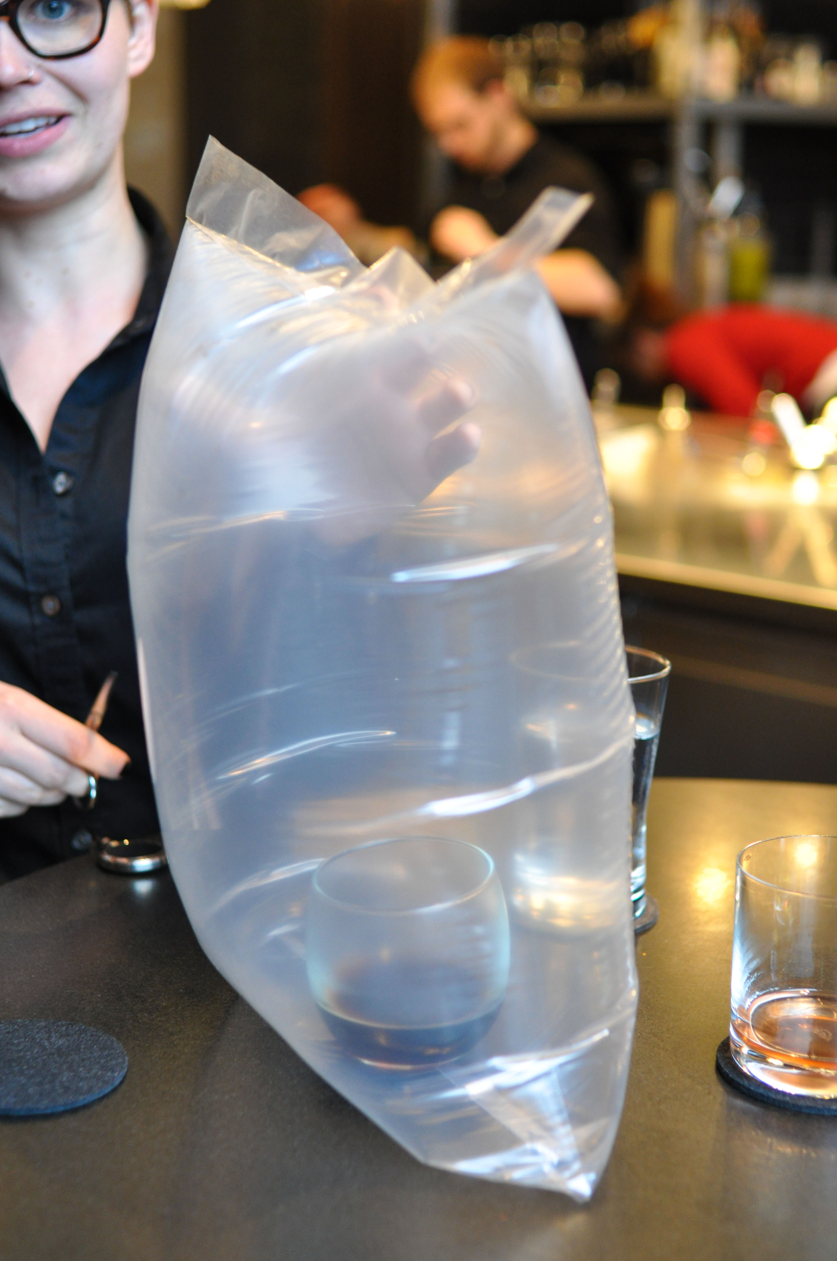 Rob Roy. Scotch with 1985 pedro ximenez served in a bag of lavender air. Like a dark, earthy, herbed caramel.
