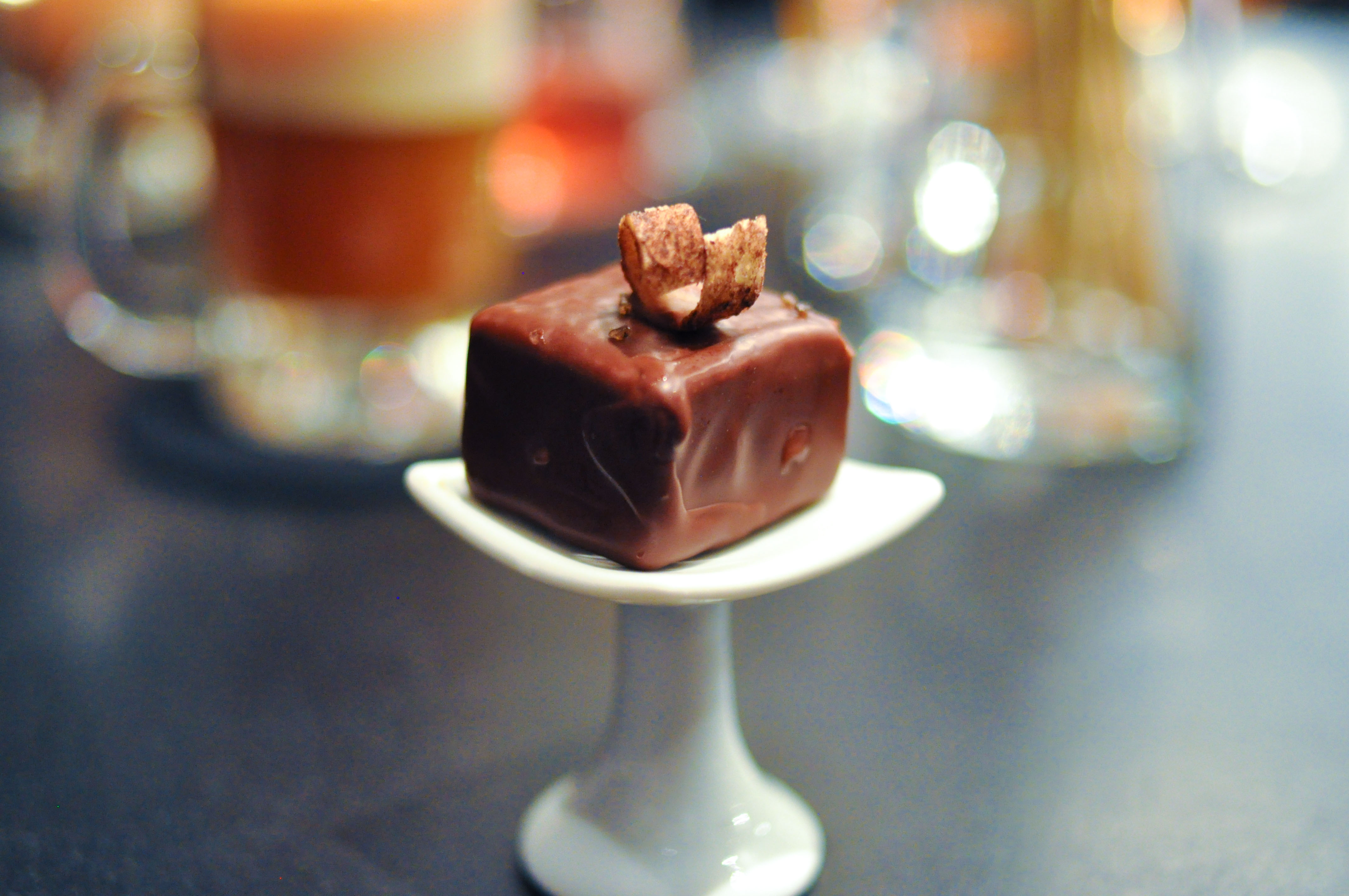 Lollipops. An assortment of ‘lollipops’: rice krispie and tonka bean, banana peanut butter, rooibos pate de fruits, malted nougat, raspberry with balsamic foam, coffee toffee, and chocolate hazelnut.