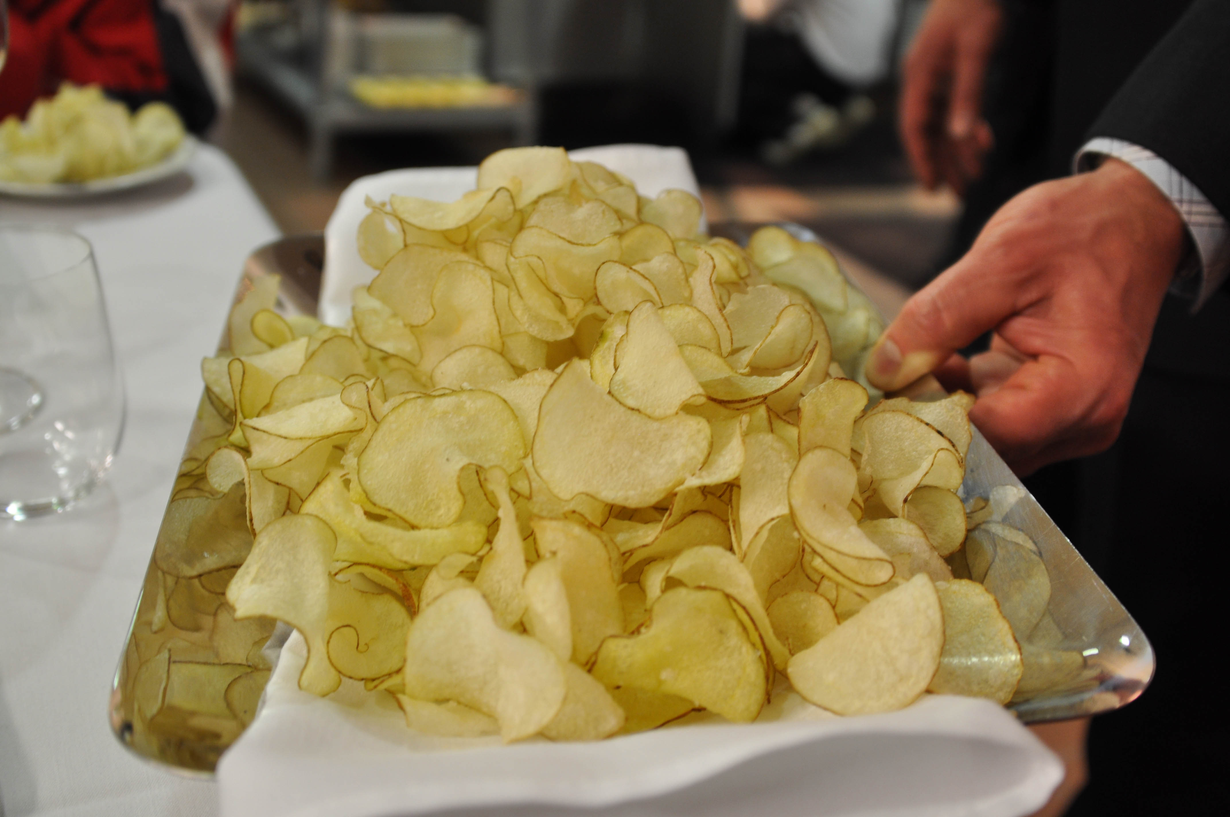 During their [somewhat] recent renovation, Frasca added two small kitchen tables, which is where I requested to be seated. Traffic and hotel check-in went much faster than planned, so we were two hours early for our reservation but still seated without a hitch. The Bro and I were welcomed with a tray of chips and glasses of Anselmi Tocai Friulano: a dry, aromatic wine with a floral nose; then briefed on the menu and its Friulian influence.