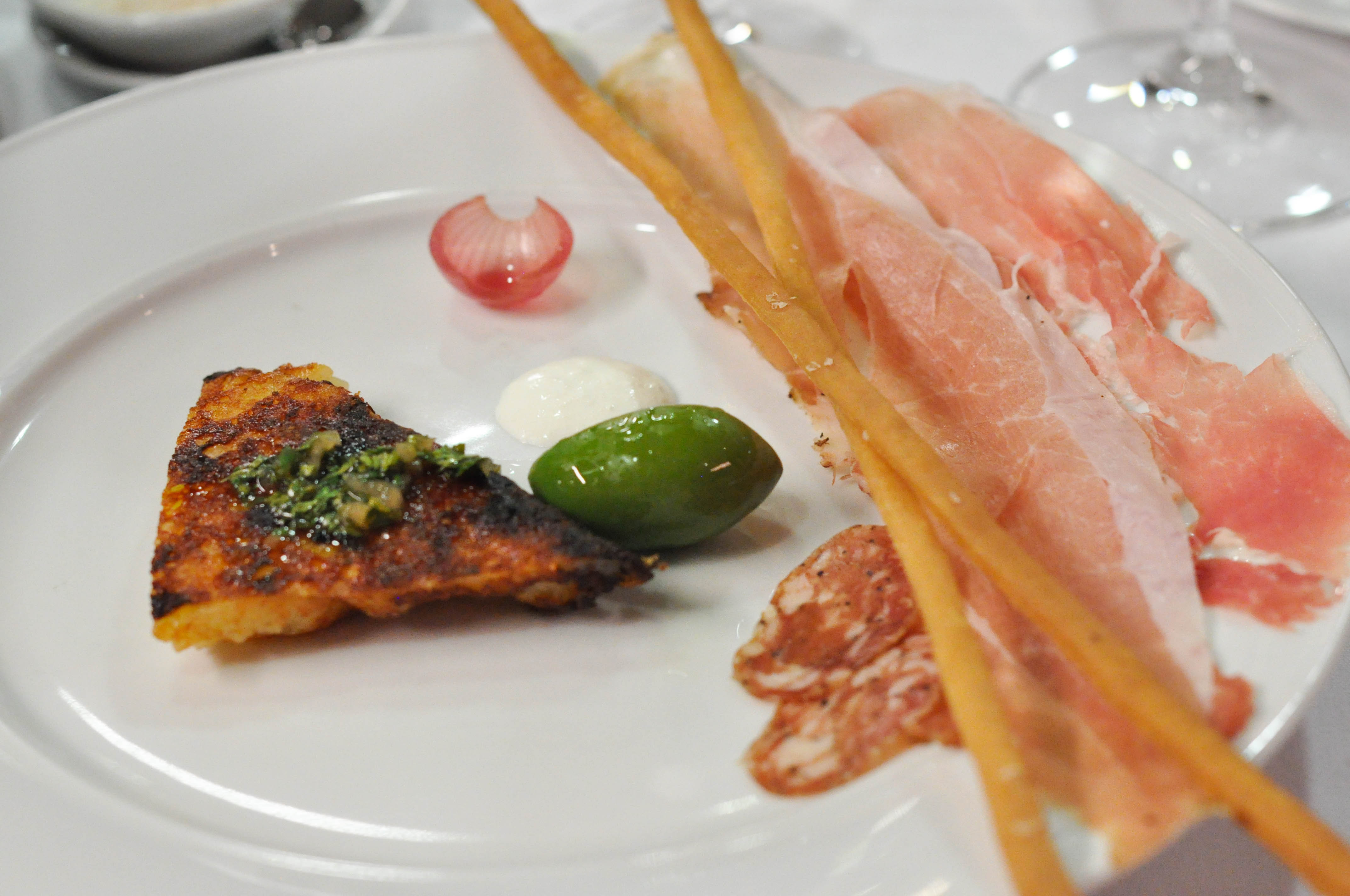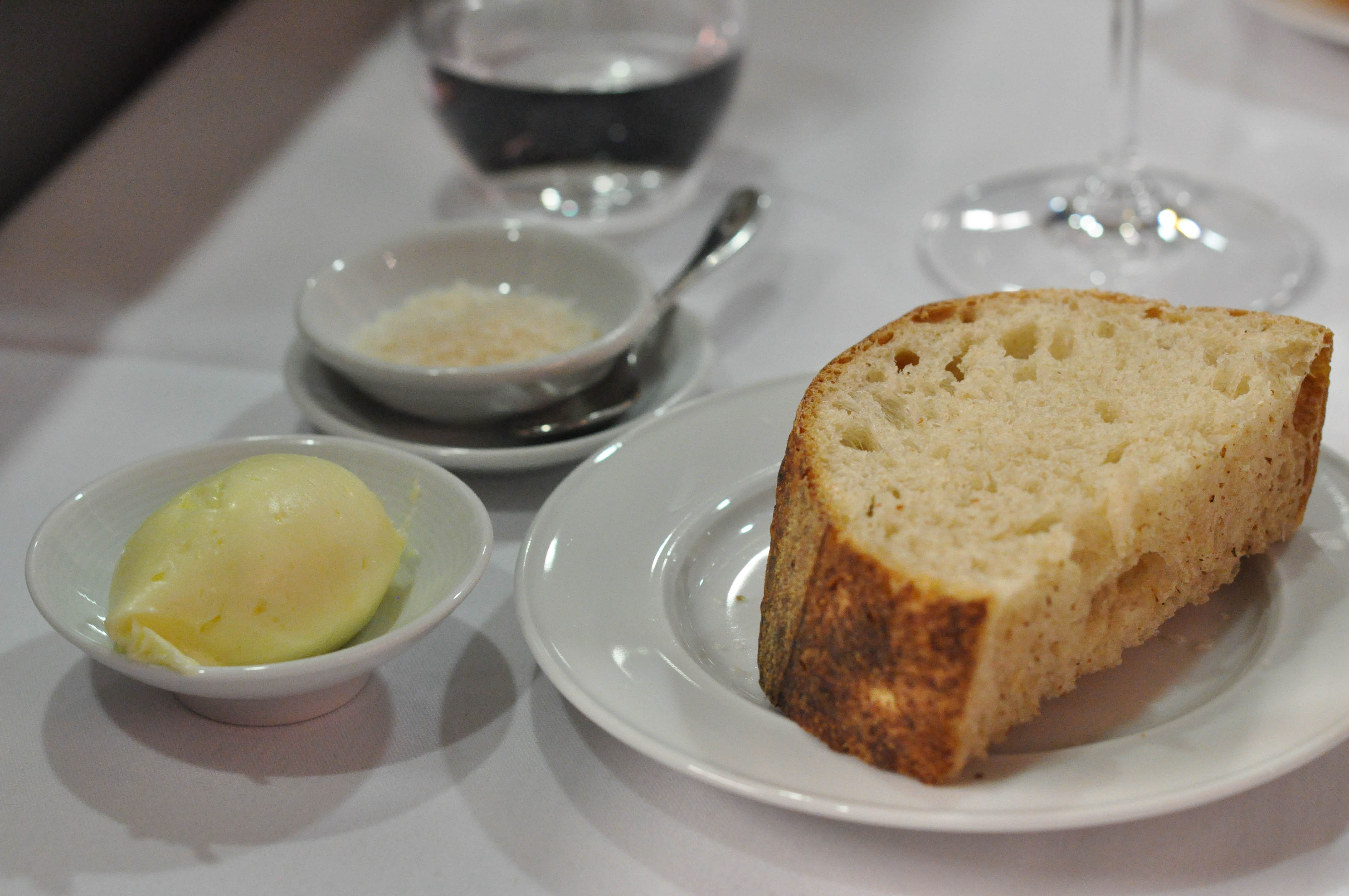 First up, the Salumi plate: Prosciutto di San Daniele, Friuli; Speck, Alto Adige; Salame alla Scarpetta, Boulder, CO; Rafano(horseradish); Frico Caldo(Yukon Potato with onion and Montasio cheese); Grissini. This was pretty much straightforward. Supple, salty cuts from Italy. An impressive fatty cut from Bobby and Lachlan’s project: Scarpetta. And the star of the plate for me: the expertly crisped Frico. Along with the Salumi came Adami’s Prosecco di Valdobbiadene Bosco di Gica, rich and fruitful with delicate bubbles, and bread service, which I could take or leave, but The Bro couldn’t get enough of, as several times he involuntarily reached across the table to grab it off my plate.