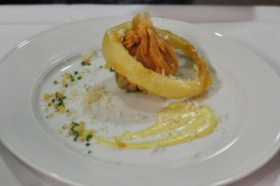 ‘Bocconcino’ – Walnut, Apple, Colossal Onion, Horseradish. I adore the idea of this dish. And I often love a flare of sweet with my savory. While I enjoyed the onion, the sweetness of the purse outweighed the other flavors a little much for me. Though the Marco Felluga Molamatta Collio Bianco(Tocai Friulano, Ribolla Gialla, and Pinot Bianco I think) was a nice pair with its exotic fruit palate and light vanilla finish.
