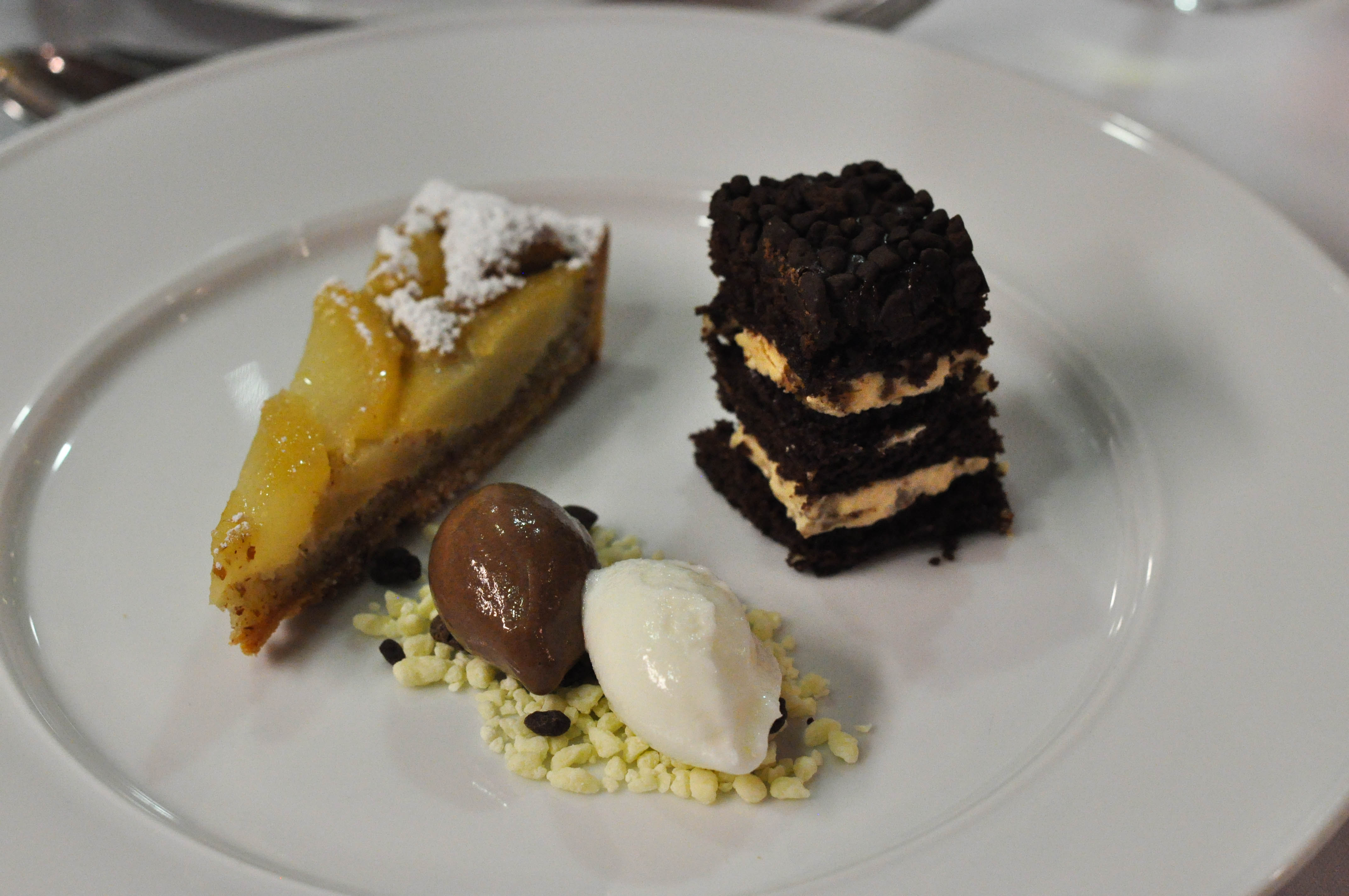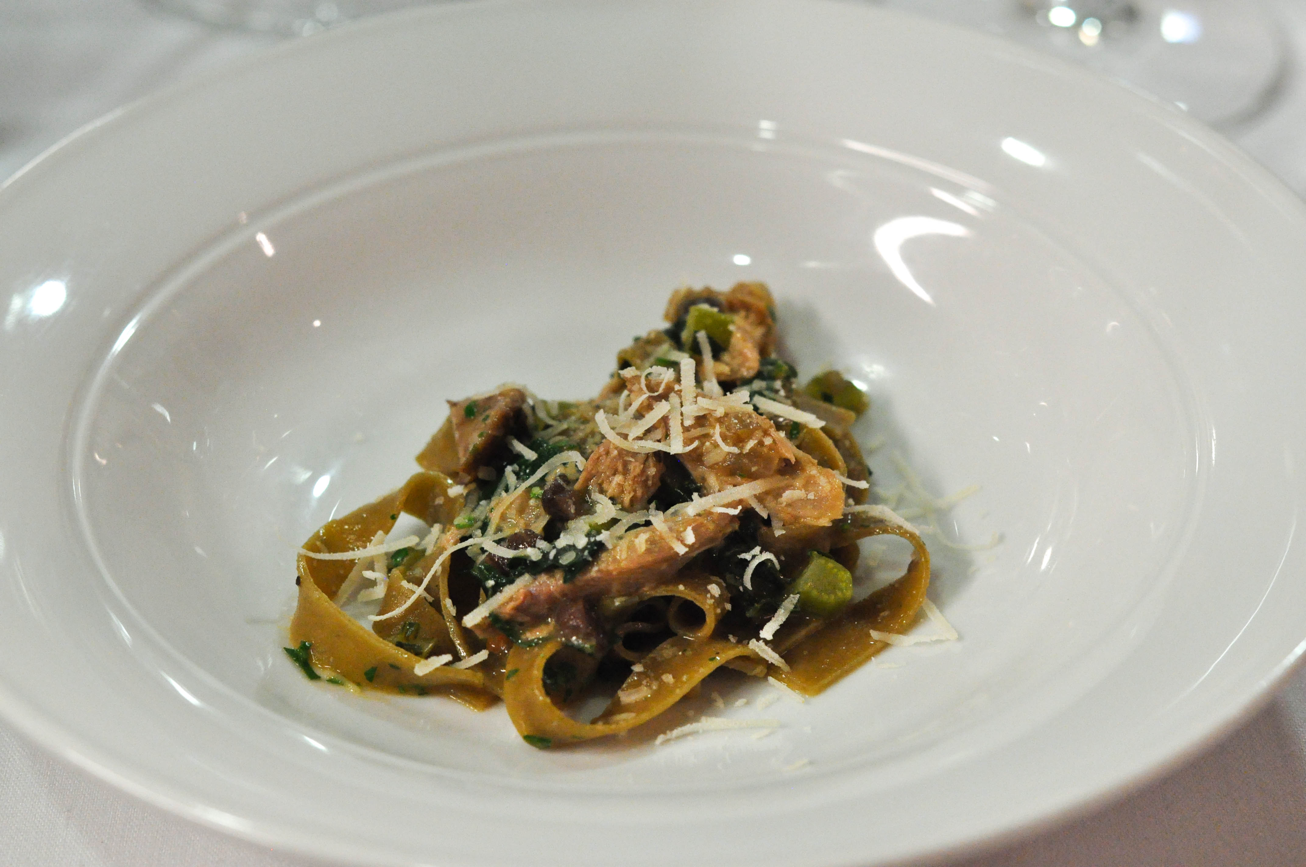 The pork loin was intended to be the last savory course, but I decided I wasn’t quite ready for that moment and asked if we could try ‘Tagliatelle ai Porcini’ with Duck Ragu and Spigarello Kale. Within mere moments, The Bro and I were served fresh, porcini infused pasta covered with a rich duck sauce, along with a glass of deep, dark purple, smoky, dried berry and twig flavored Monti Garbi Ripasso from Valpolicella by Tenuta Sant’Antonio. Certainly not the best expression of the region and style, but a more than serviceable partner for the tagliatelle.