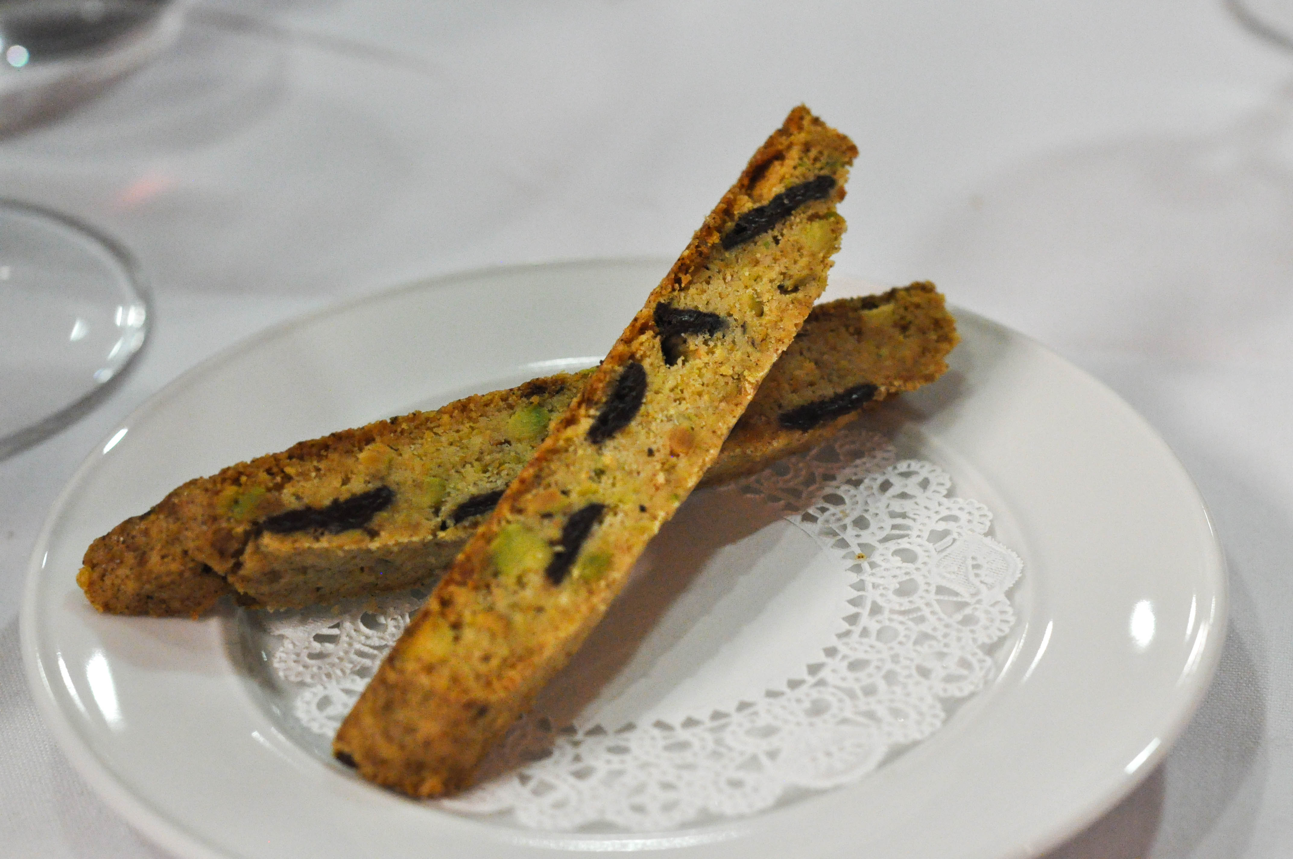 For the sweeter side, we were given a sample of a few desserts: chocolate cake, two gelato flavors, and a fruit tart. Also, a passionfruit chocolate. And, by my request, a few biscotti. The effects that alcohol sometimes has on ones memory seemed to have erased any specific mental notes I may have taken with regard to these bites. Though the boozy side of things I recall keenly.