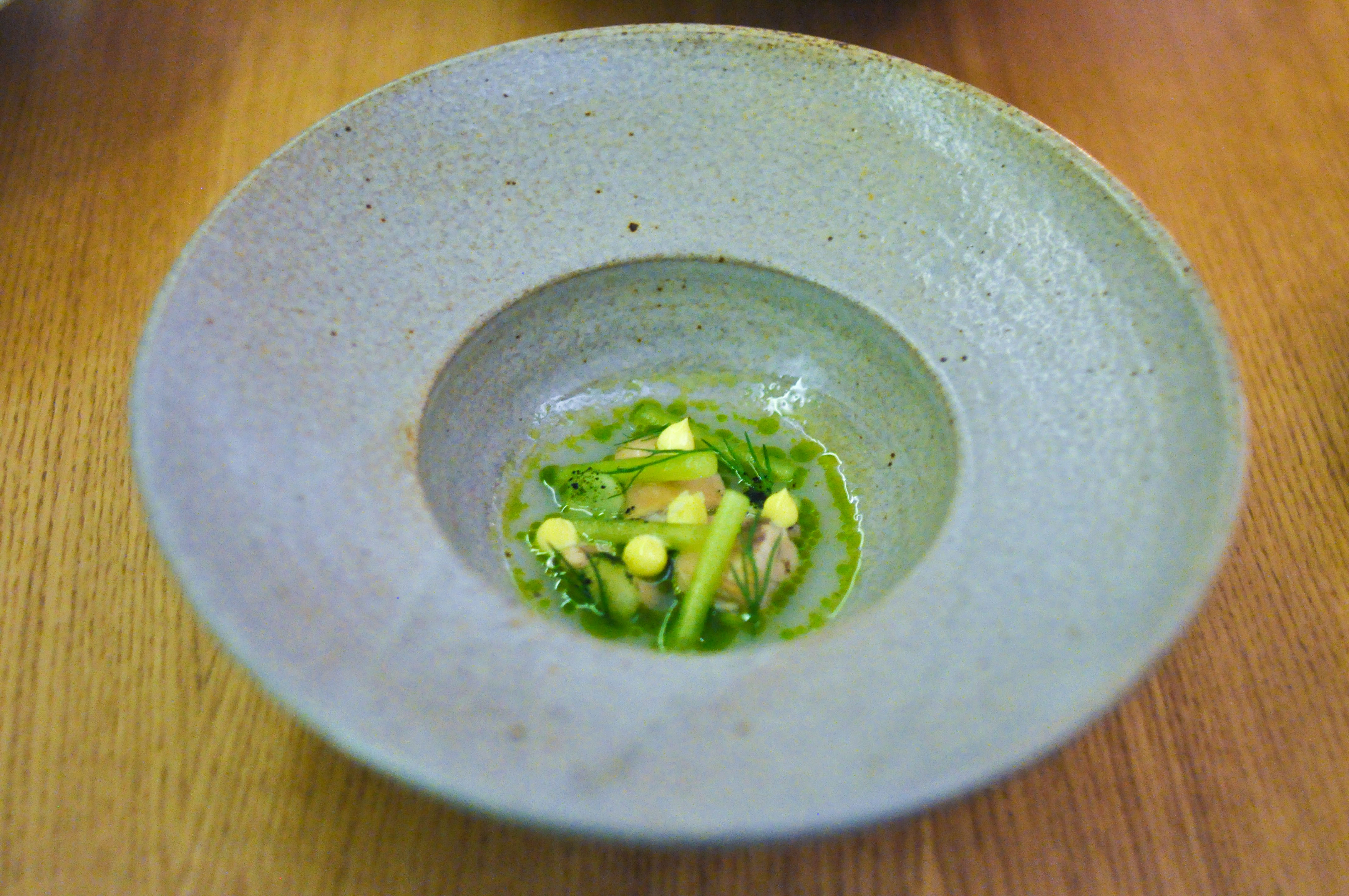 Oyster, cucumber, rapeseed. A nice opener, Rhode Island oysters. The cucumber was great for a fresh balance to the brine of the oyster.