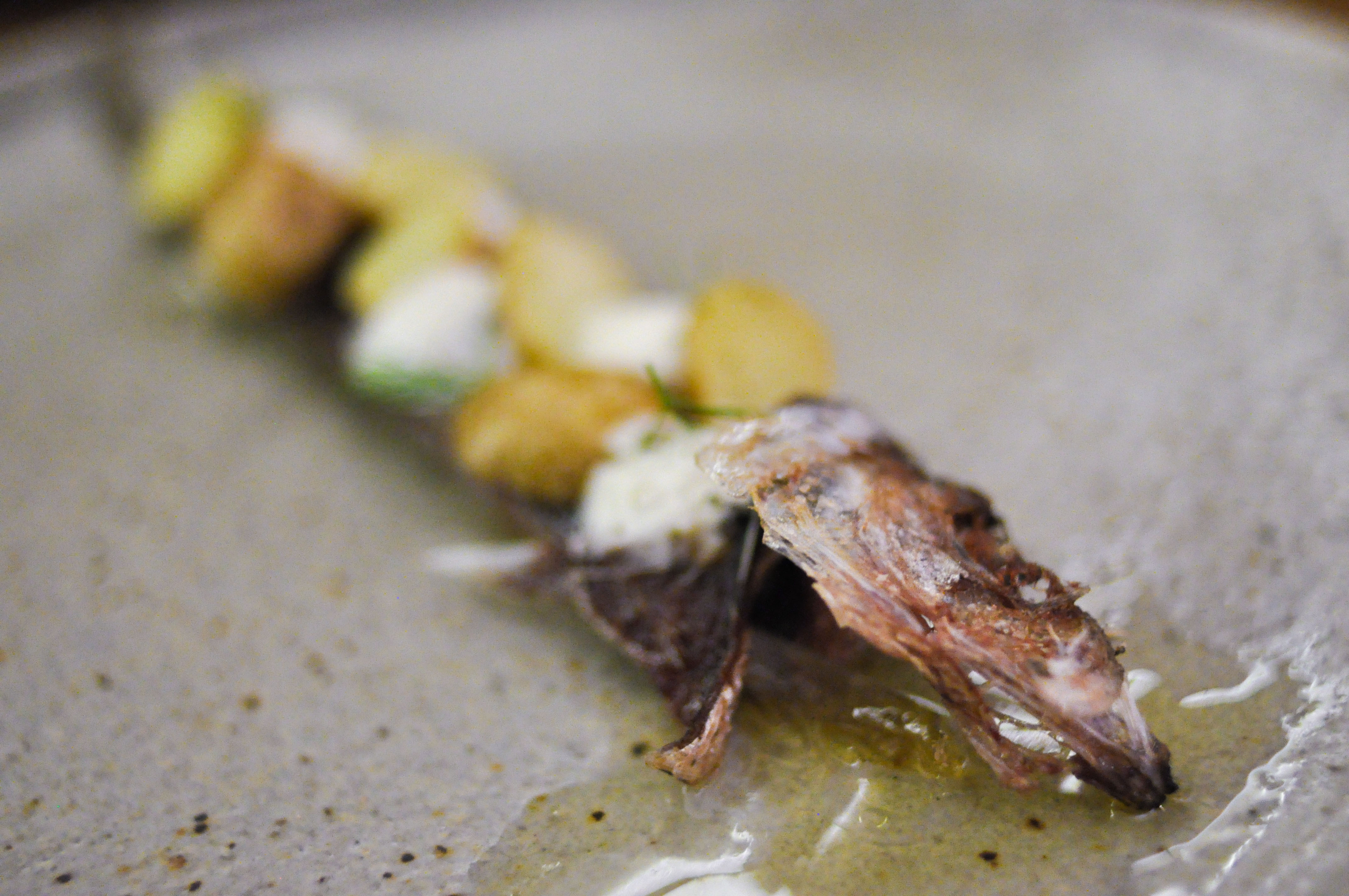 Herring, potato, juniper. A delicious fish. Delightfully crispy head and tail. Served with a shot of aquavit, onion juice, and whey. I thought the pairing was bad ass. Distinctively Scandinavian.