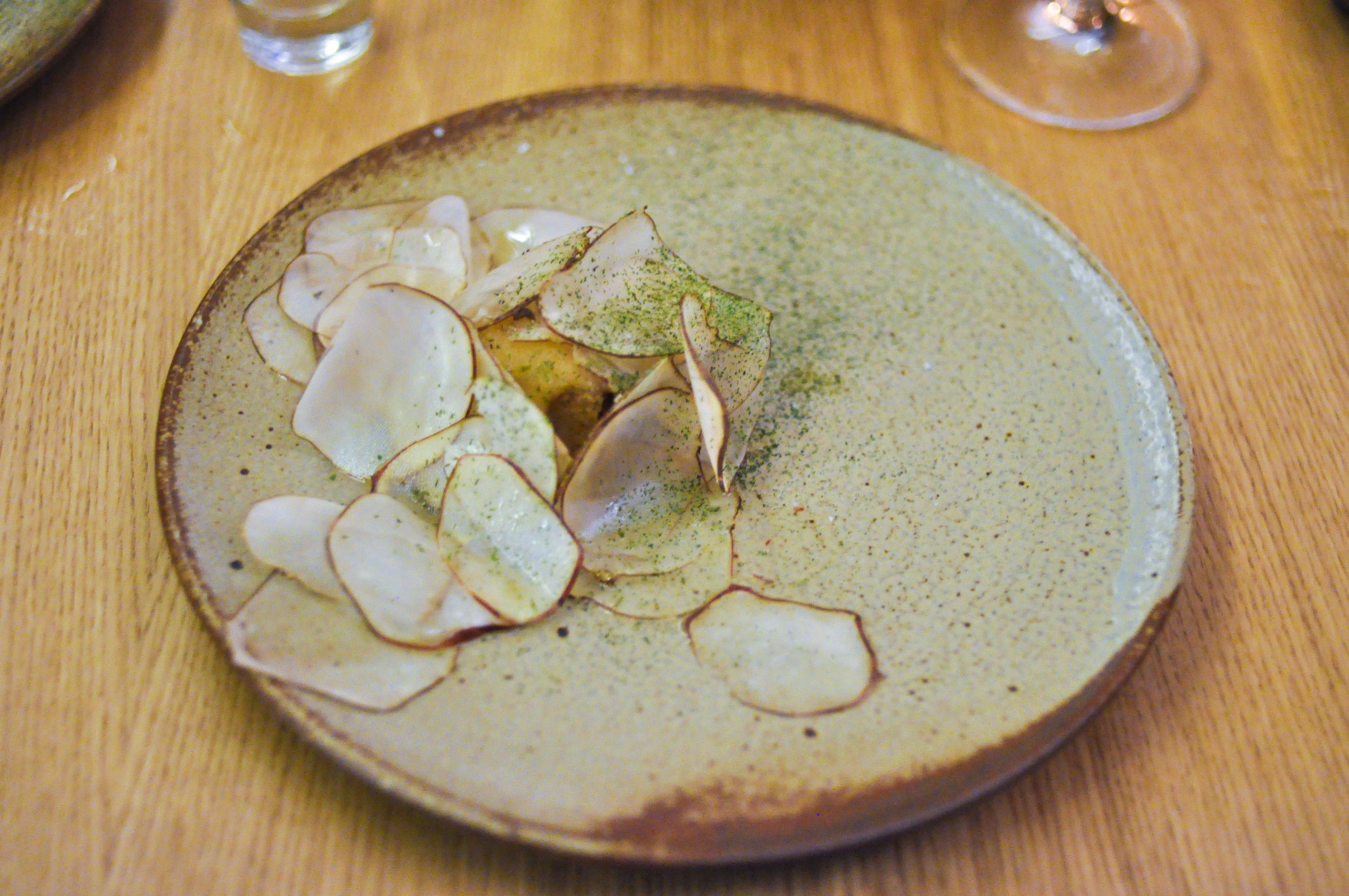 Sunchoke, trotter, apple. Crispy trotter with apple puree, raw sunchoke, and woodruff powder. The dynamic was nice between the pork richness, the sweet acidic apple, and the raw root earthiness.