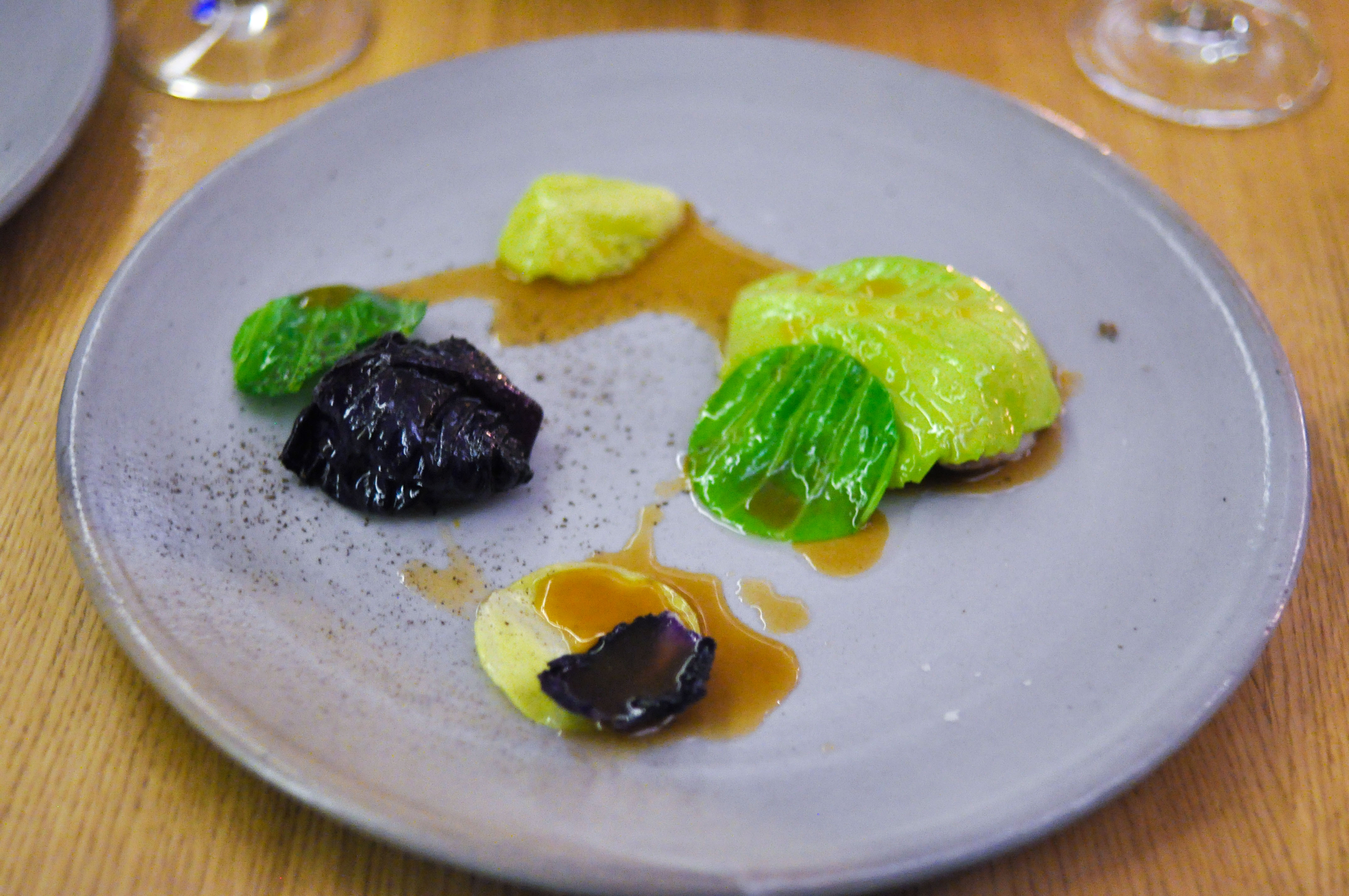 Monkfish, cabbage, bay leaf. What at first looks like a plate of cabbage leaves, punches, and puree, reveals a cut of monkfish and its liver. A pretty strong contrast melded together with a sauce of pork & monkfish stock with bay leaf and rose hip.