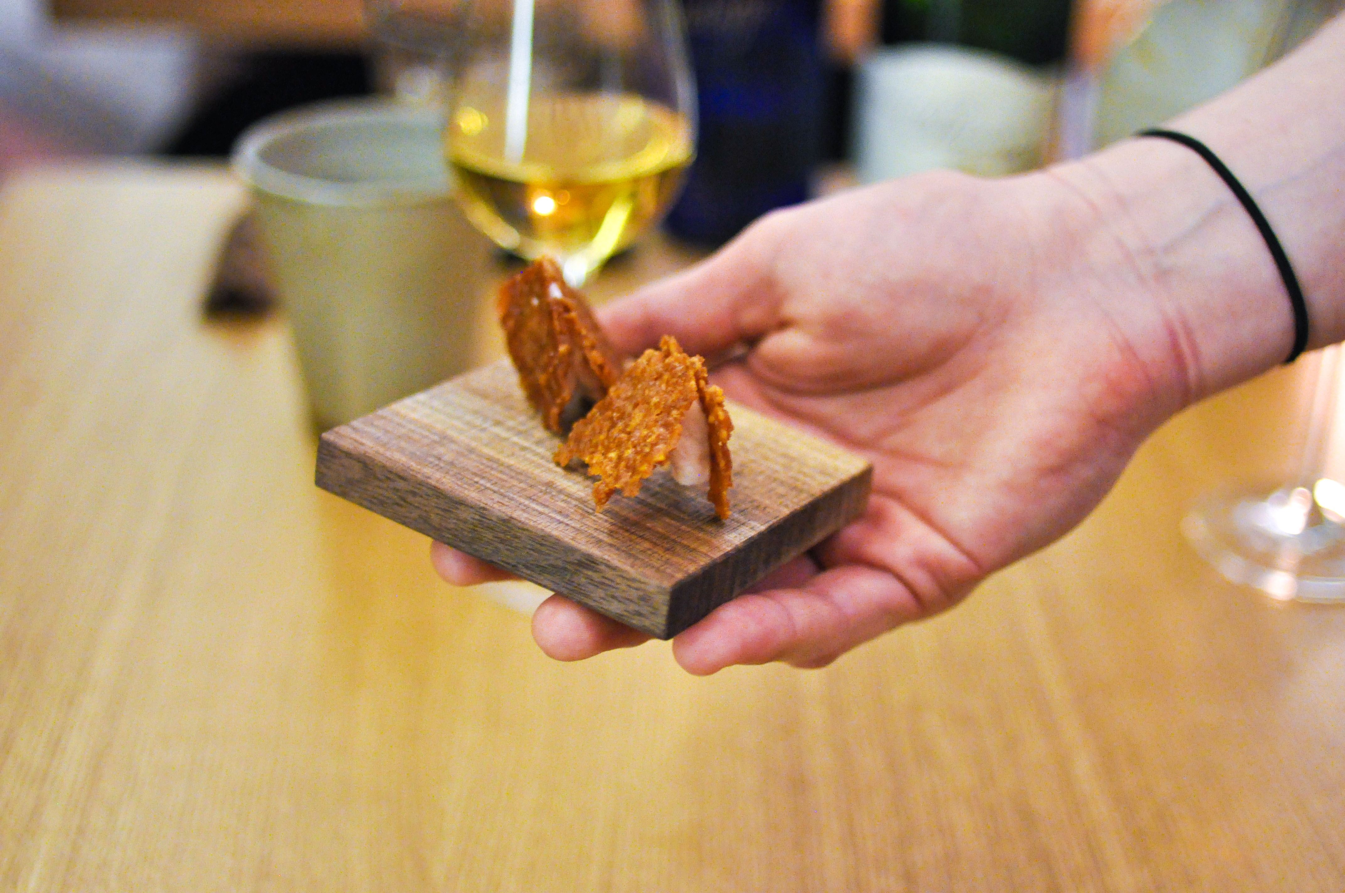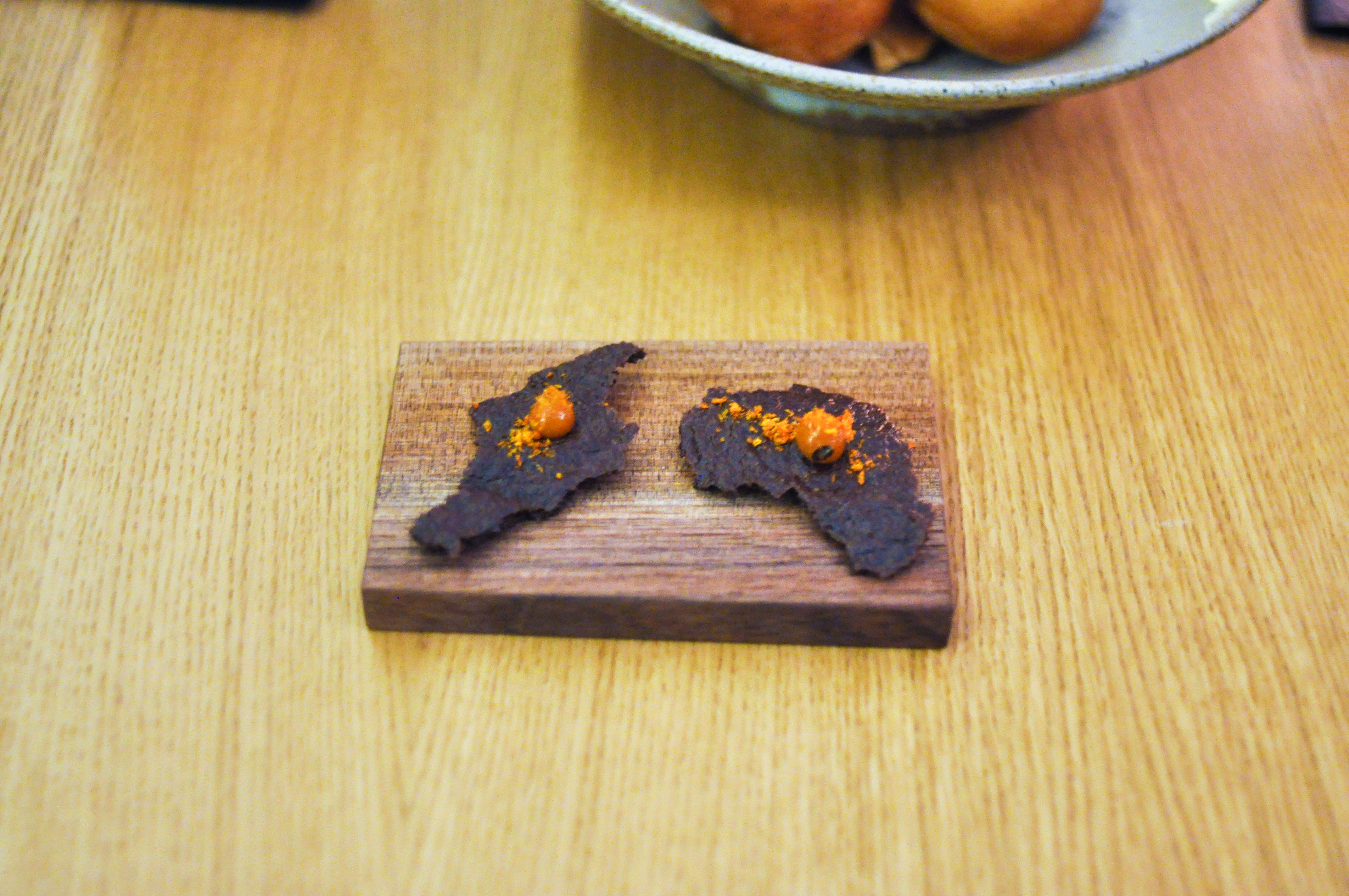Pig blood chip with sea buckthorn berry. How very Nordic. Tart berries with dry, bitter bloodiness.