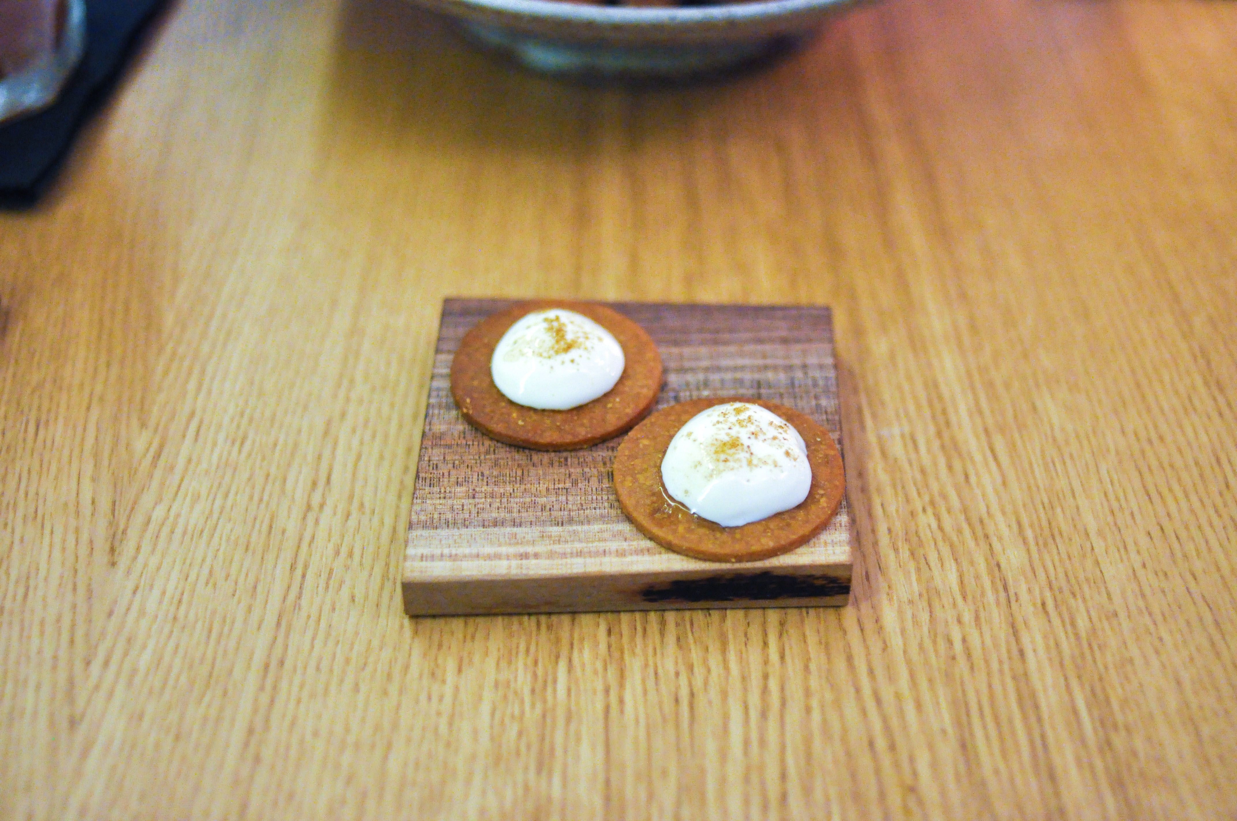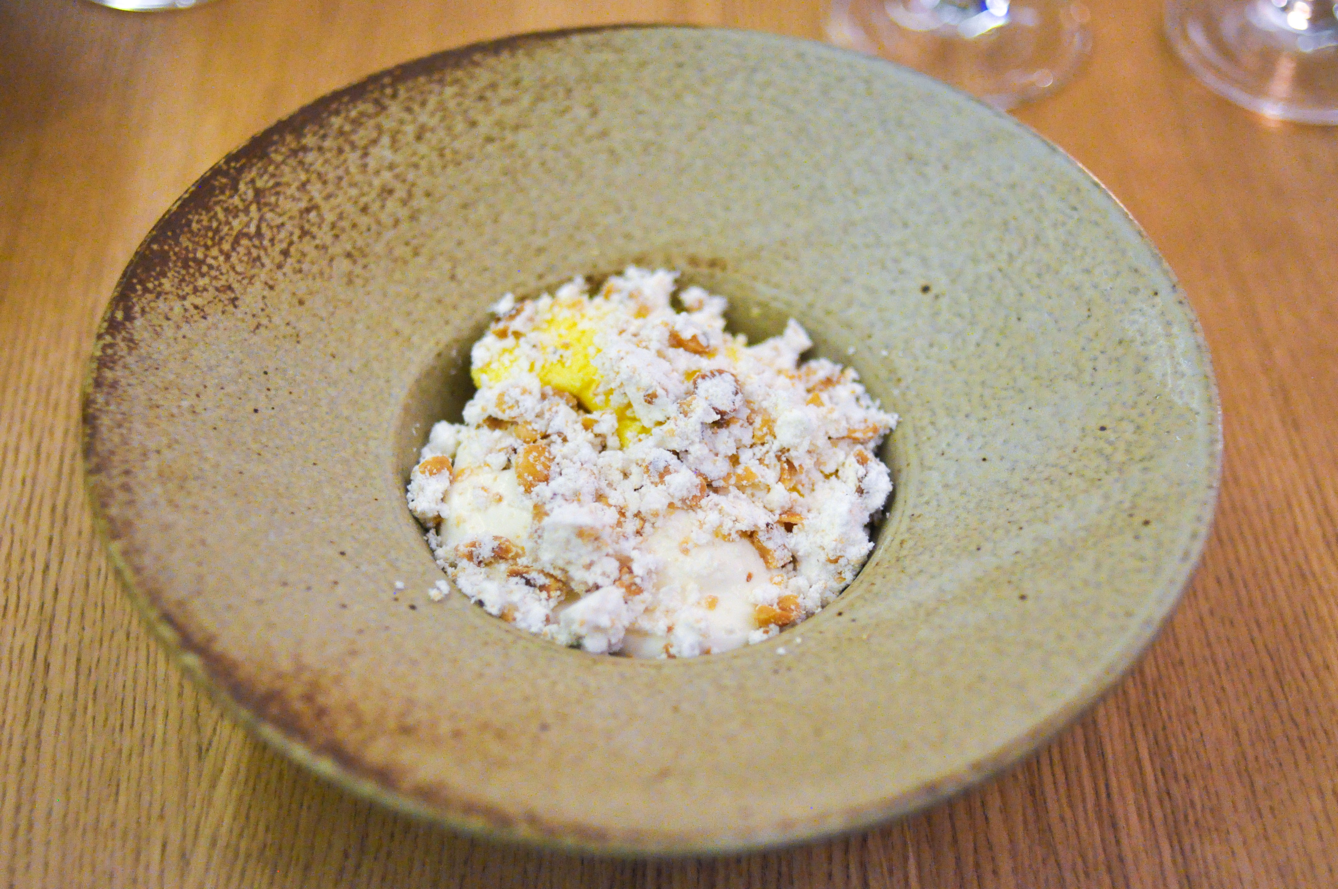 A little pre-dessert of frozen whey, lingonberry, oat chip. These little guys were amazing.