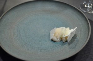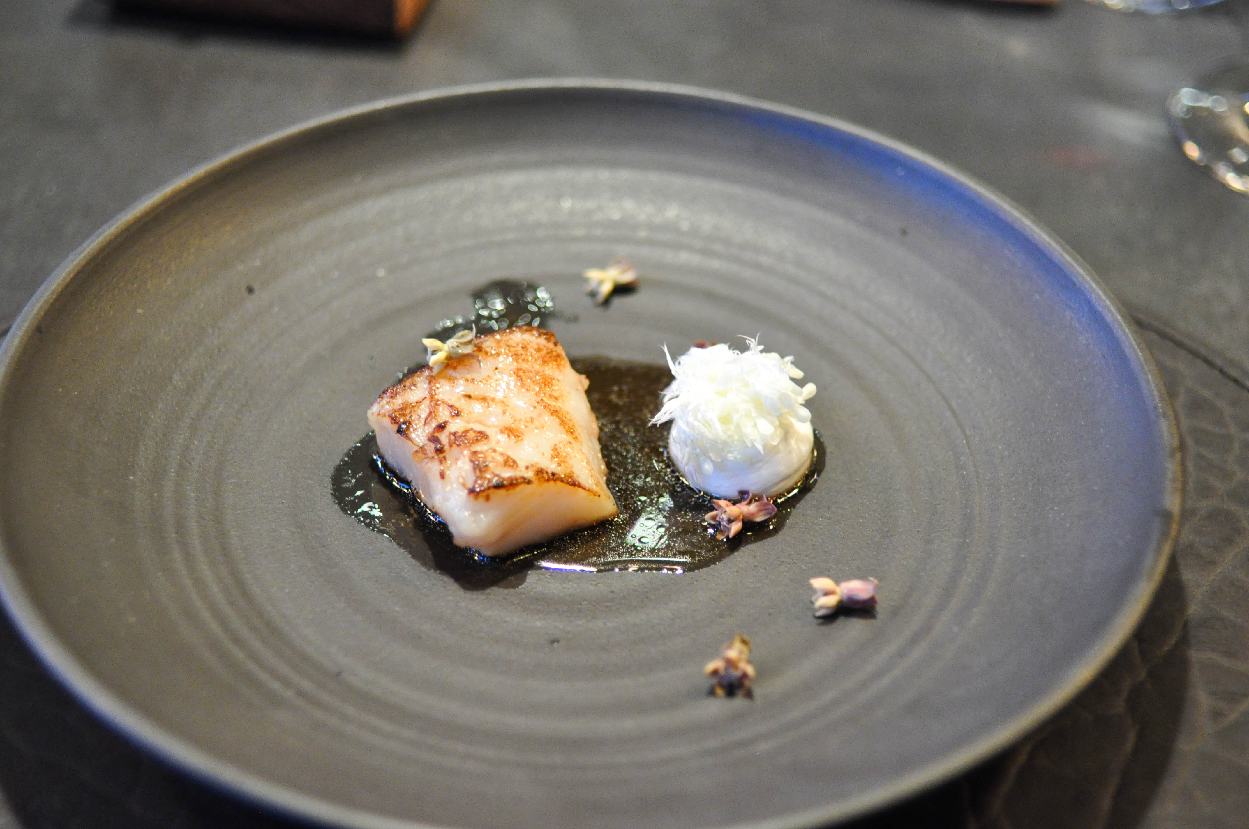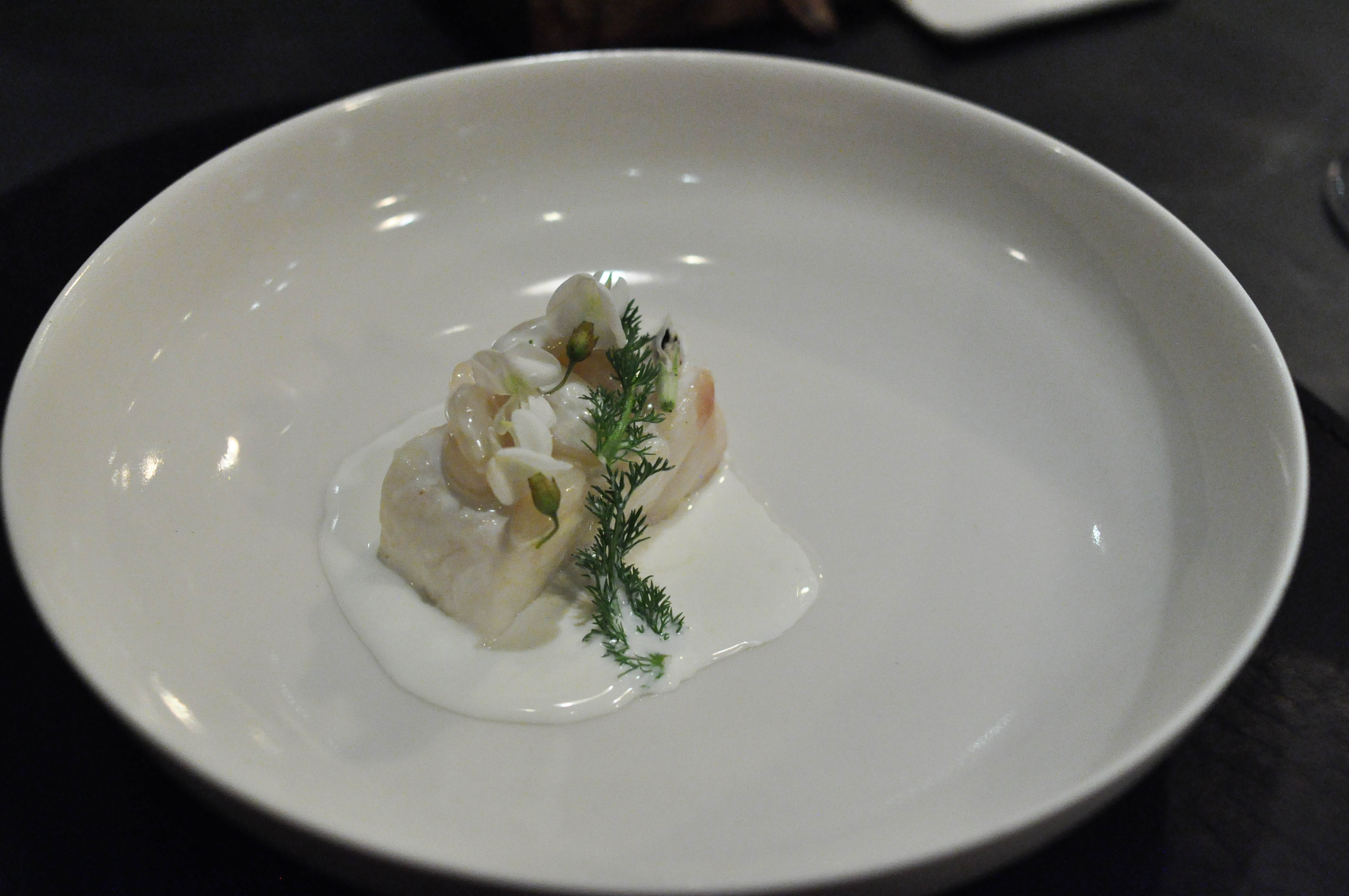 7th Course: North Coast Halibut. Young Garlic, Whey.