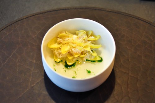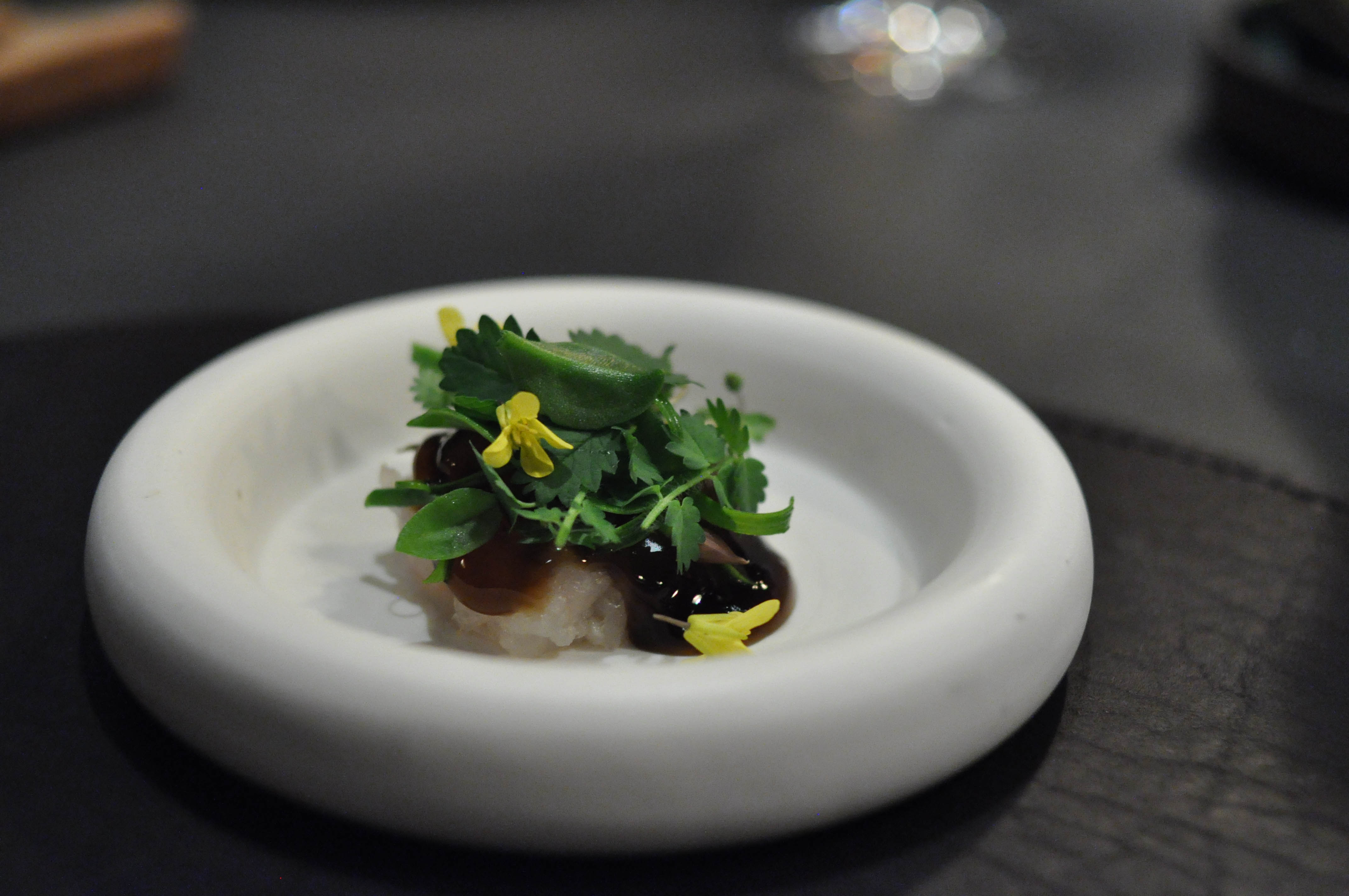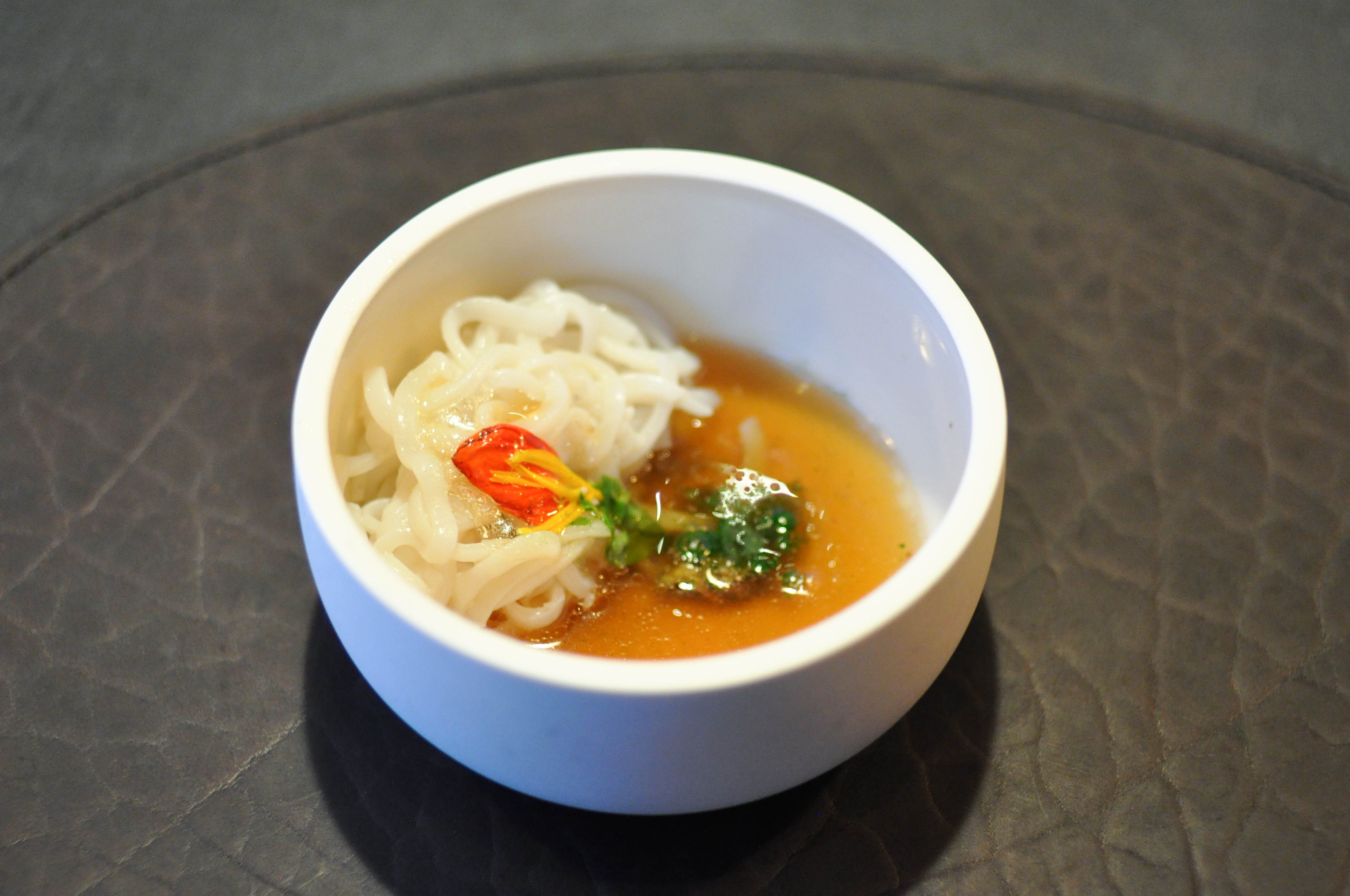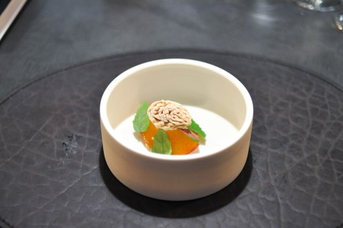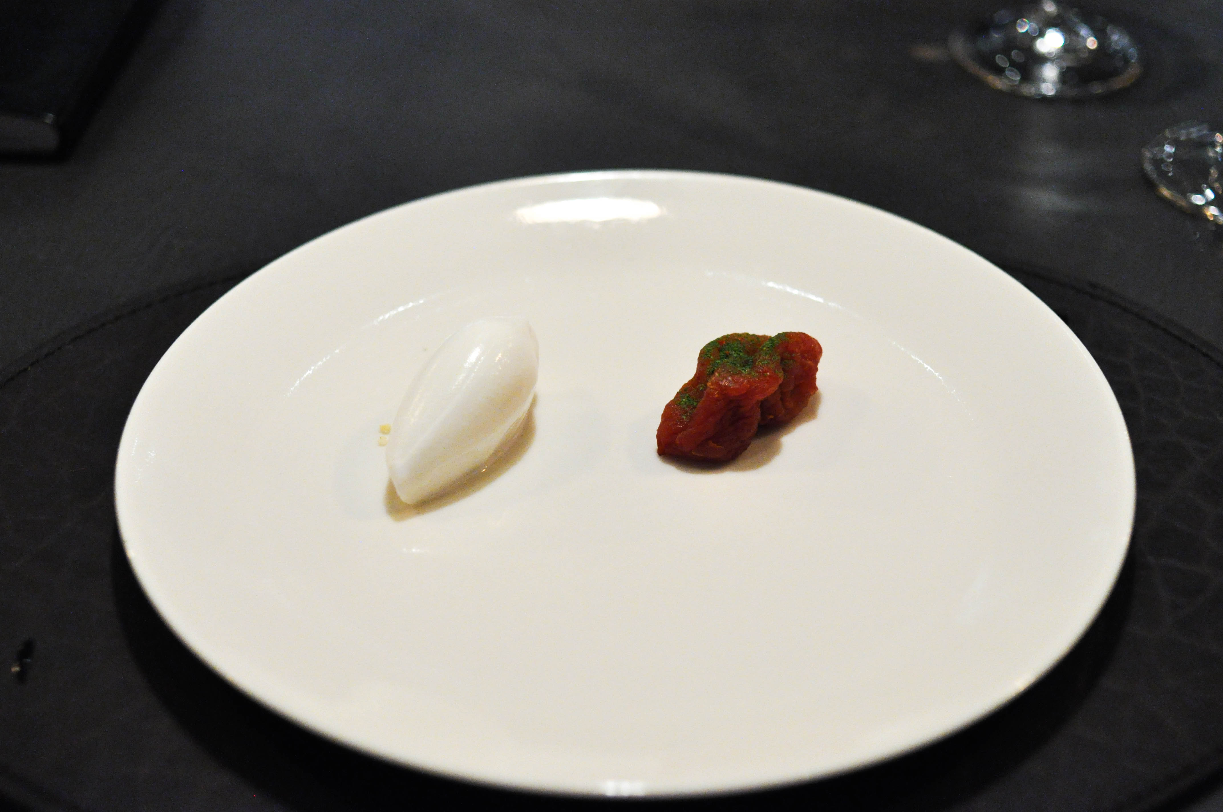 Smoked Tomato Ice, Fresh Sea Urchin, Shallot Oil. I’m actually not sure if this was intended as part of the snacks or as the first course. Since it wasn’t printed on my menu, I’m putting it with the snacks. Either way, this was amazing. Nice, smoky aroma. Delicate, chilled urchin. Beautiful balance, spot-on umami.