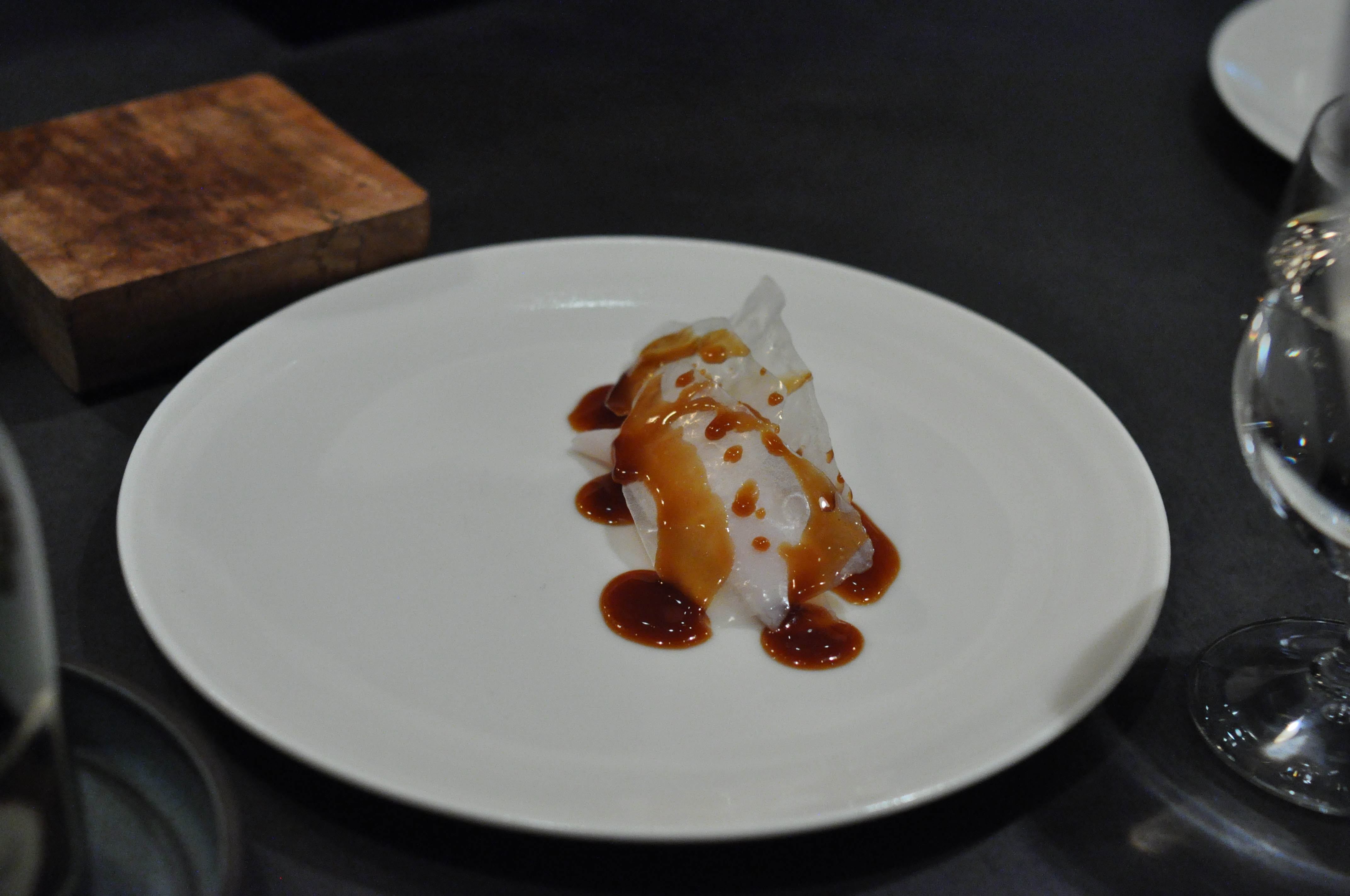 5th Course: “Ramen”. Salad Burnet. Noodles, shallots, dissolving spice packet, chicken bouillon. Though this wasn’t presented as a Mugaritz-style ‘Guess what it is?’ mystery, I was left on my own to figure out the noodles were made from squid, which wasn’t that tough to do. The squid was lightly blanched with a nice density. This bowl had lots of savory punch without being in-your-face salty.