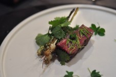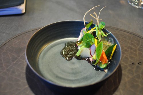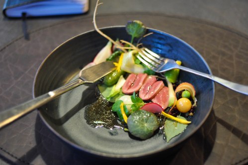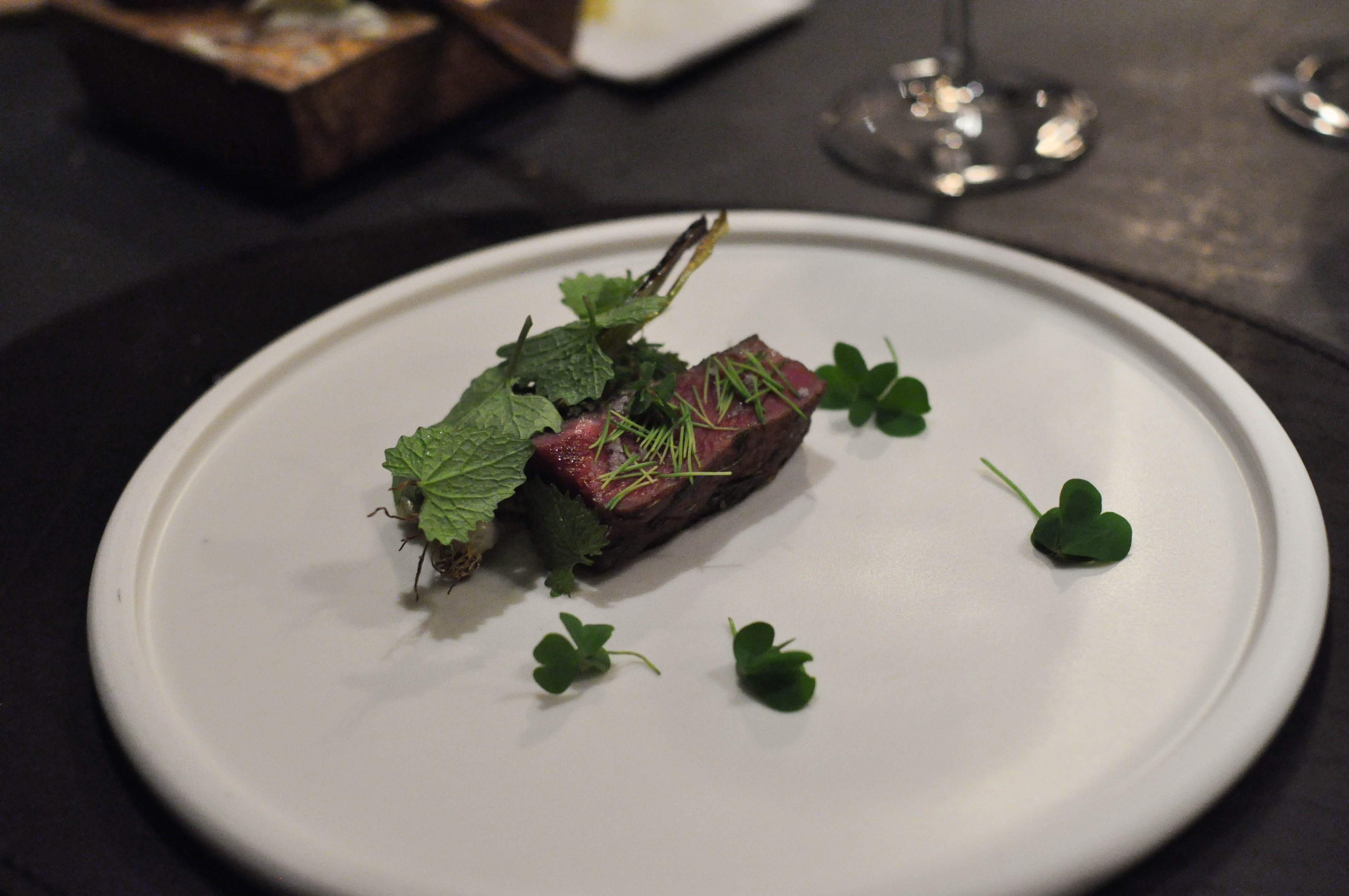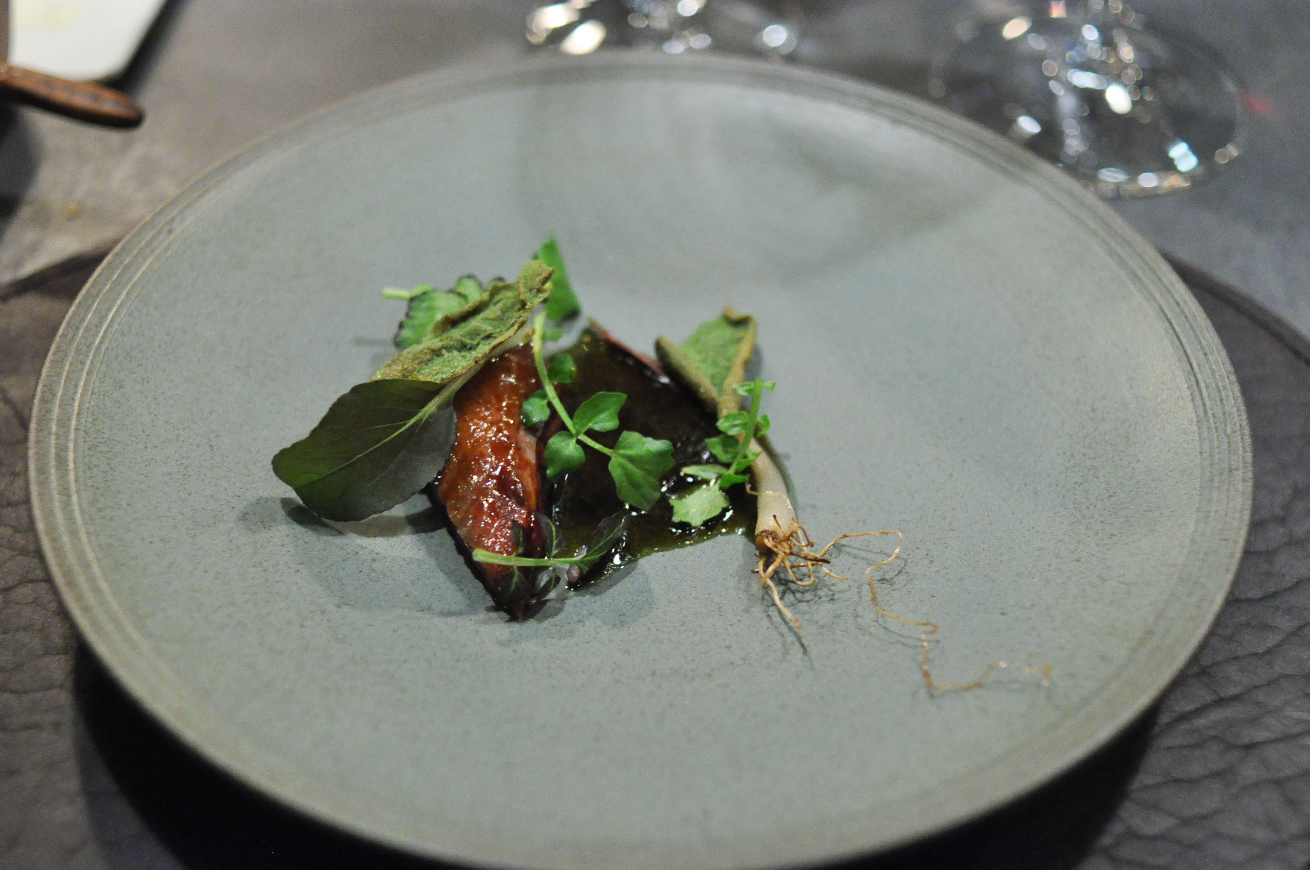 4th Course: Seared Duck Hearts. Nasturtium. Tender Young Vegetables. Blanched roots and vegetables with herbs. Mushroom vinaigrette, with sunflower oil and fish sauce. Pastrami-cured duck hearts. Amazing. There was a couple dozen different veggies, leaves, petals, roots, and alliums, all individually treated or barely touched. Every bite was fresh and different. It was like eating Michel Bras’ famous Gargouillou, with the bonus of the superb duck hearts.