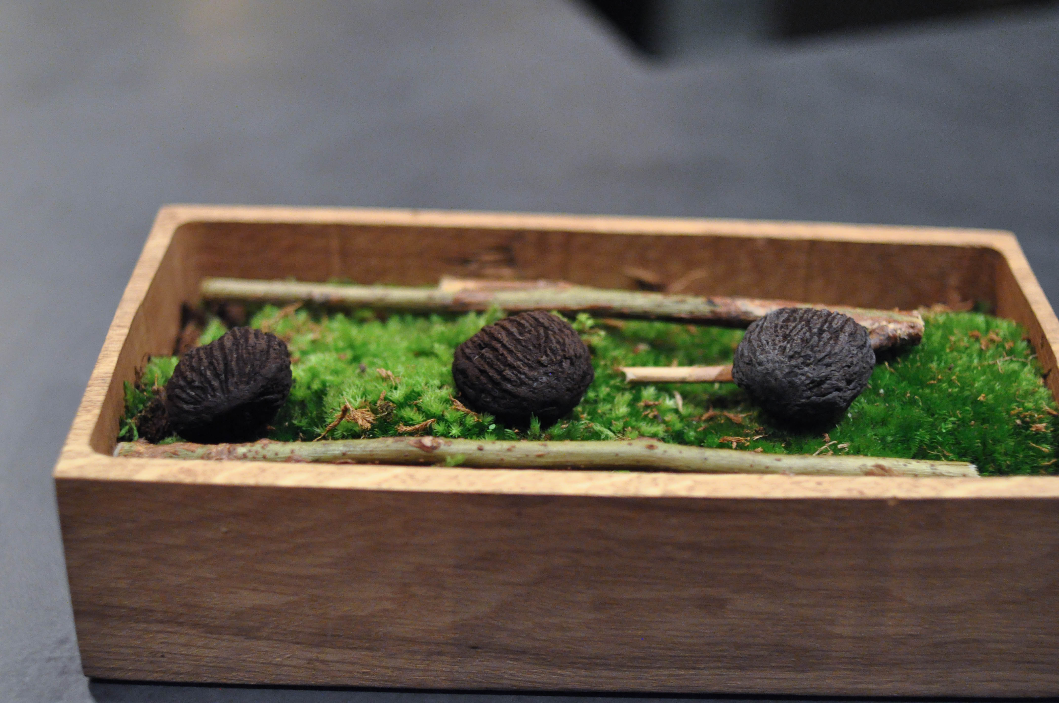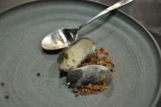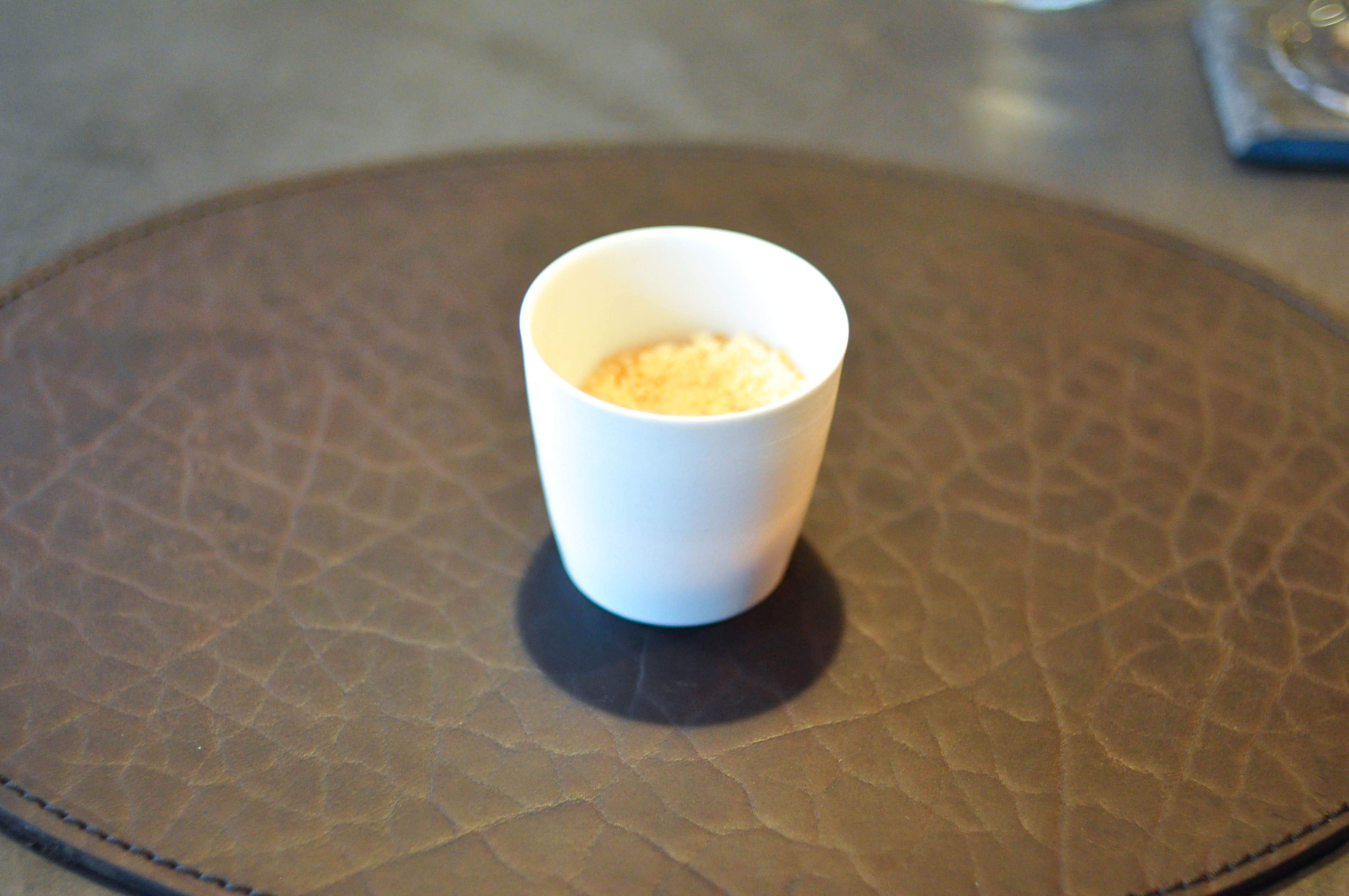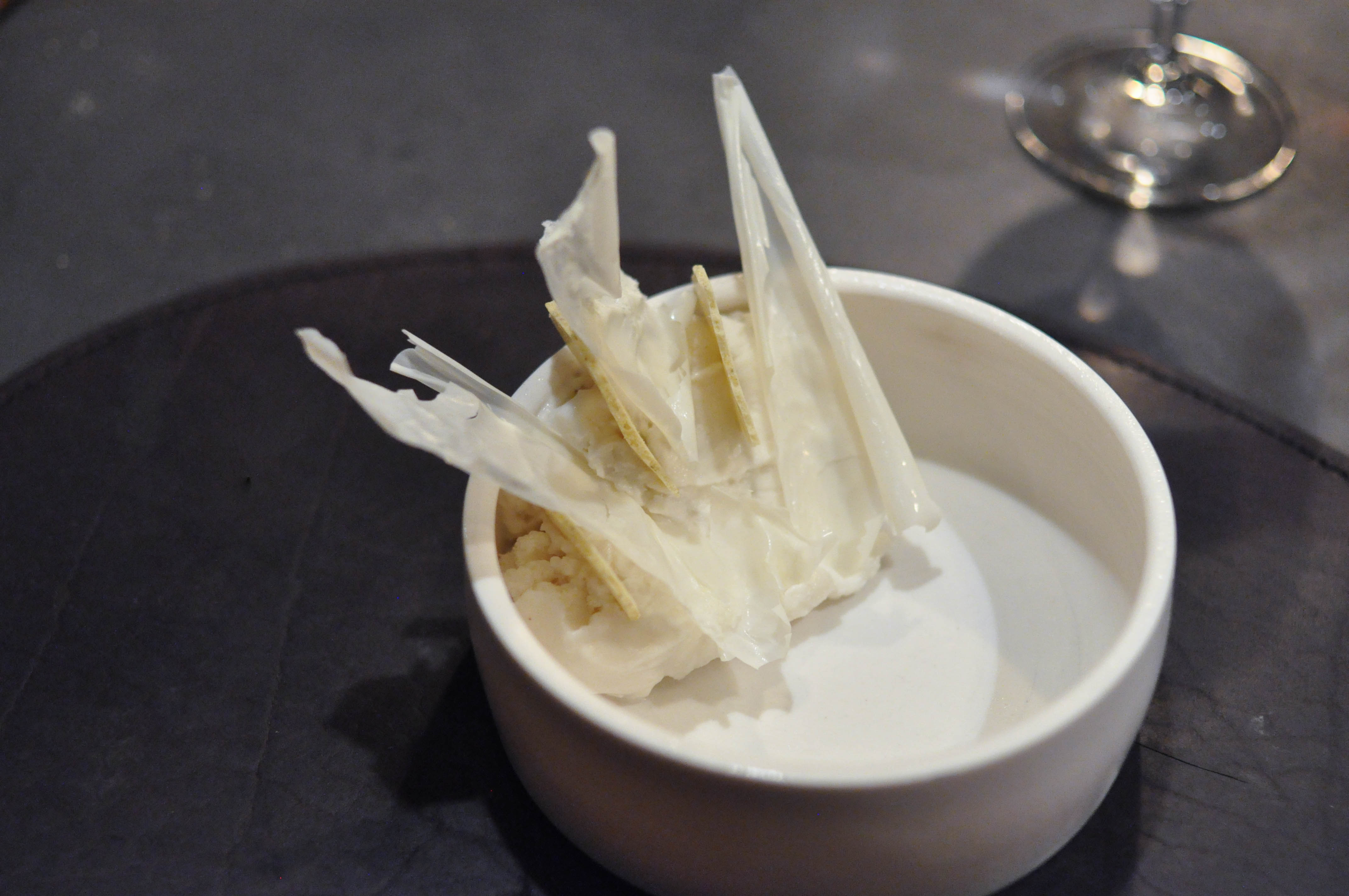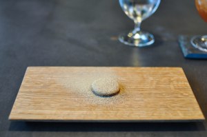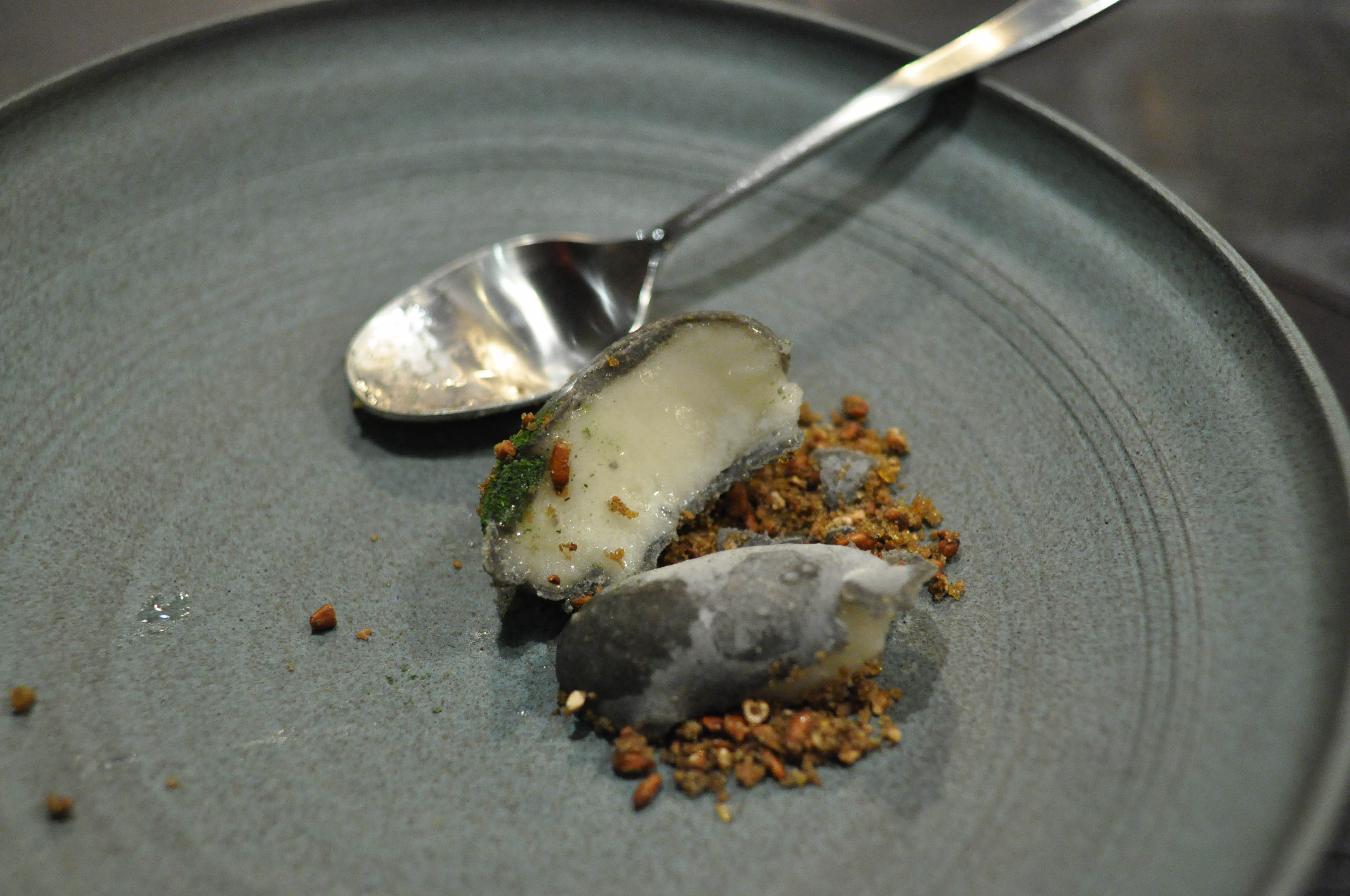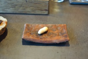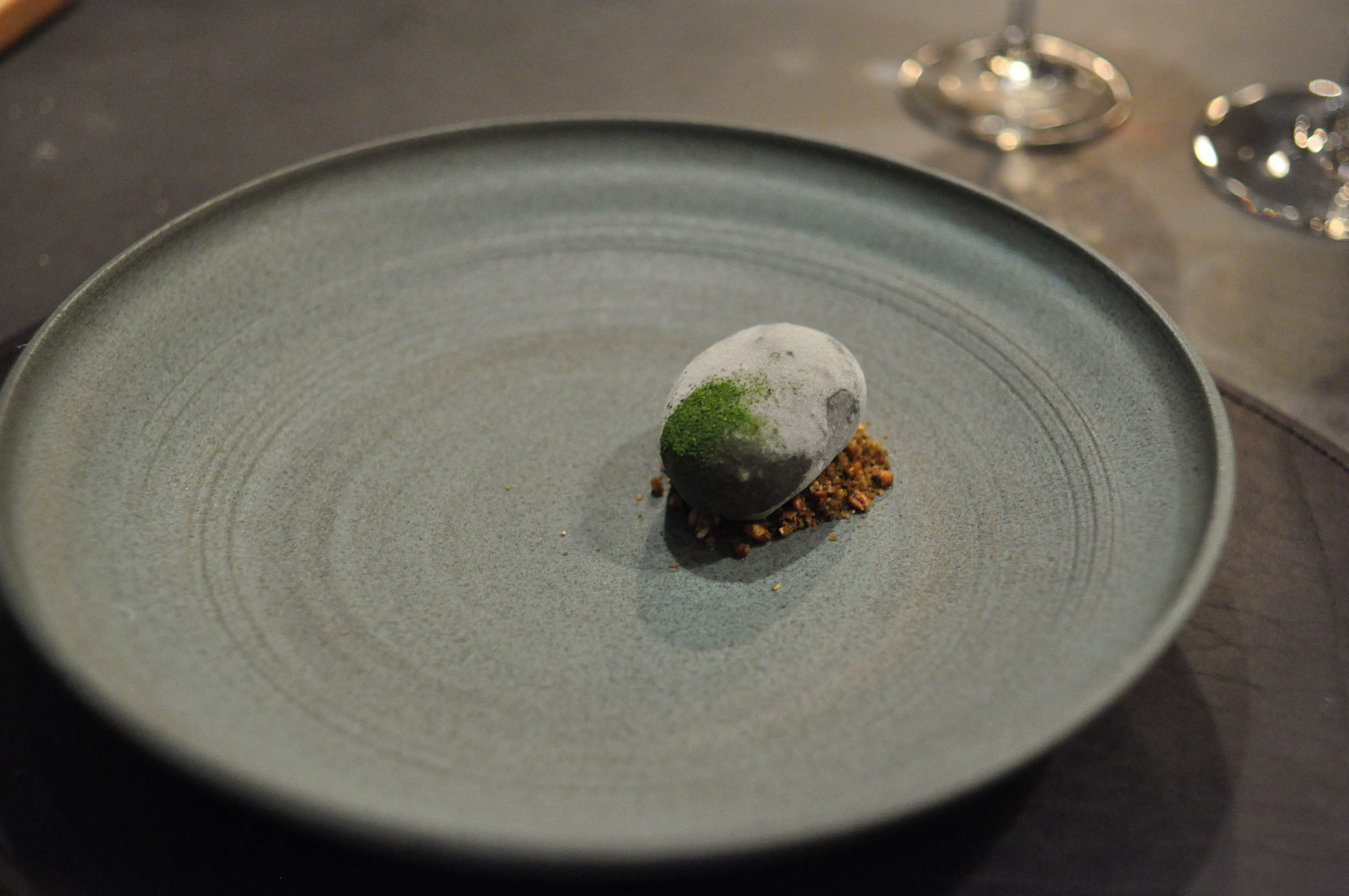 Flaxseed Cookie, Pine Nut Butter, Dried Mushroom. Served cold, the cookie was crisp and crunchy, with a little sweetness, and a light earthiness from the mushroom.