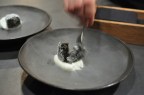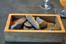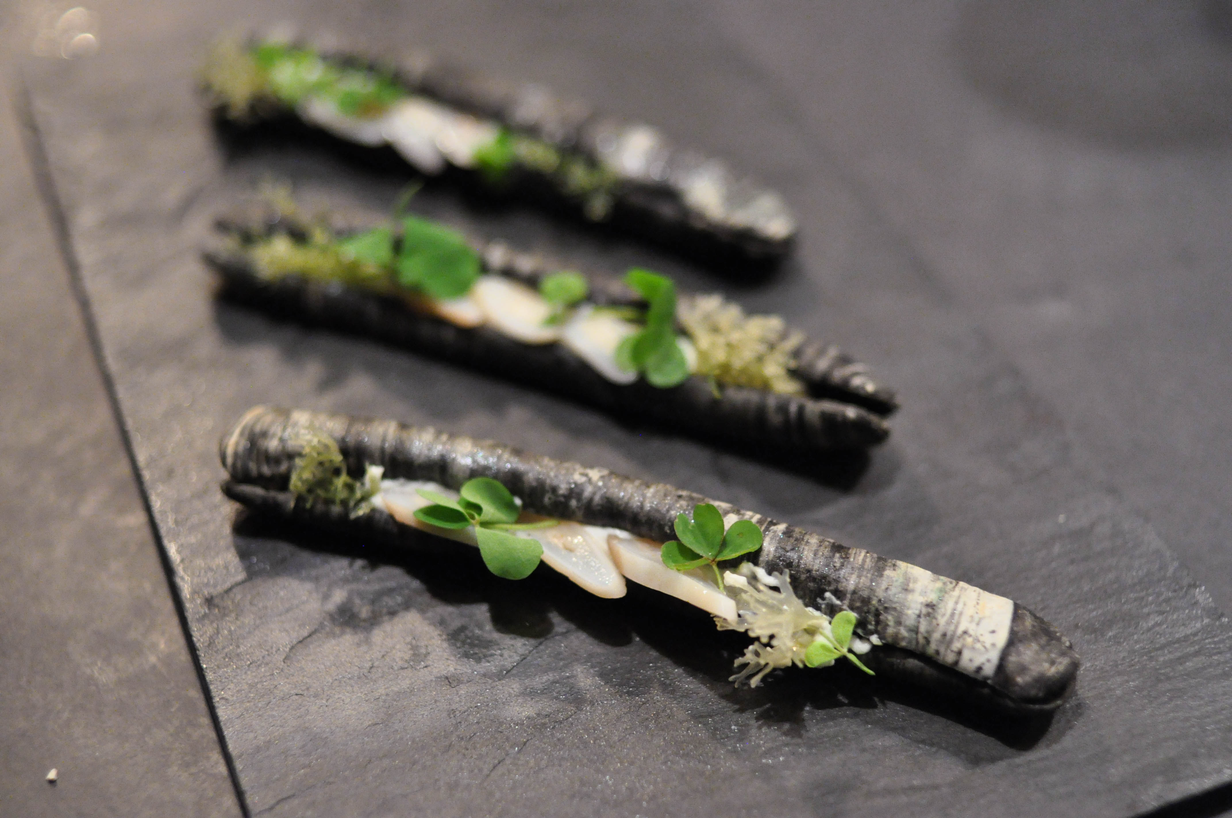 Snacks: ‘Whole Razor Clams’. Razor clam mousseline, poached razor clams, seaweed, baguette painted with squid ink.