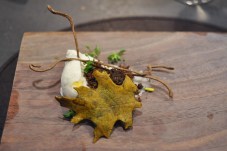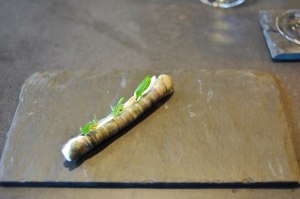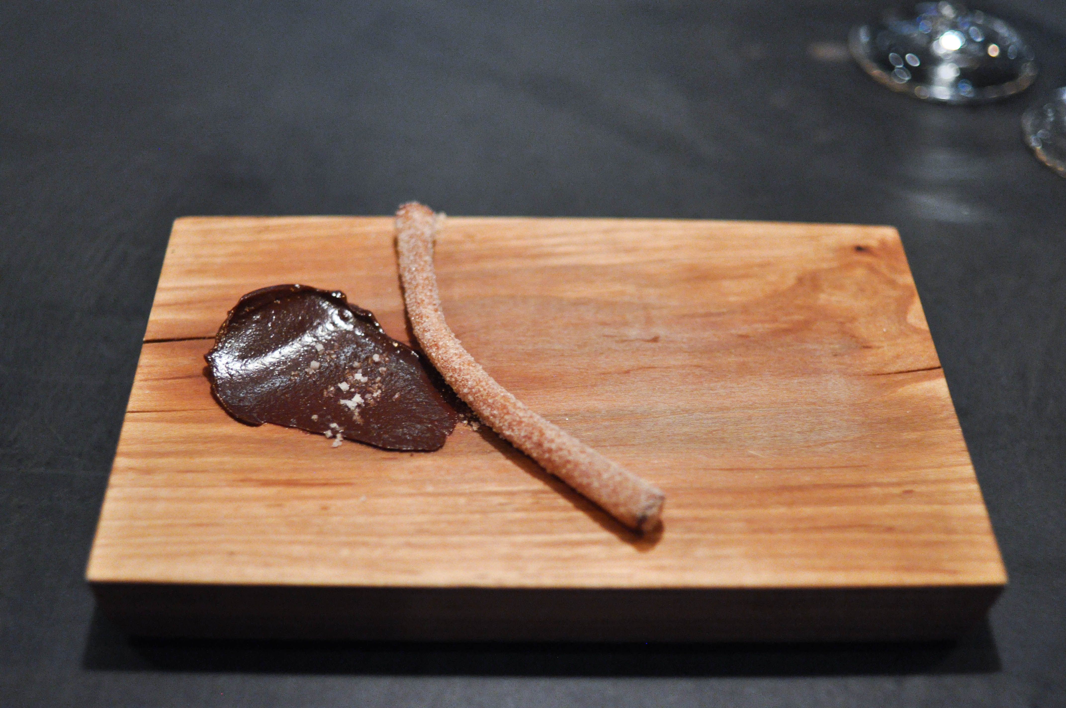 15th Course: Churro. White Cardamom. Salsify, Cinnamon. A salsify ‘churro’ rolled with cinnamon, sugar, and white cardamom. Served with salted hazelnut chocolate. A nice rendition of the Spanish classic. Nice nutty savoriness.
