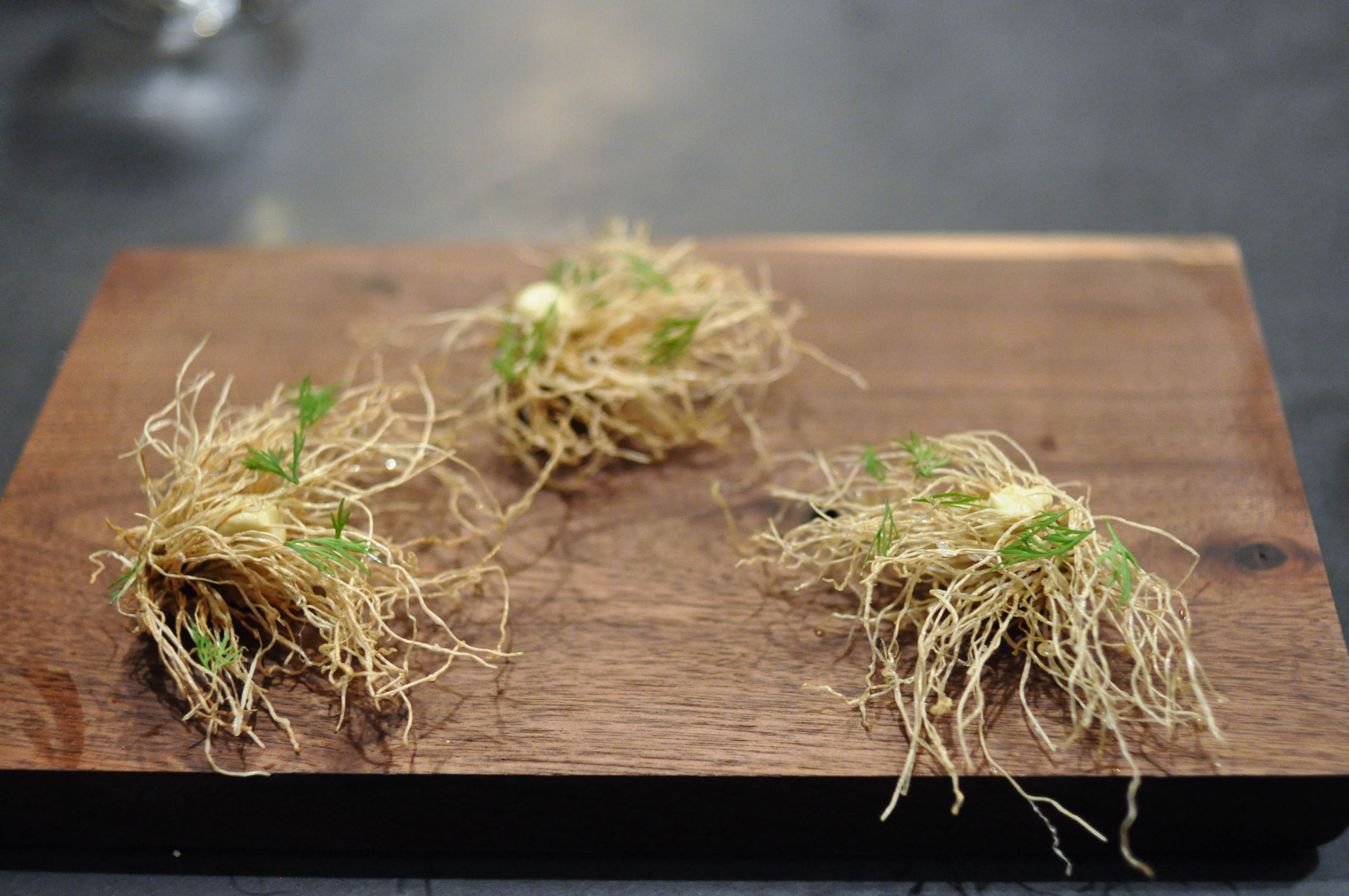 Snacks: Spring Garlic Roots, Garlic Aioli, Dill.