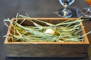 7th Course: Brined Hake. Milkweed. Wildflower Honey, Yogurt. A nicely treated, honey-brined piece of Hake. Nice flavors, good balance, and a little dance on the palate. While this had no faults, it wasn’t a huge wow.