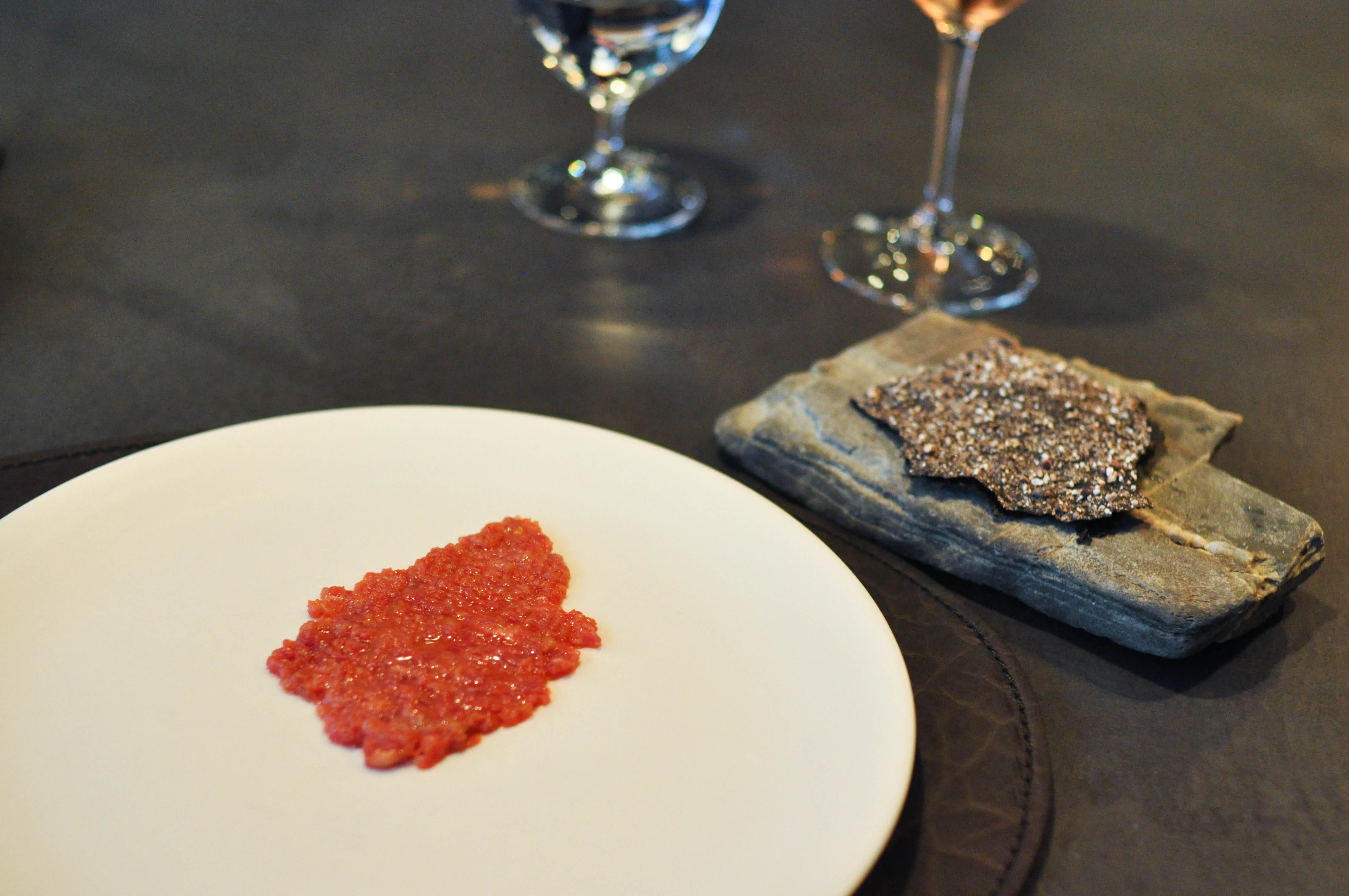 3rd Course: Lamb Tartare. Wood Sorrel. Smoked Tomato. The smoked Beefsteak Tomato was a wonderful compliment to the tartare. The black malt cracker tasted like a space-age Triscuit, and made a great vessel.