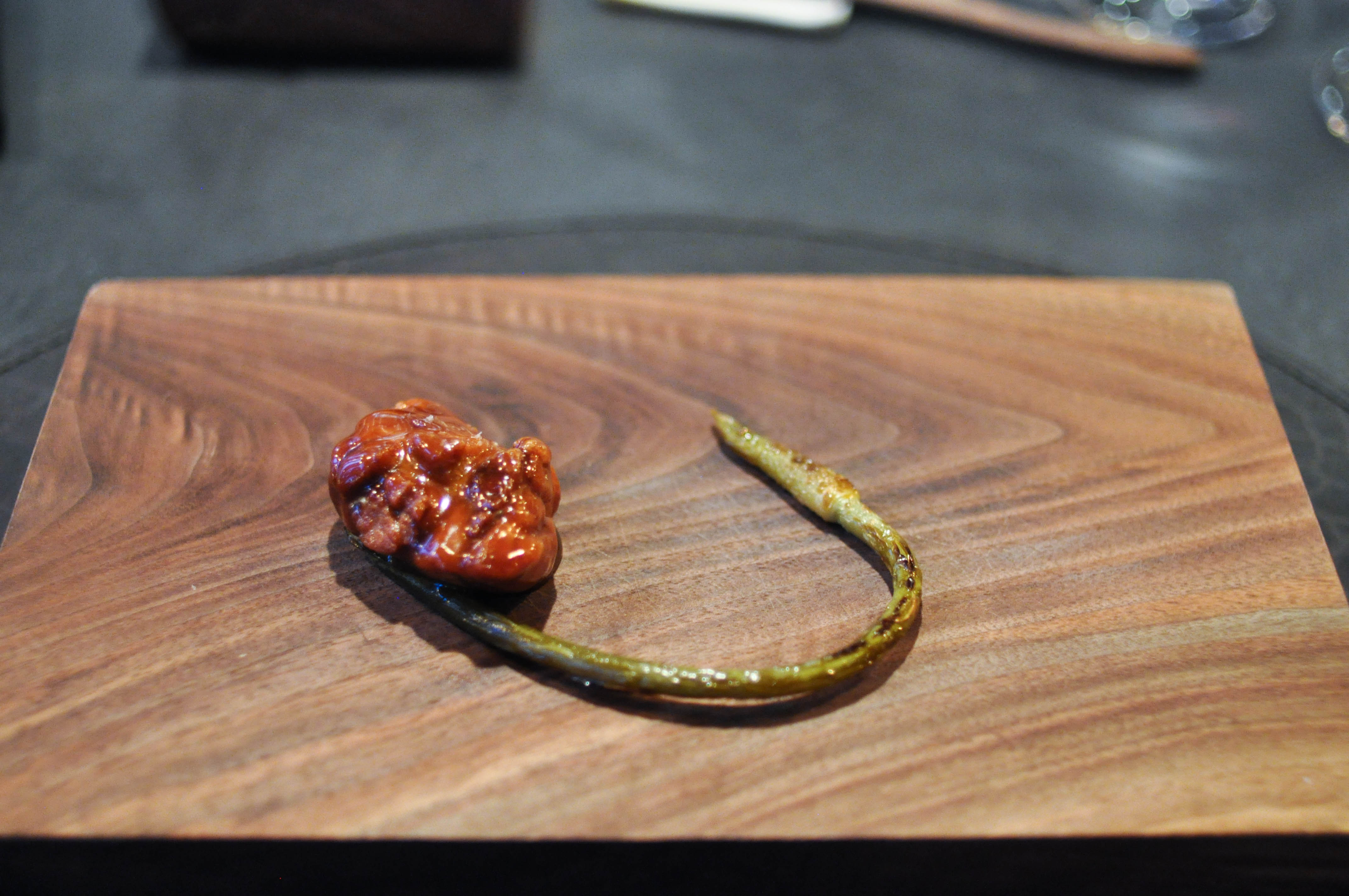 8th Course: Barbequed Veal Sweetbreads. Garlic Scape. Hazelnut. The sweetbreads were in a spiced veal demiglace and hazelnut sauce that was lick-the-board good. The garlic scape was pickled and seared. This reminded me of a dish one might find at Mugaritz, with the two complementing/contrasting elements on the plate. A dynamic, almost transcendent back-and-forth. This is in a toss-up with the dried beet and the vegetables with duck hearts for my favorite of the night.