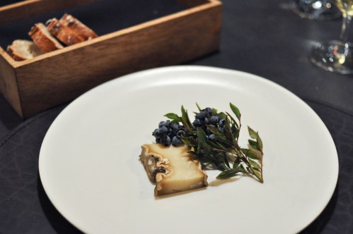 10th Course: Square Cheese. 80-day raw goat’s milk cheese from Twig Farm in Vermont. With blueberries and apple bread. Semi-soft and rustic, a nice choice for a single cheese plate.