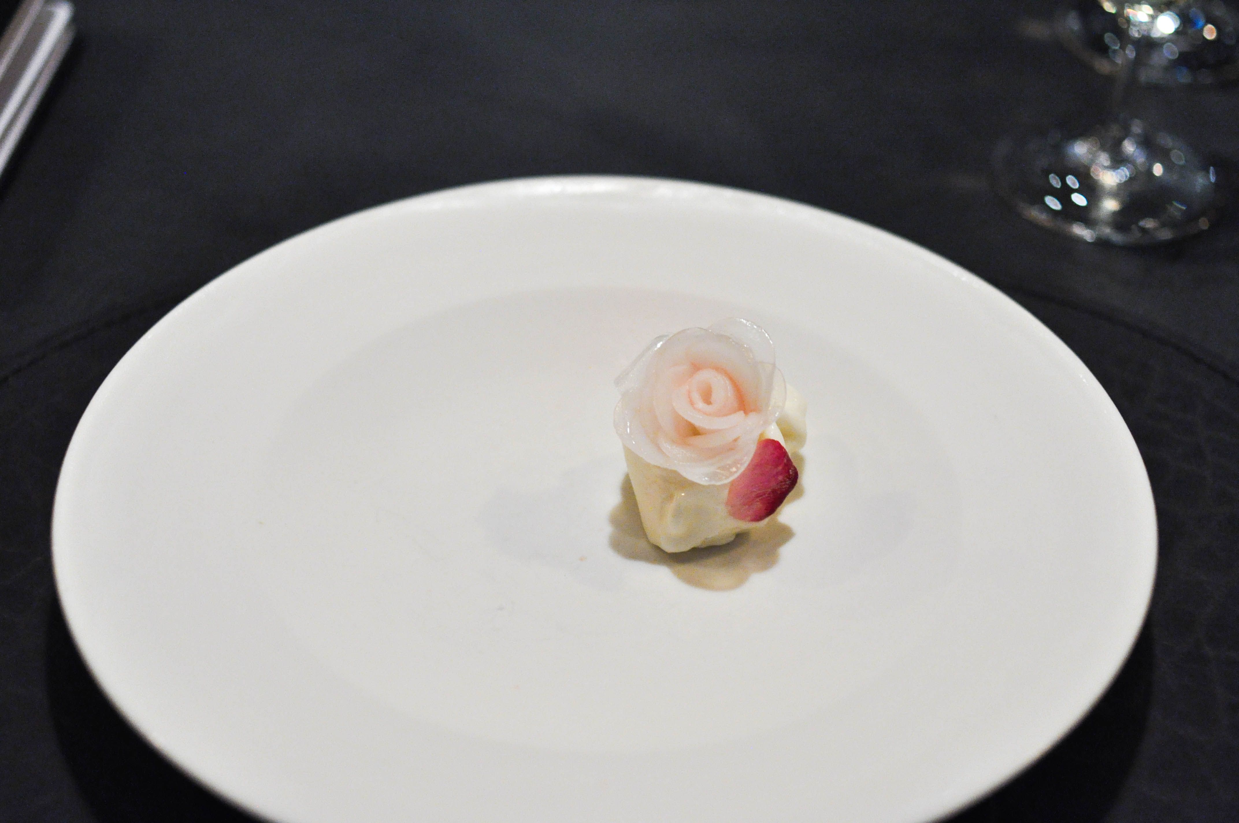 11th Course: White Rose. Sea Rose Mallow. Wildflower Sherbet. A beautifully presented flower made of rose water ice. The petals peeled off like a real rose, and had a pleasant floral flavor.