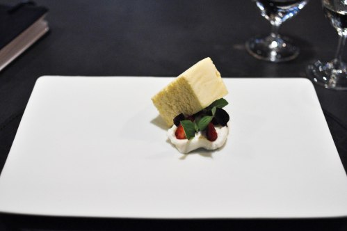 13th Course: Strawberry Shortcake. Cinnamon Basil. Wild Strawberries. Raw Milk Ice Cream. The shortcake batter was aerated and frozen and made for a fun take on the classic dessert. Some menthol-ish anise hyssop brightened and elevated the ice cream and fresh berries and left me feeling fresh and minty.