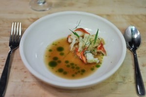 2nd: Lobster Consomme, Apple, Fennel. A chilled consommé with impressively strong lobster flavor, with poached lobster, Pink Lady apple granite, shaved fennel, and fennel fronds. Rocky thought the consommé was ‘Too Lobstery’, but I thought it was fantastic, especially set off by the herbaceous fennel. And I loved the scent it left on my lips.