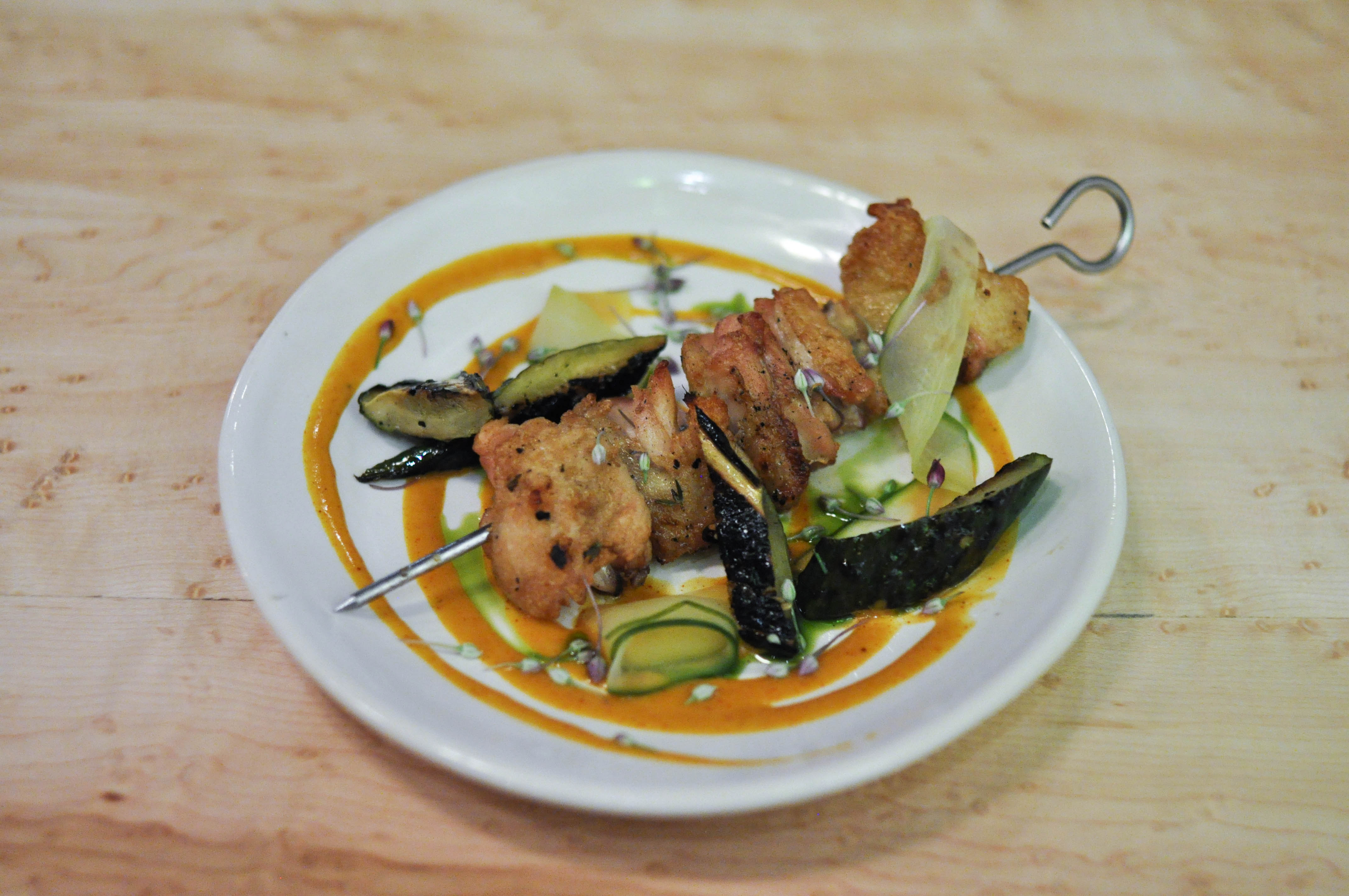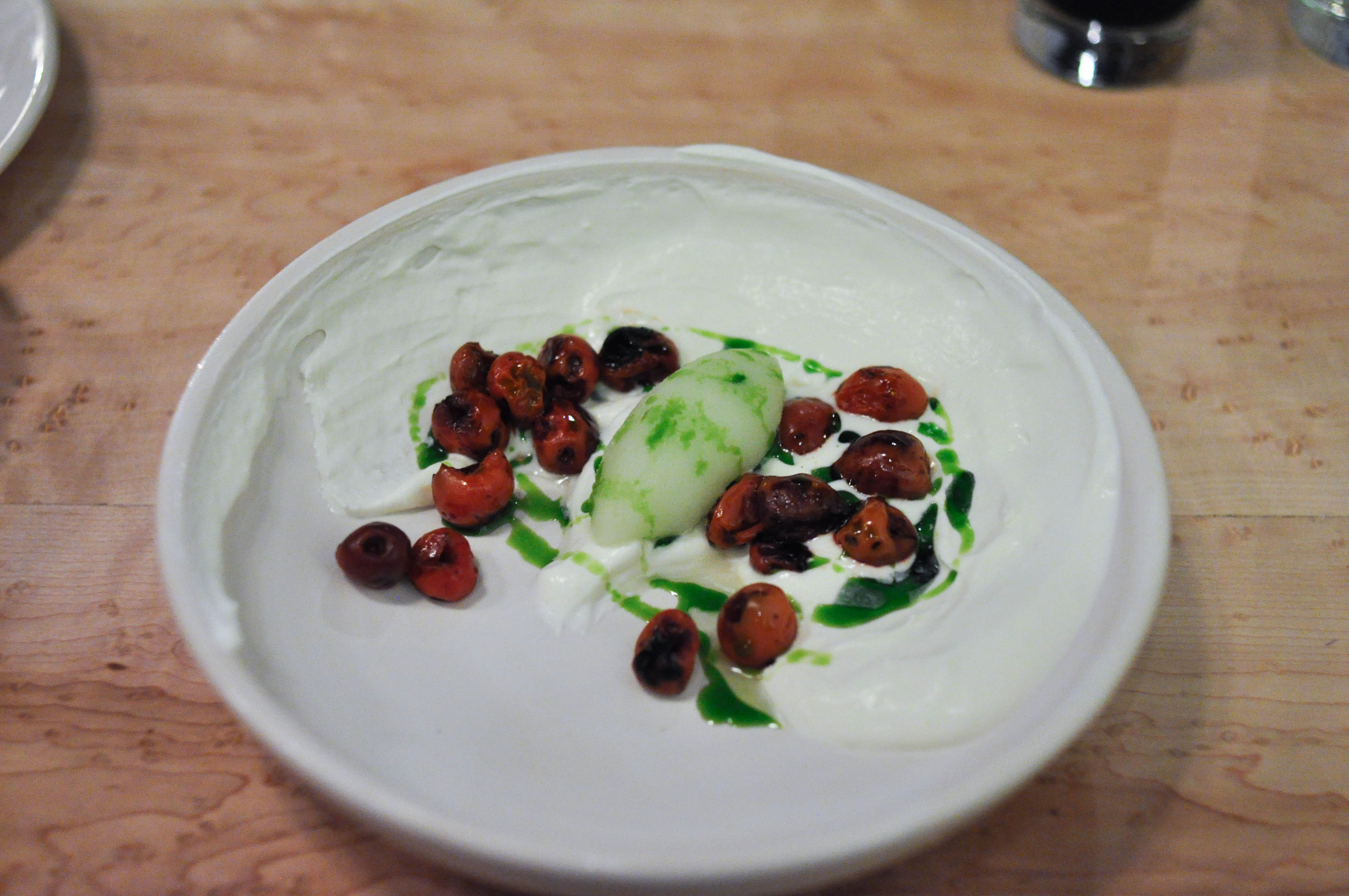 3rd: Grilled Chicken Wings, Cucumber, Thyme, Mustard Barbecue. Confit boneless chicken wings grilled ‘Japanese Style’ and plated with grilled and pickled cucumber, mustard bbq, and onion flowers. The sauce, which they called ‘South Carolina Style’, was a hit. I like the char-to-freshness ratio of the cucumbers. The onion flowers gave a potent, vegetal, allium spice. A fun play on a classic bbq dish, and a definite winner with my date.